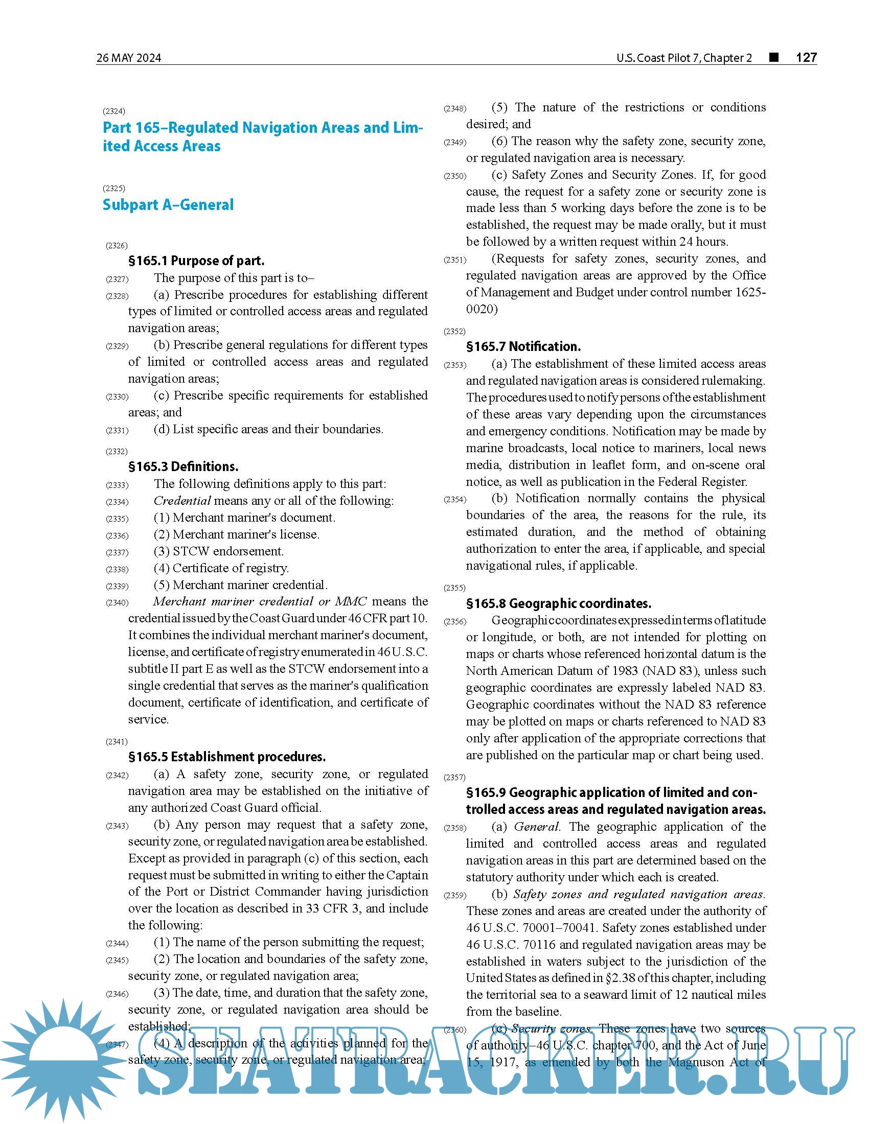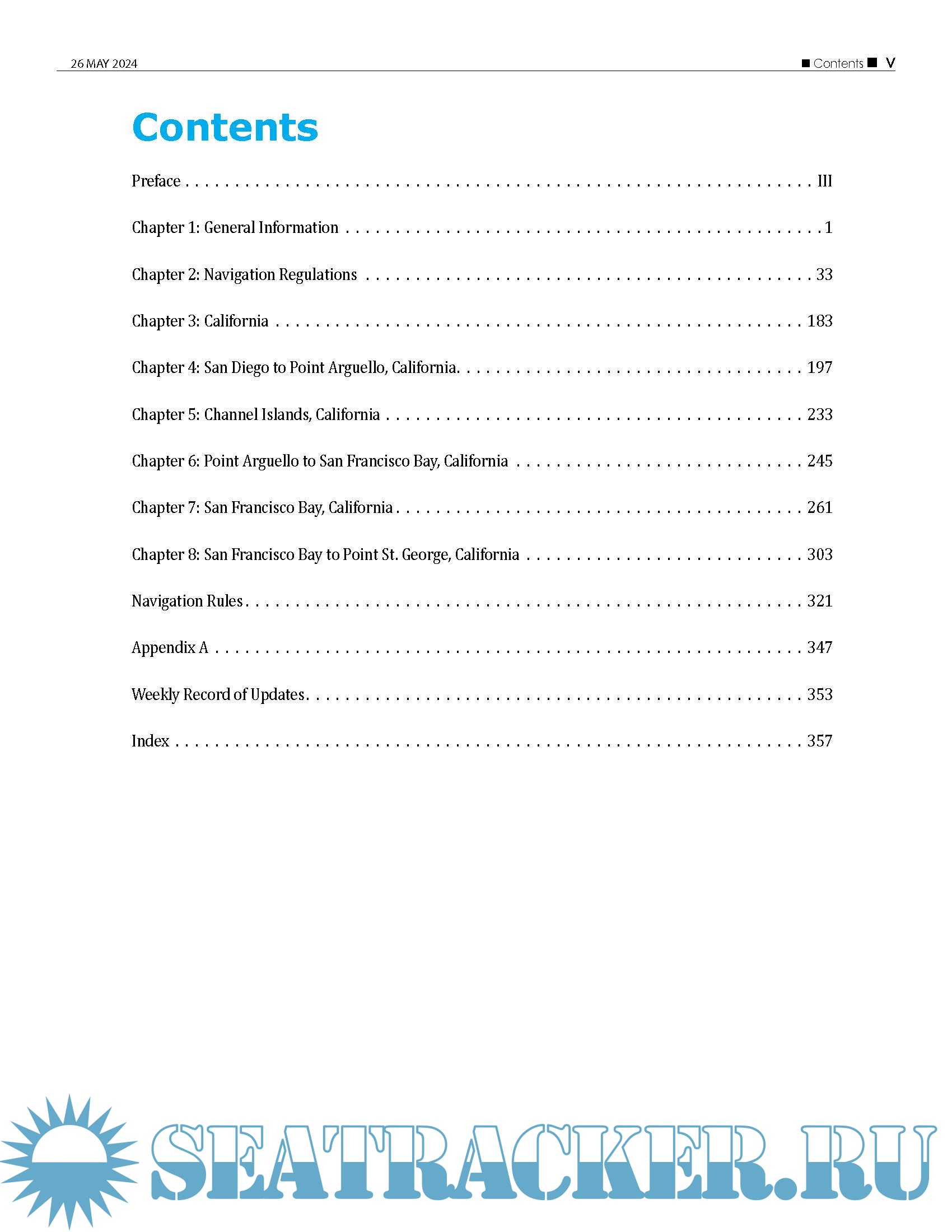 Year: 2024 Language: English Author: NOAA Genre: Documentation Edition: 2024 (56th) Edition Format: PDF Quality: eBook Pages count: 372 Description: The United States Coast Pilot® consists of a series of nautical books that cover a variety of information important to navigators of coastal and intracoastal waters and the Great Lakes. Issued in ten volumes, they contain supplemental information that is difficult to portray on a nautical chart. Topics in the Coast Pilot include channel descriptions, anchorages, bridge and cable clearances, currents, tide and water levels, prominent features, pilotage, towage, weather, ice conditions, wharf descriptions, dangers, routes, traffic separation schemes, small-craft facilities, and Federal regulations applicable to navigation. This edition cancels the 55th Edition and includes all previously published corrections. Updated upto 26 May 2023