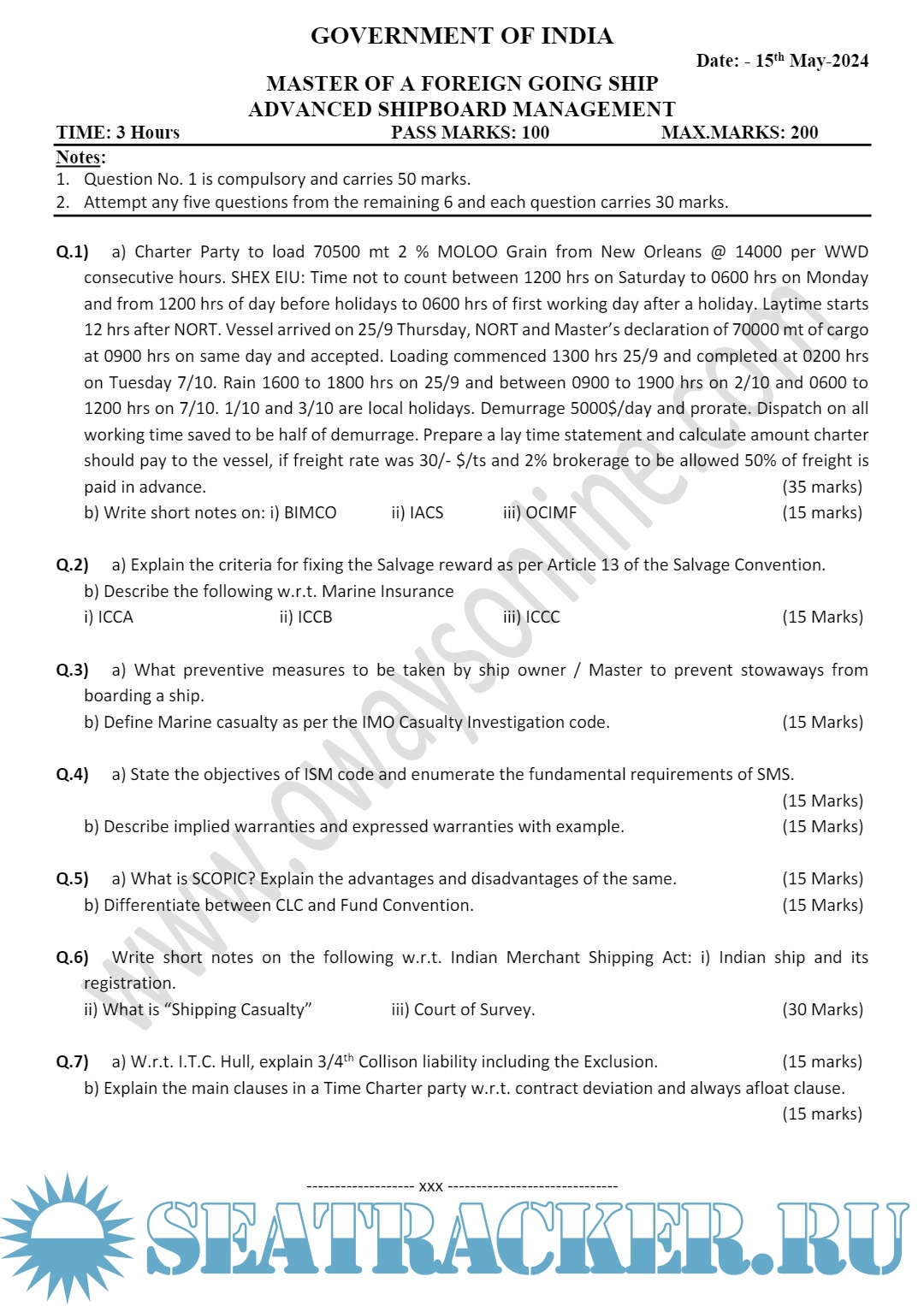 Question Paper Set for (ASM) Advanced Shipboard Management (May 2024) for Master's Examinations, Mercantile Marine Department (MMD), India