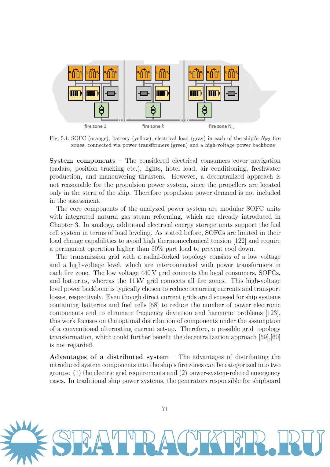 The decarbonization of the global ship traffic is one of the industry’s greatest challenges for the next decades and will likely only be achieved with new, energyefficient power technologies. To evaluate the performances of such technologies, a system modeling and optimization approach is introduced and tested, covering three elementary topics: shipboard solid oxide fuel cells (SOFCs), the benefits of decentralizing ship power systems, and the assessment of potential future power technologies and synthetic fuels. In the following, the analyses’ motivations, scopes, and derived conclusions are presented. SOFCs are a much-discussed technology with promising efficiency, fuel versatility, and few operating emissions. However, complex processes and high temperature levels inhibit their stand-alone dynamic operation. Therefore, the operability in a hybrid system is investigated, focusing on component configurations and evaluation approach corrections. It is demonstrated that moderate storage support satisfies the requirements for an uninterrupted ship operation. Depending on the load characteristics, energy-intensive and power-intensive storage applications with diverging challenges are identified. The analysis also emphasizes to treat degradation modeling with particular care, since technically optimal and cost-optimal design solutions differ meaningfully when assessing annual expenses. Decentralizing a power system with modular components in accordance with the load demand reduces both grid size and transmission losses, leading to a decrease of investment and operating costs. A cruise-ship-based case study considering variable installation locations and potential component failures is used to quantify these benefits. Transmission costs in a distributed system are reduced meaningfully with and without component failure consideration when compared to a central configuration. Also, minor modifications ensure the component redundancy requirements, resulting in comparably marginal extra expenses. Nowadays, numerous synthetic fuels are seen as candidates for future ship applications in combination with either combustion engines or fuel cells. To drive an ongoing technology discussion, performance indicators for envisioned system configurations are assessed in dependence on mission characteristics and critical price trends. Even if gaseous hydrogen is often considered not suitable for ship applications due to its low volumetric energy density, resulting little operating costs are accountable for its superior performance on short passages. For extended missions, fuel cells operating on methanol or ammonia surpass hydrogen economically.