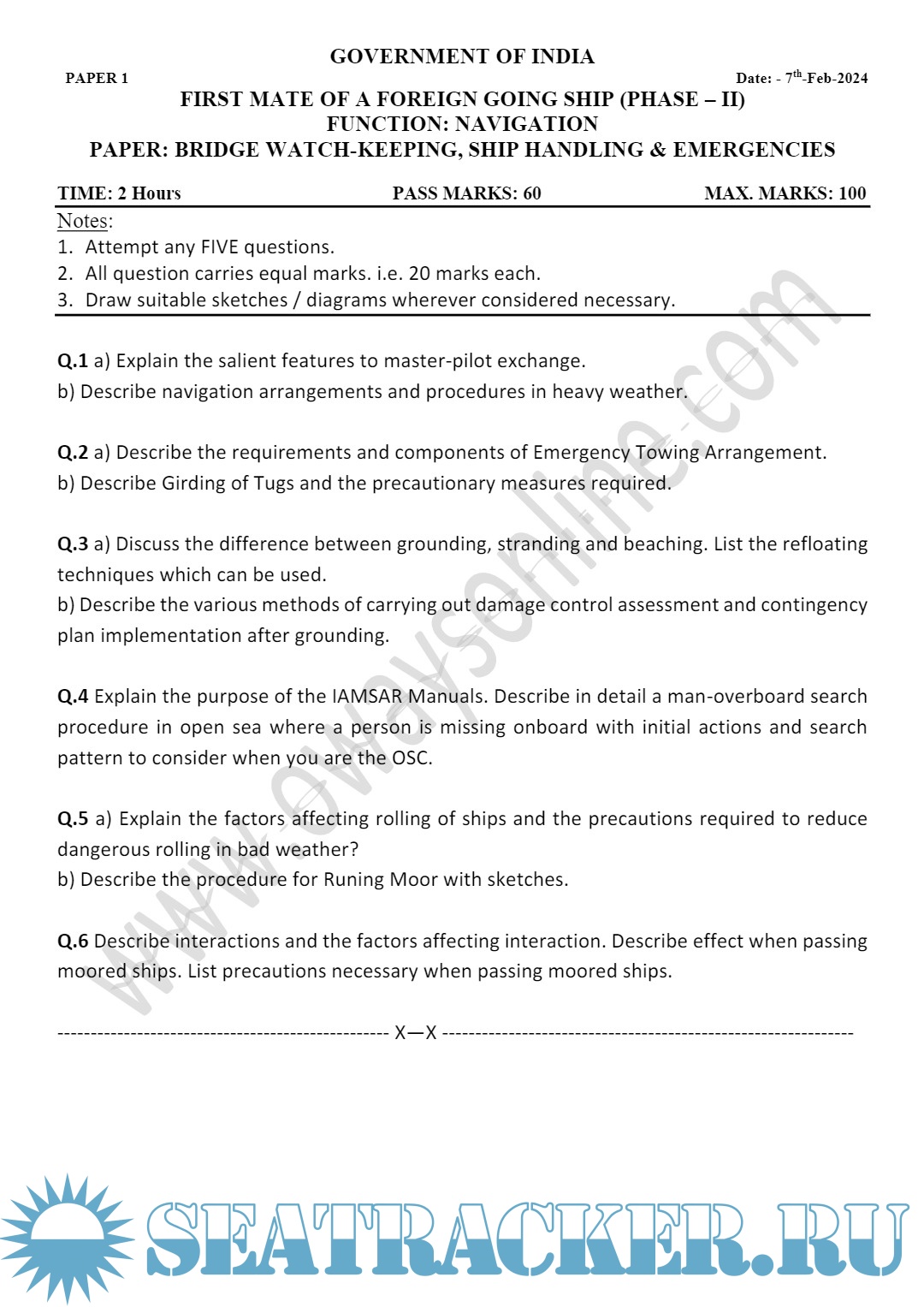 Question Paper Set (February 2024) Phase II (Chief Mate F.G.) Mercantile Marine Department (MMD),…