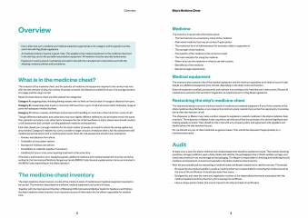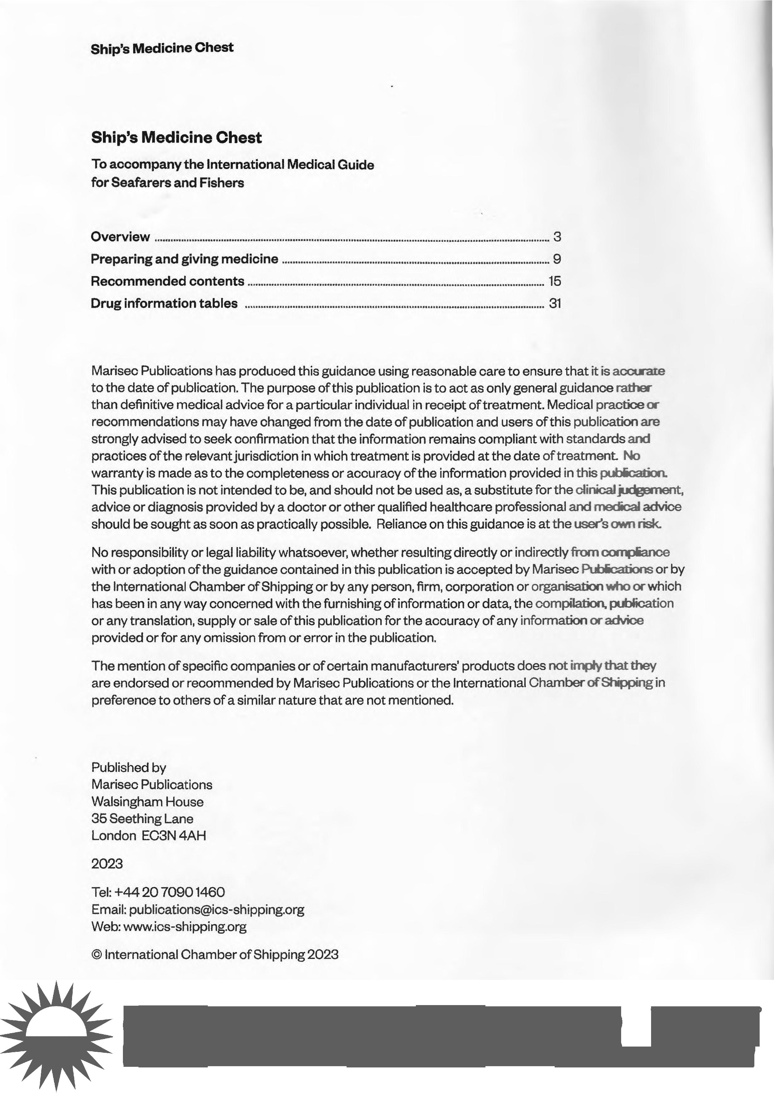 Year: 2023 Language: English Author: International Chamber of Shipping Genre: Guide Publisher: Marisec Publications Edition: 1 Format: PDF Quality: OCR with errors Number of pages: 58 Description: Ship's Medicine Chest To accompany the International Medical Guide for Seafarers and Fishers Marisec Publications has produced this guidance using reasonable care to ensure that it is accurate to the date of publication. The purpose of this publication is to act as only general guidance rather than definitive medical advice for a particular individual in receipt of treatment. Medical practice or recommendations may have changed from the date of publication and users of this publication are strongly advised to seek confirmation that the information remains compliant with standards and practices of the relevant jurisdiction in which treatment is provided at the date of treatment. No warranty is made as to the completeness or accuracy of the information provided in this publication. This publication is not intended to be, and should not be used as, a substitute for the clinical judgement, advice or diagnosis provided by a doctor or other qualified healthcare professional and medical advice should be sought as soon as practically possible. Reliance on this guidance is at the user's own risk.