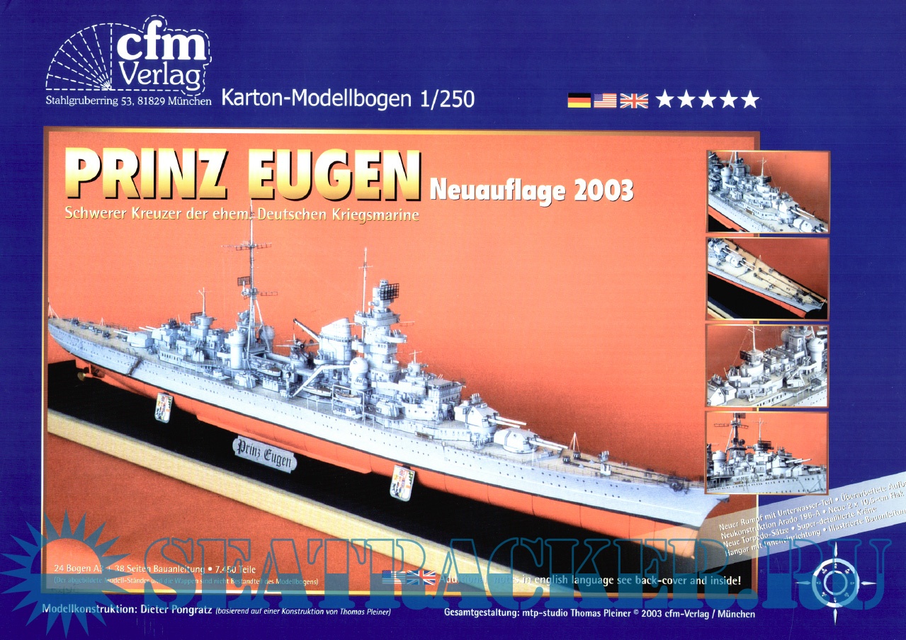 49 листов цветных выкроек и инструкций для изготовления бумажной модели тяжёлого крейсера DKM Prinz Eugen (Германия) в масштабе 1:250