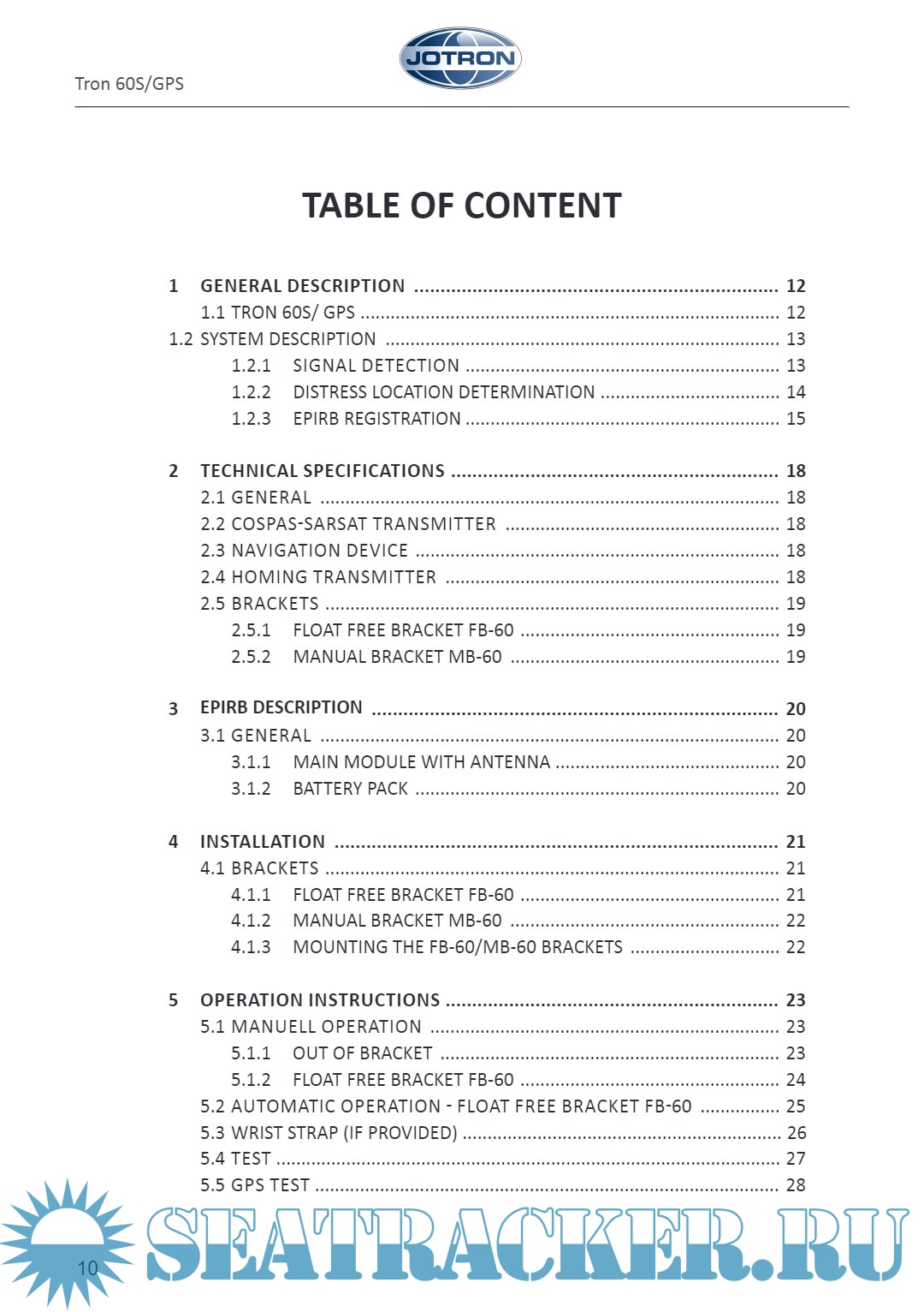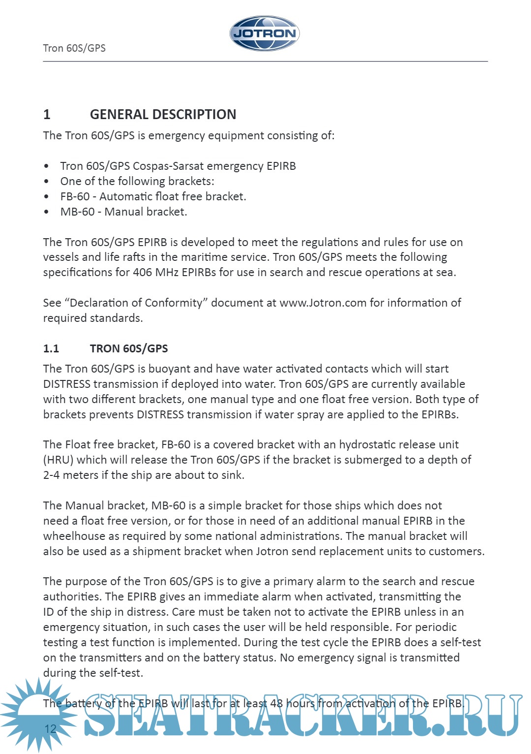 Description: This Operator's manual describes precautions, operations and troubleshooting of Jotron Tron 60 VDR Float Free EPIRB