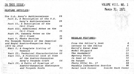 Year: 1971 Language: English Author: Edward C. Fisher (Editor) Genre: Periodical publication Edition: 1971-1 Format: PDF Quality: Scanned pages Pages count: 117 Description: From a small beginning in 1964, this quarterly journal has become internationally recognized as the most authoritative English-language publication in the warship field. Each issue averages 100 pages, with fact-filled articles, mainly but not exclusively the original work of our members. Subjects cover all navies and all types of ships from about 1860 to date, liberally illustrated with photographs which are highly praised for their quality, many of which have rarely been printed before, and with excellent line drawings and plans-a valuable resource for ship modelers.