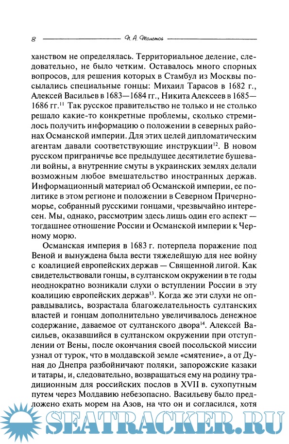 Описание: Эта публикация документов принадлежит перу П.А. Толстого, первого графа в этом семействе, пращура трех великих писателей и многих знаменитых деятелей российской культуры и государства. В 1707 - 1714 гг. он был первым в истории нашей страны постоянным послом в Османской империи. Его посольский дневник и донесения - интереснейшие материалы по истории Османской империи и русско-турецким отношениям того времени. Публикуемое здесь описание Черного моря и сведения о турецком флоте дают современному читателю представление о том, как Россия начинала осваивать этот регион и что он представлял собой в начале XVIII в. Это первое из известных нам описаний такого рода. Предлагаемые тесты издаются впервые.
