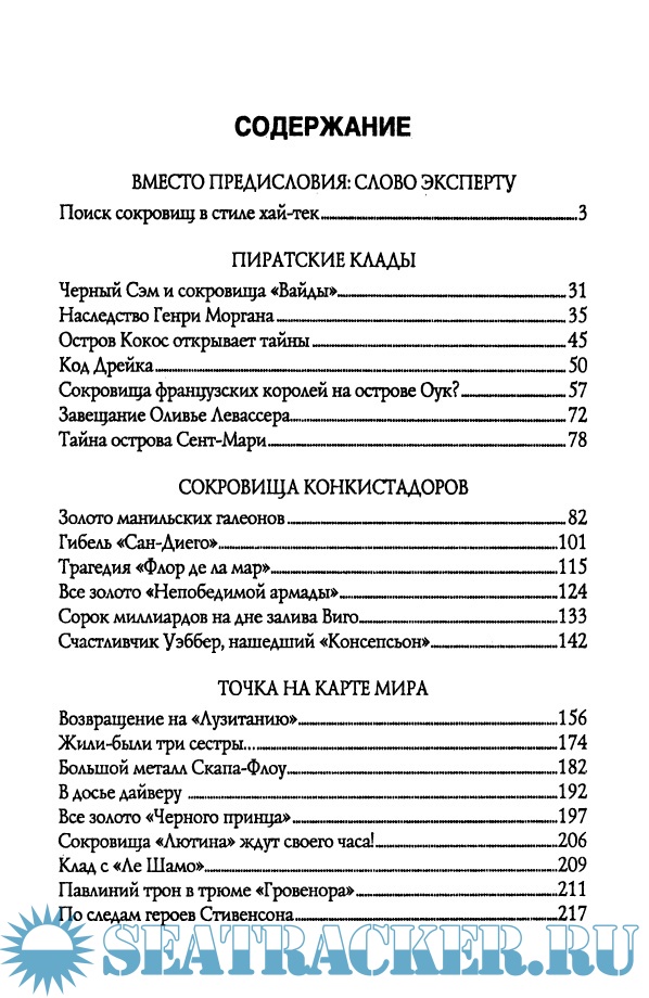 Вам откроют свои тайны острова Кокос и Сент-Мари; вы узнаете, сколько миллиардов лежит на дне залива Виго; проследите судьбу сокровшц с галеона Консепсьон и получите яркие впечатления вместе с охотниками за морскими кладами.