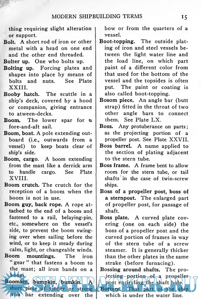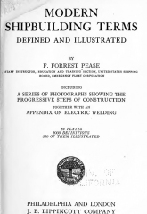 Year: 1918 Language: English Author: Pease F.F. Genre: Dictionary Publisher: Philadelphia and London J. B. Lippincott Co Format: PDF Quality: eBook Pages count: 254 Description: In this edition of "Modern Shipbuilding Terms Defined and Illustrated " an attempt is made to explain the more common words and phrases used in building a steel ship at the present time. The illustrations in nearly every case are taken from ships just built or now building, and the arrangement is such that, if studied in order, they will convey a fair idea of the modern system of shipbuilding.