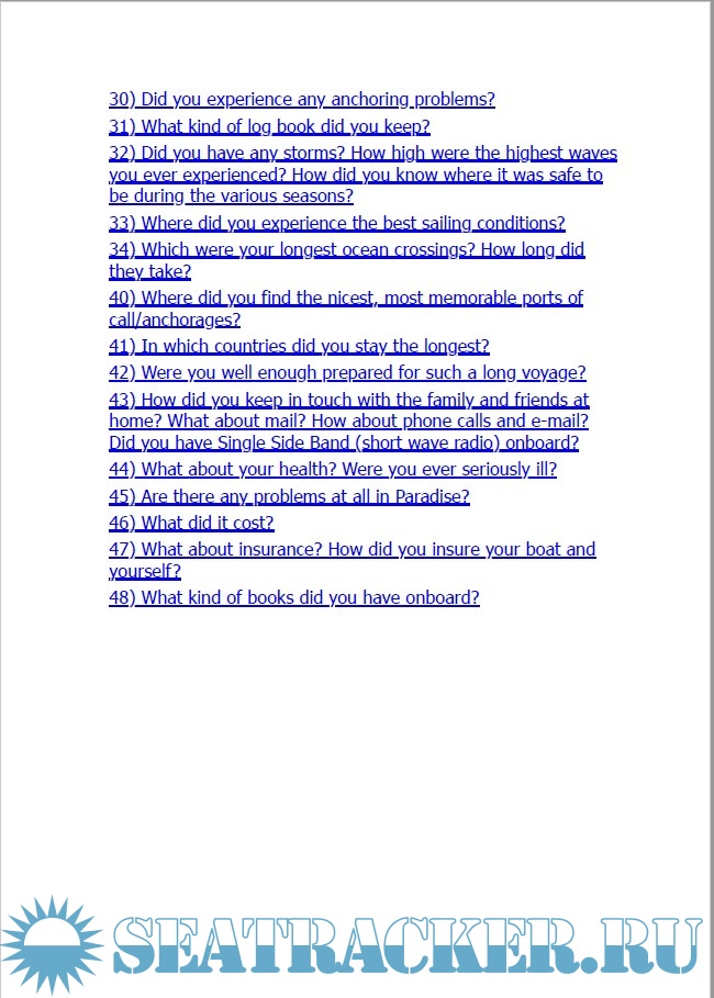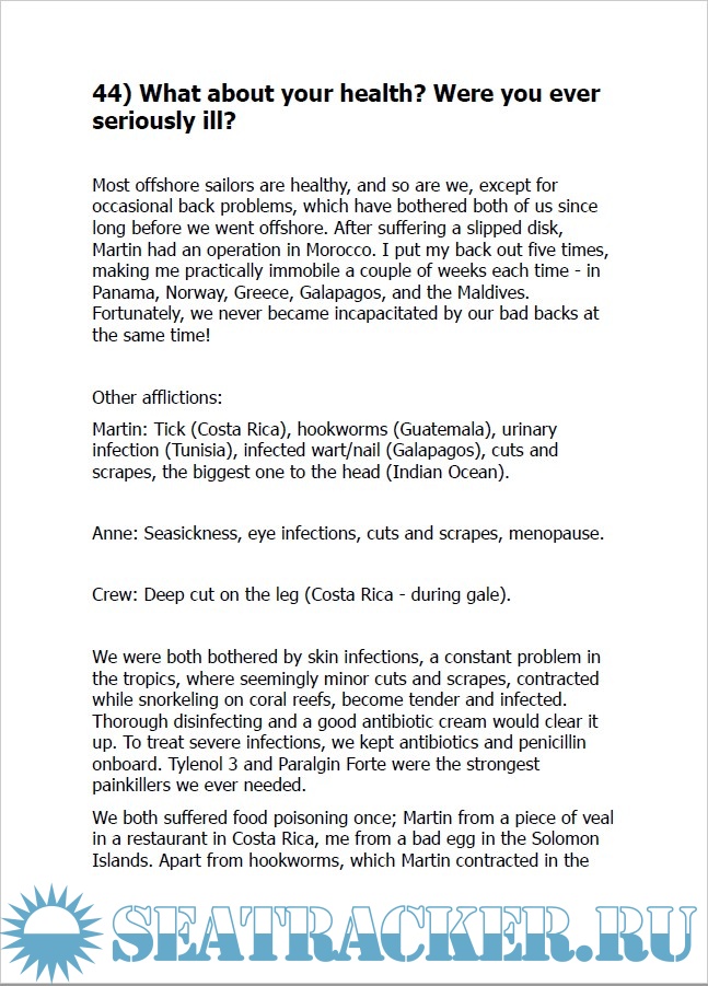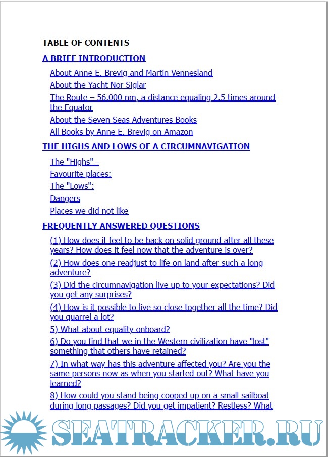Год выпуска: 2013 Язык: Английский Автор: Anne E. Brevig and Martin Vennesland Издание: 1 Формат: PDF Качество: Изначально компьютерное (eBook) Количество страниц: 106 Описание: At the peak of their careers, Anne Brevig and Martin Vennesland made the decision of their lives: they chose freedom and a highly uncertain future on the high seas instead of secure jobs and the safety and comfort of life ashore. In order to finance their dream, they sold their house and most of their belongings and moved onboard their 40-foot sailboat. It became their one and only home for 15 years. Neither imagined that they were going to spend 9 years on the 7 seas and journey more than 56,000 nautical miles! NOR SIGLAR’s blue water adventure is not about breaking any records. Its main focus is meeting people from different backgrounds and cultures - encounters that take on entirely different dimensions when sailing off the beaten track far away from the traditional tourist routes. “Why are you rushing through Paradise?” homesteaders on an exotic Robinson Crusoe island asked. The question became a motto for Anne and Martin during the rest of their voyage. Slowing down, they were able to establish personal contacts with locals. The book is saturated with enchanting encounters, unique experiences and drama. They also found that paradise still exists and can be explored. Anne and Martin have crossed the big oceans and visited 76 countries and island nations. They have realized their dreams. Now they hope that their book will inspire others to pursue their dreams - to dare to take the leap. It certainly gives a rare opportunity to live vicariously in NOR SIGLAR’S wake.