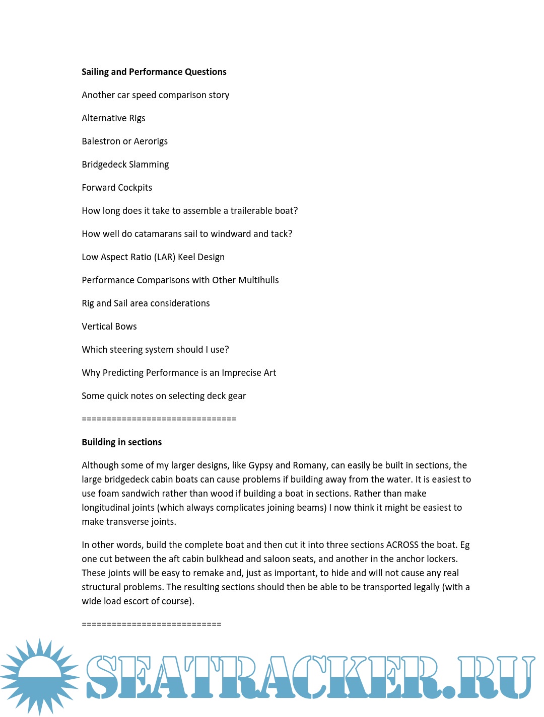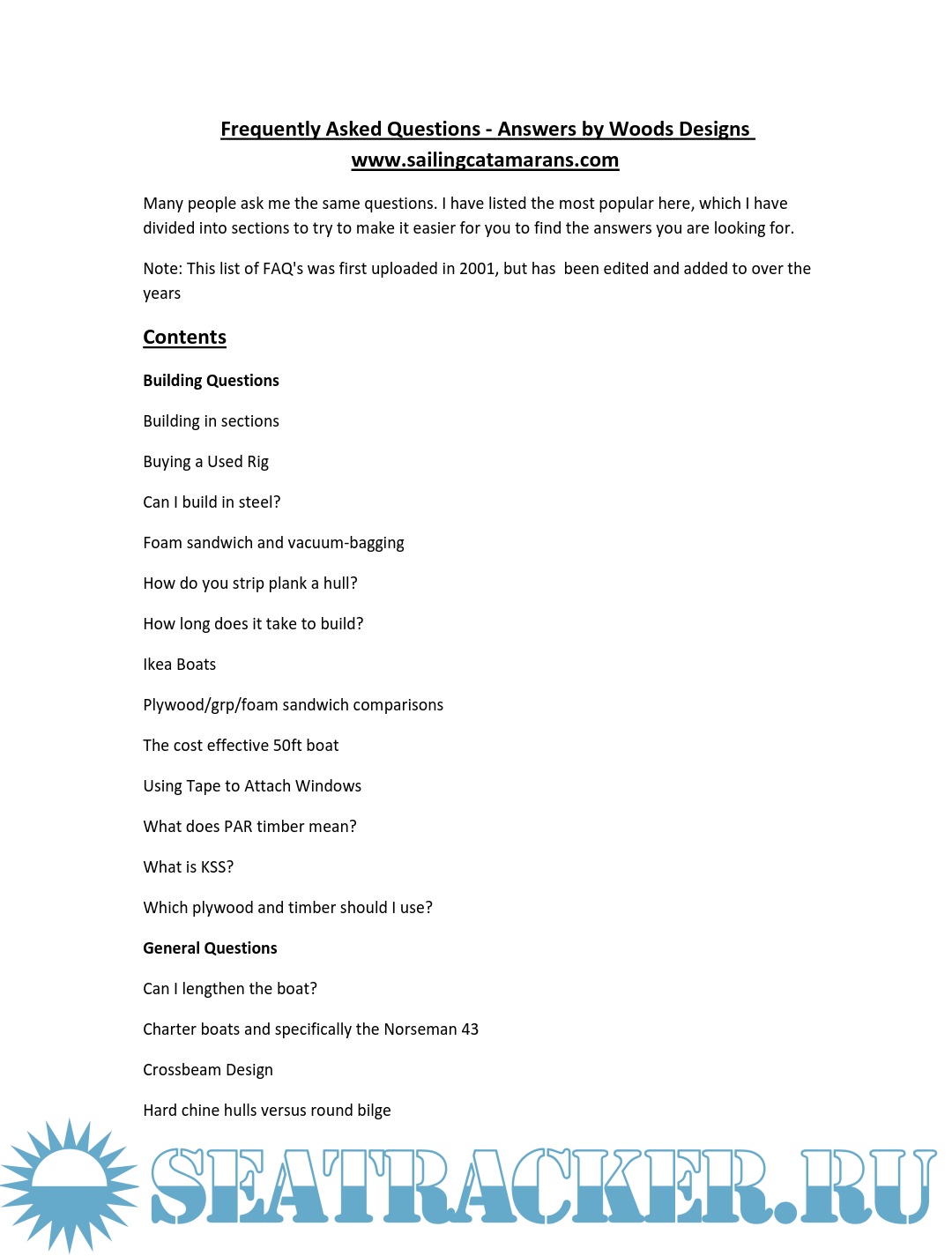 Year: 2024 Language: English Author: www.sailingcatamarans.com Genre: Manual Publisher: www.sailingcatamarans.com Format: PDF Quality: eBook Pages count: 60 Description: Many people ask me the same questions. I have listed the most popular here, which I have divided into sections to try to make it easier for you to find the answers you are looking for. Note: This list of FAQ's was first uploaded in 2001, but has been edited and added to over the years