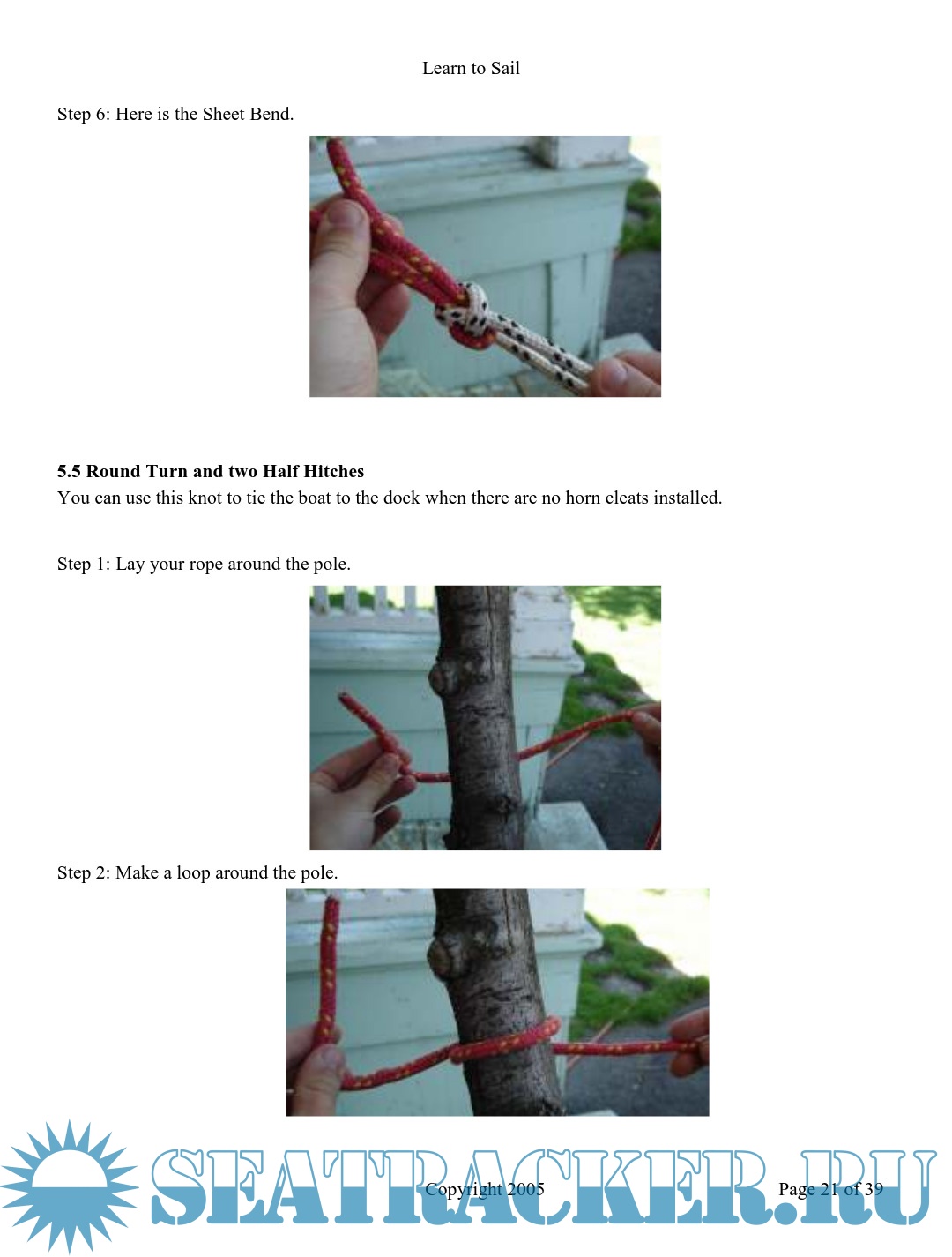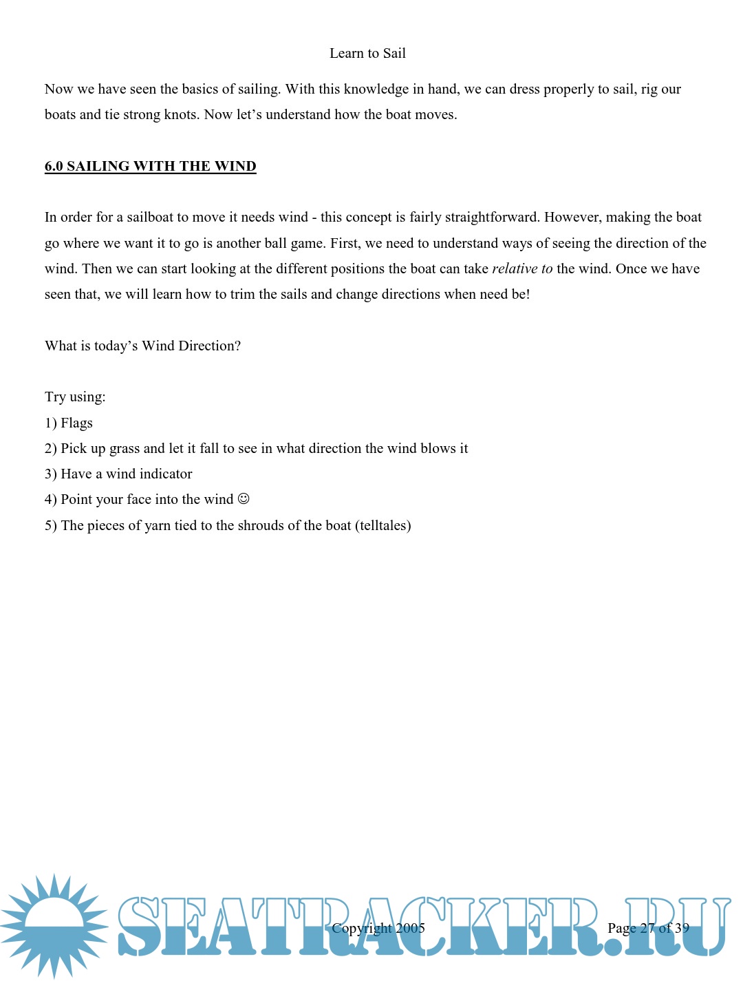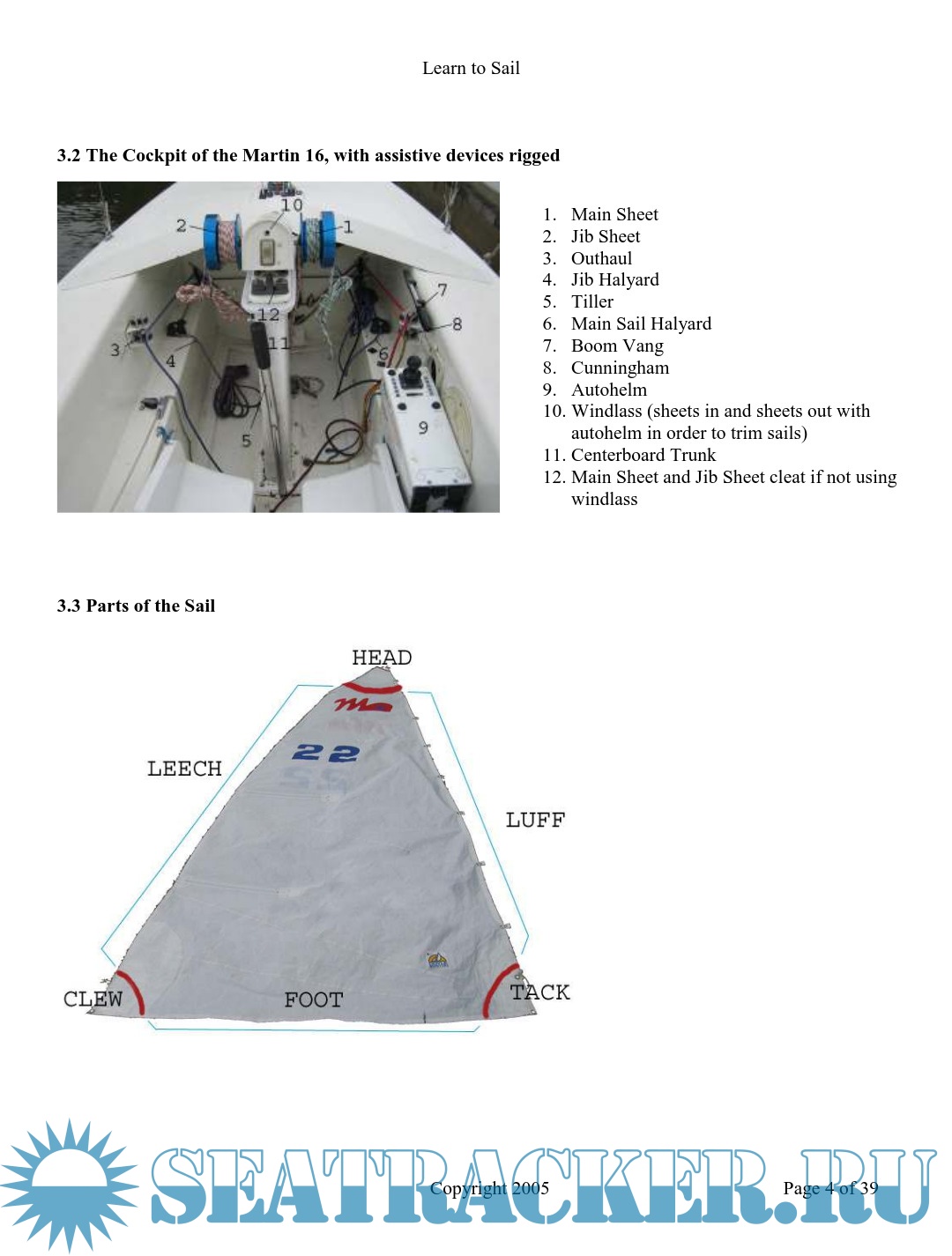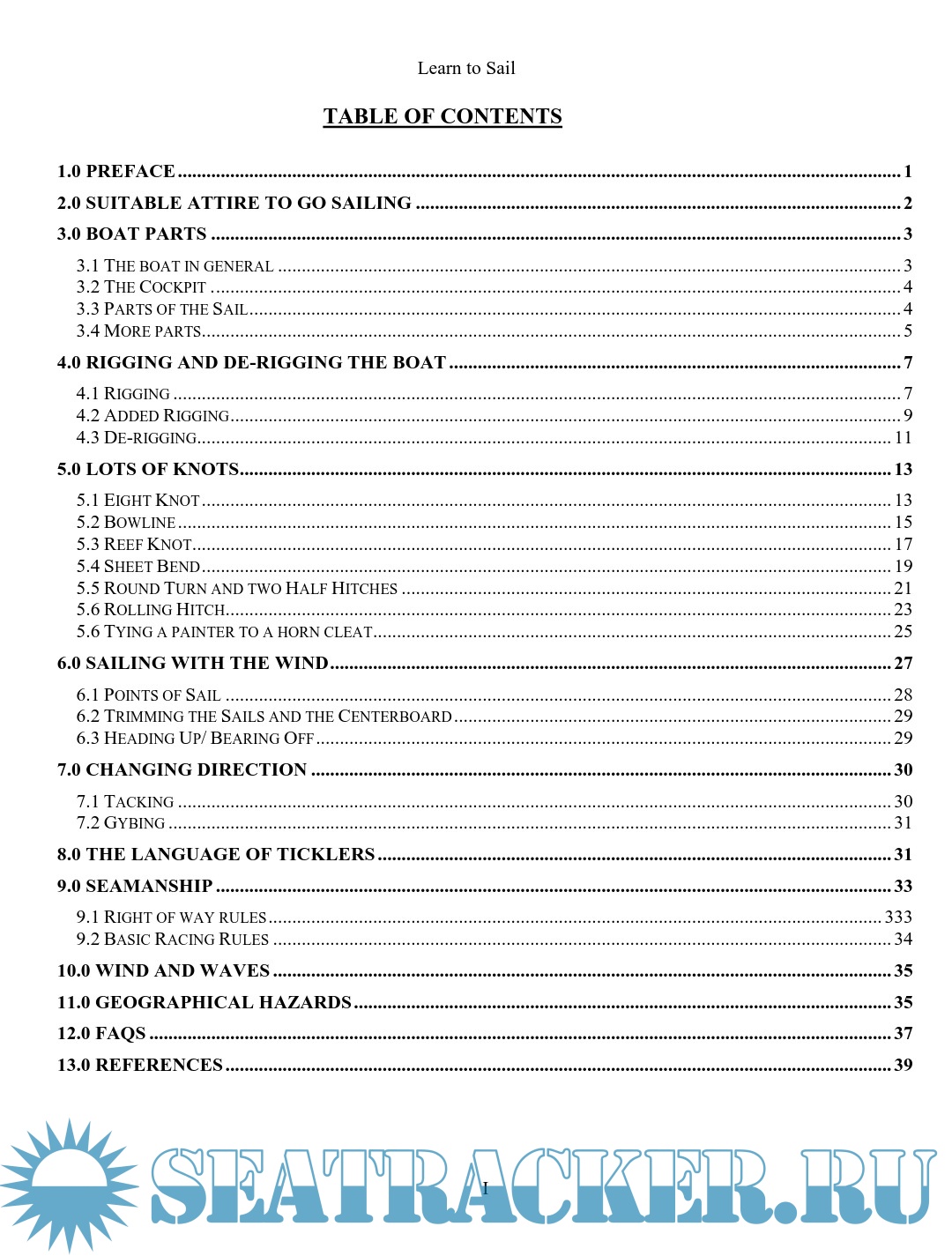 Year: 2010 Language: English Author: Boulva K, Roux-groleau J.- P. Genre: Manual Publisher: AQVA Format: PDF Quality: eBook Pages count: 42 Description: Welcome to the Martin 16 Learn to Sail theory! This booklet is designed to give you the basic tools you need to feel knowledgeable and comfortable as you explore the wonderful sport of sailing. To get started you will learn important tips on clothing and safety, as well as the parts of the boat and how to rig. You will also learn how to make knots to secure your boat’s ropes. Most importantly, you will learn how to navigate your boat by learning the different points of sail, how to change direction and the right of way rules. Lastly, a good sailor also needs to be aware of his surroundings and know how to read the weather. While the basics of sailing are applicable to any boat, this book takes into special consideration one of the most common accessible Learnto-Sail boats, the popular Martin 16. So what do you say? Let’s learn some fun.
