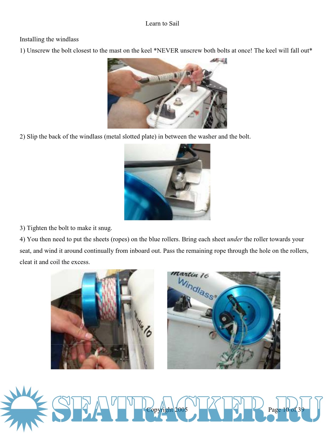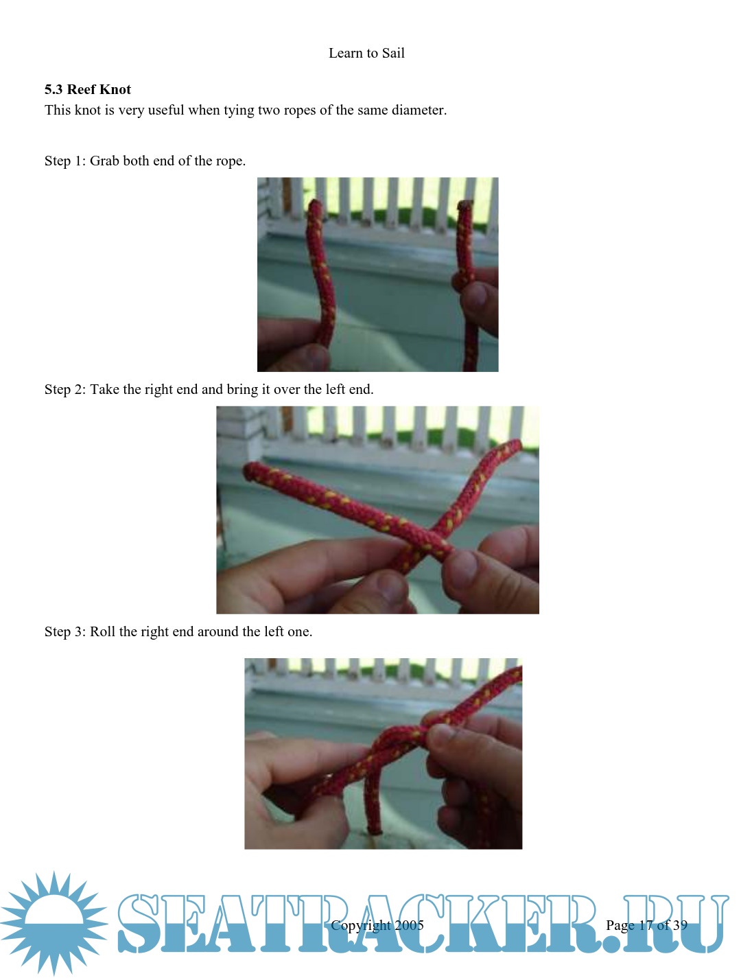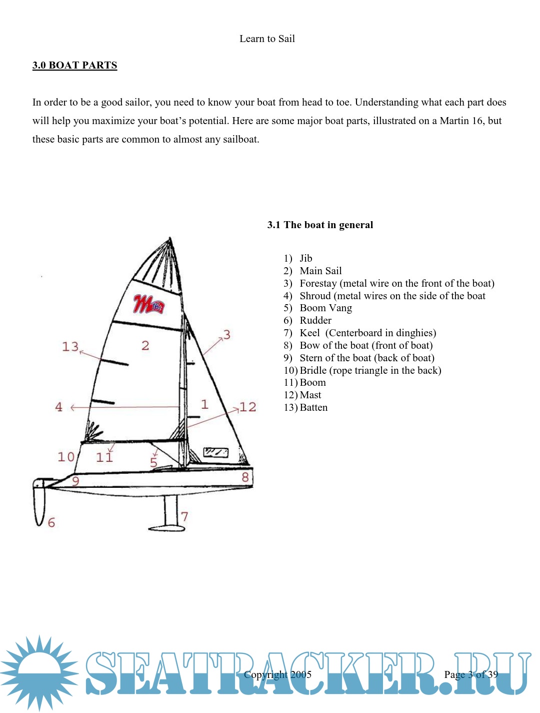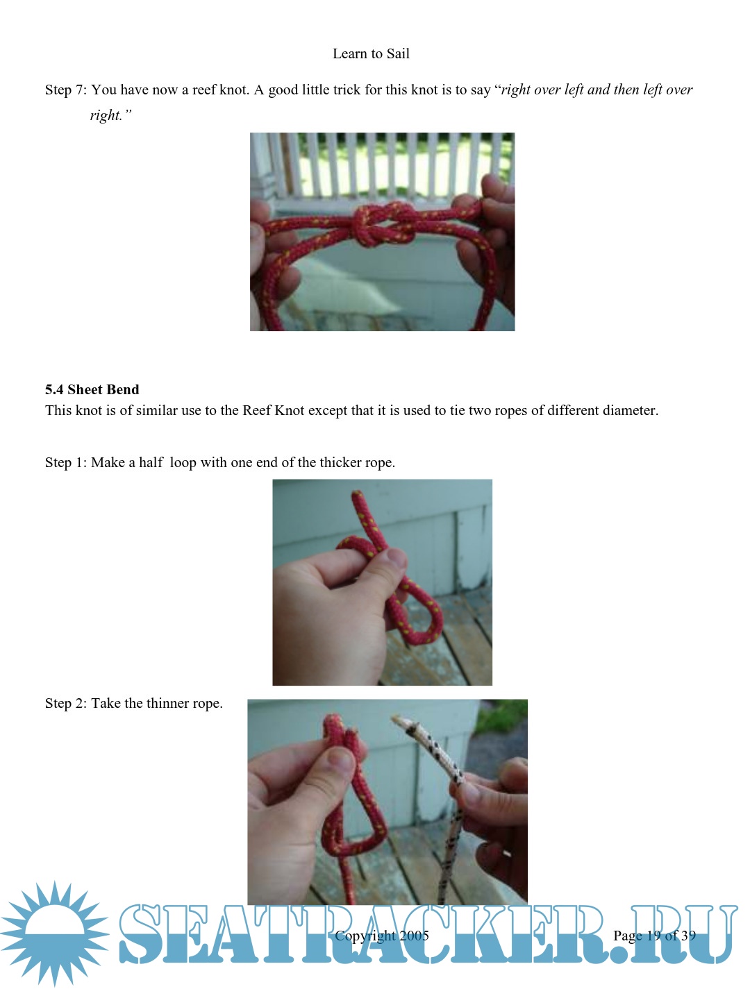 Year: 2010 Language: English Author: Boulva K, Roux-groleau J.- P. Genre: Manual Publisher: AQVA Format: PDF Quality: eBook Pages count: 42 Description: Welcome to the Martin 16 Learn to Sail theory! This booklet is designed to give you the basic tools you need to feel knowledgeable and comfortable as you explore the wonderful sport of sailing. To get started you will learn important tips on clothing and safety, as well as the parts of the boat and how to rig. You will also learn how to make knots to secure your boat’s ropes. Most importantly, you will learn how to navigate your boat by learning the different points of sail, how to change direction and the right of way rules. Lastly, a good sailor also needs to be aware of his surroundings and know how to read the weather. While the basics of sailing are applicable to any boat, this book takes into special consideration one of the most common accessible Learnto-Sail boats, the popular Martin 16. So what do you say? Let’s learn some fun.