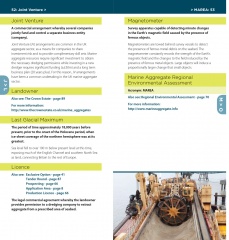 Description: Even those who work inside the marine aggregate industry are sometimes confused by the sheer range of technical terms used to describe its activities. As with most other industries, it also abounds with a host of acronyms. This glossary recognises the need for clarity amongst stakeholders who, to various degrees, interact with the industry. Our hope is that it will serve as a useful reference for regulators, government advisers and others.