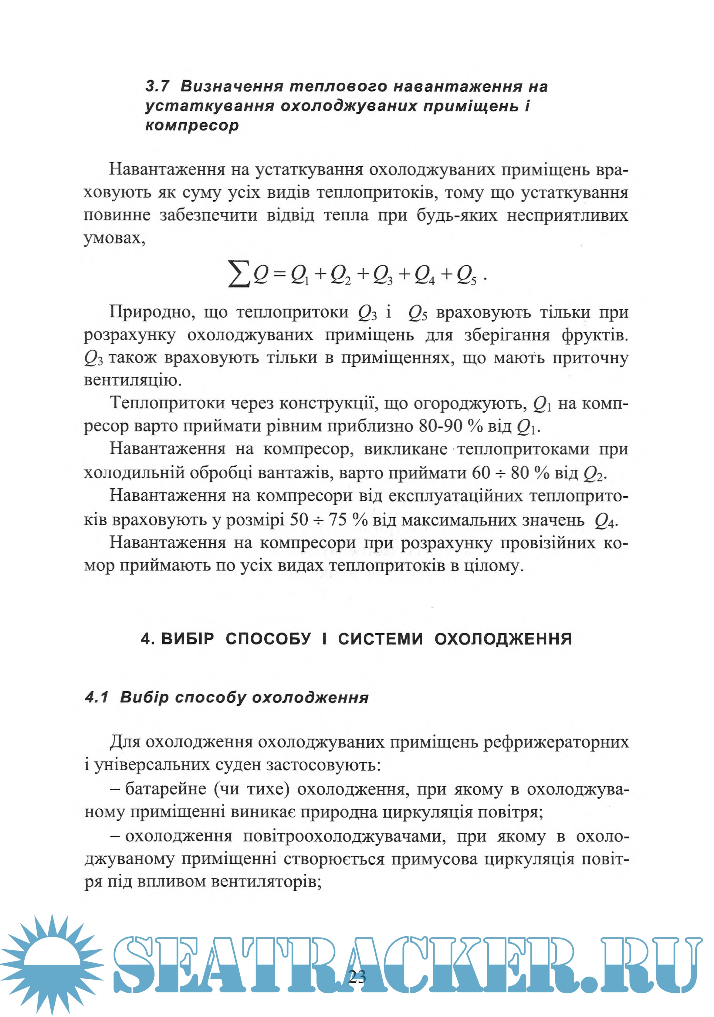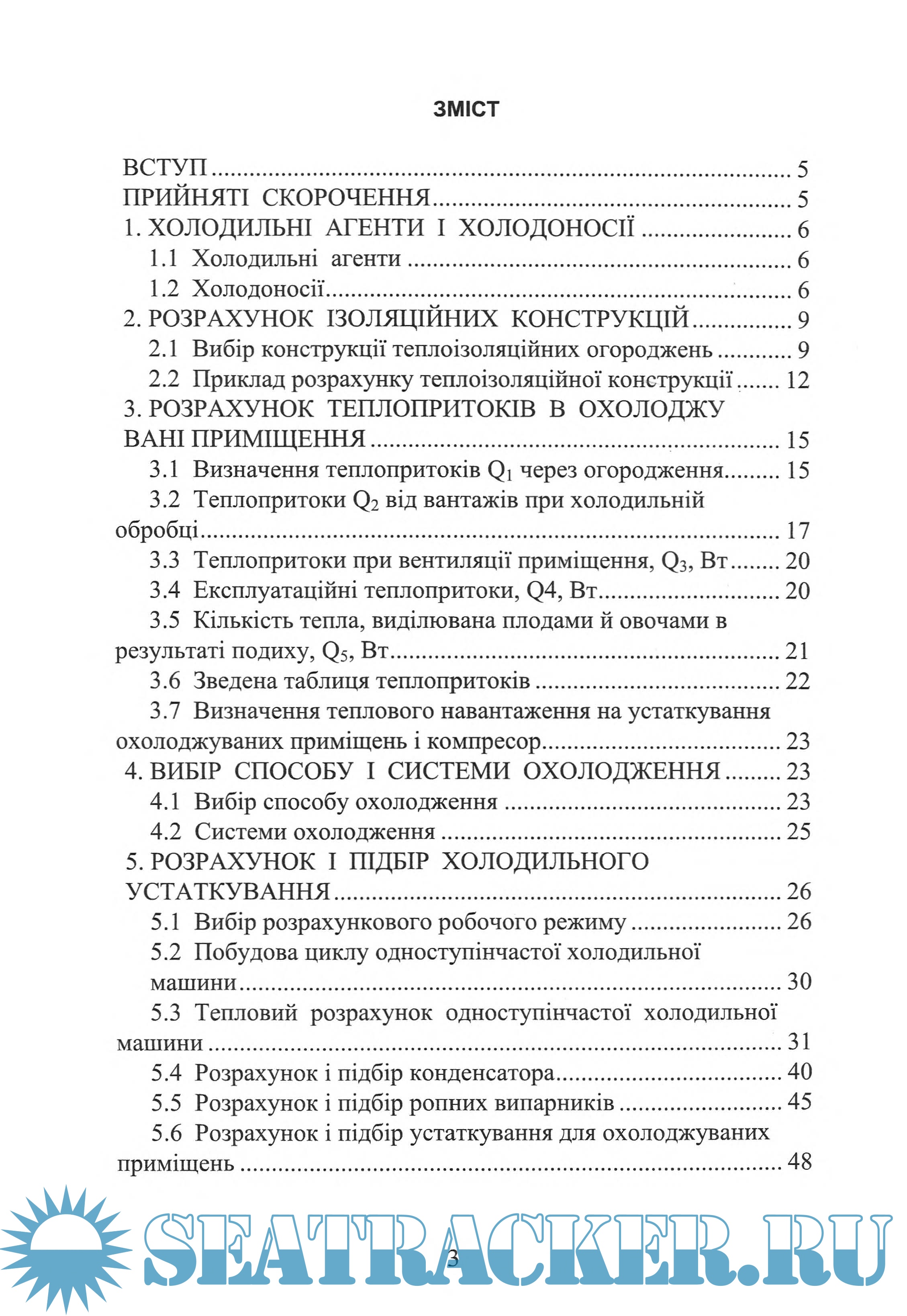 Розглядаються холодильні агенти і холодоносії, вимоги до них, фізичні властивості; вибір конструкції теплоізоляційних огороджень і визначення коефіцієнта теплопередачі для кожного ізольованого огородження з використанням його надалі при розрахунку теплопритоків в охолоджувані приміщення. Дано методику розрахунку теплопритоків і таблиці, куди зводять його результати. Дані також вибір способу і системи охолодження, після чого виконується розрахунок і підбір основних і допоміжних елементів холодильної установки, характеристики яких наводяться в таблицях. Розглянуто різні принципові схеми суднових холодильних установок.