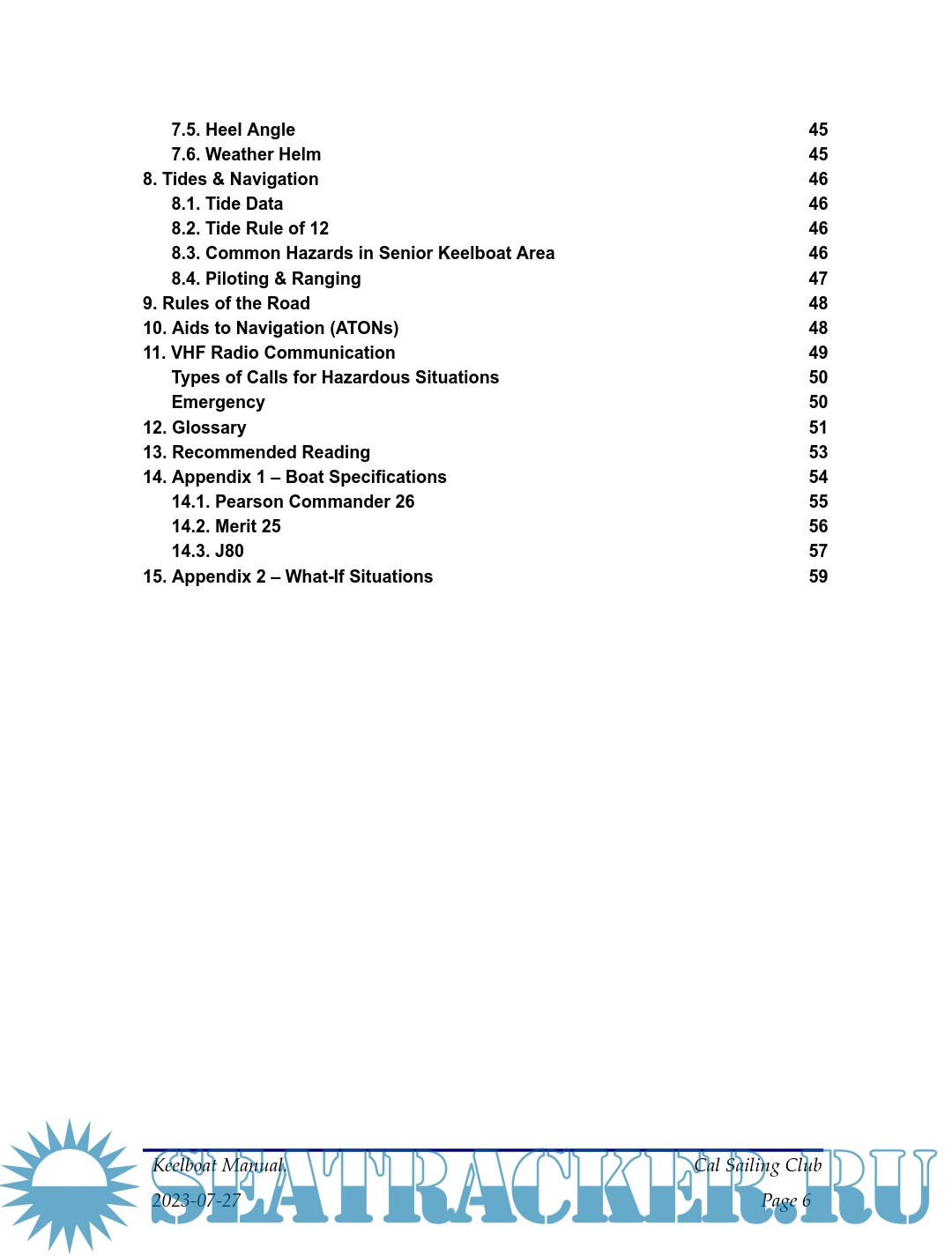 Year: 2023 Language: English Author: Burchik S. at all Genre: Manual Publisher: Cal Sailing Club Format: PDF Quality: eBook Pages count: 61 Description: So you’ve been messing about in dinghies for a while and have your Junior rating and you feel it’s time to start sailing on the keelboats. This is intended to be a guide to get you started, and also as a reference as you go through the CSC keelboat lesson series or when geęing private instruction. The material covered in this manual will continue to build on the basics learned in dinghies, with aęention called to some of the big differences between the two. A keelboat is slower to respond, has a greater turning radius and, with a large mass, momentum will be a big factor in how the boat behaves. The fundamentals are not going to be covered here, as they are thoroughly discussed in Colgate and other basic sailing books listed at the end of this manual. The most important skills to be learned are: recognizing what the boat will be doing before it happens and planning maneuvers before executing them. Having a thorough understanding of basic sail mechanics will also be a good starting point for learning to sail keelboats.