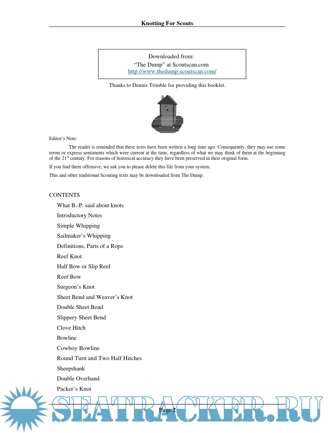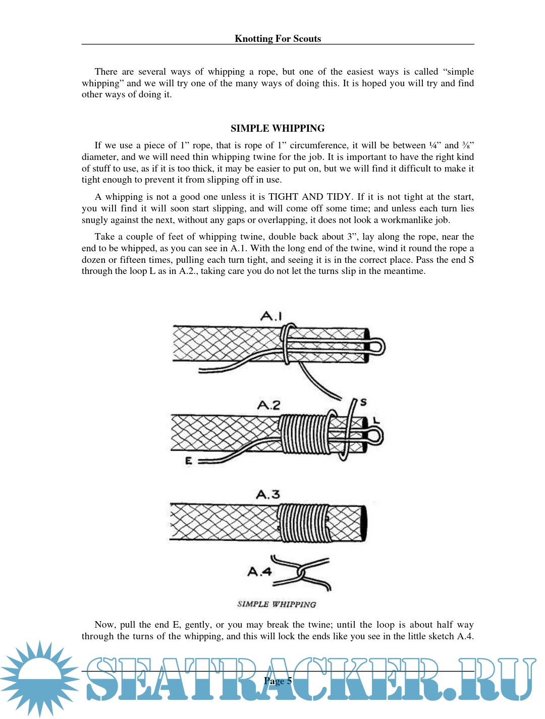 Description: This document provides instructions for tying several basic knots that are required as part of Boy Scout proficiency tests. It begins with an introduction to the importance of knot tying and some of Baden-Powell's thoughts on the topic. It then provides step-by-step instructions on how to perform a simple whipping to prevent rope ends from unraveling, which is part of the Tenderfoot level testing requirements. Additional knots that are covered for Tenderfoot level include the reef knot, sheet bend, clove hitch, bowline, round turn and two half hitches, sheepshank, and double overhand.