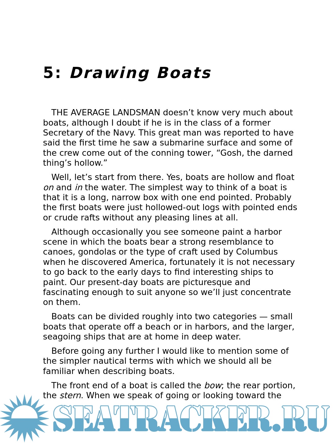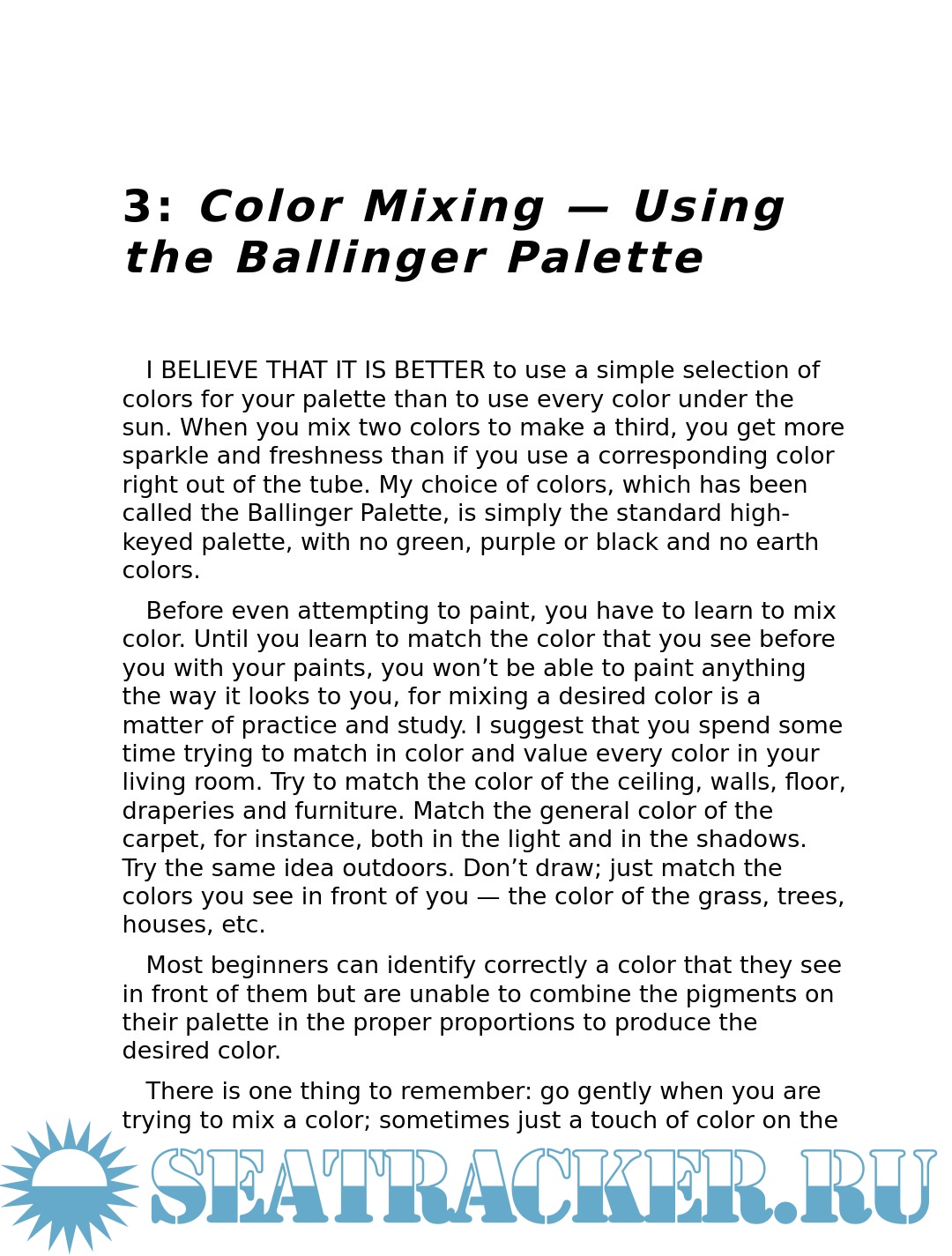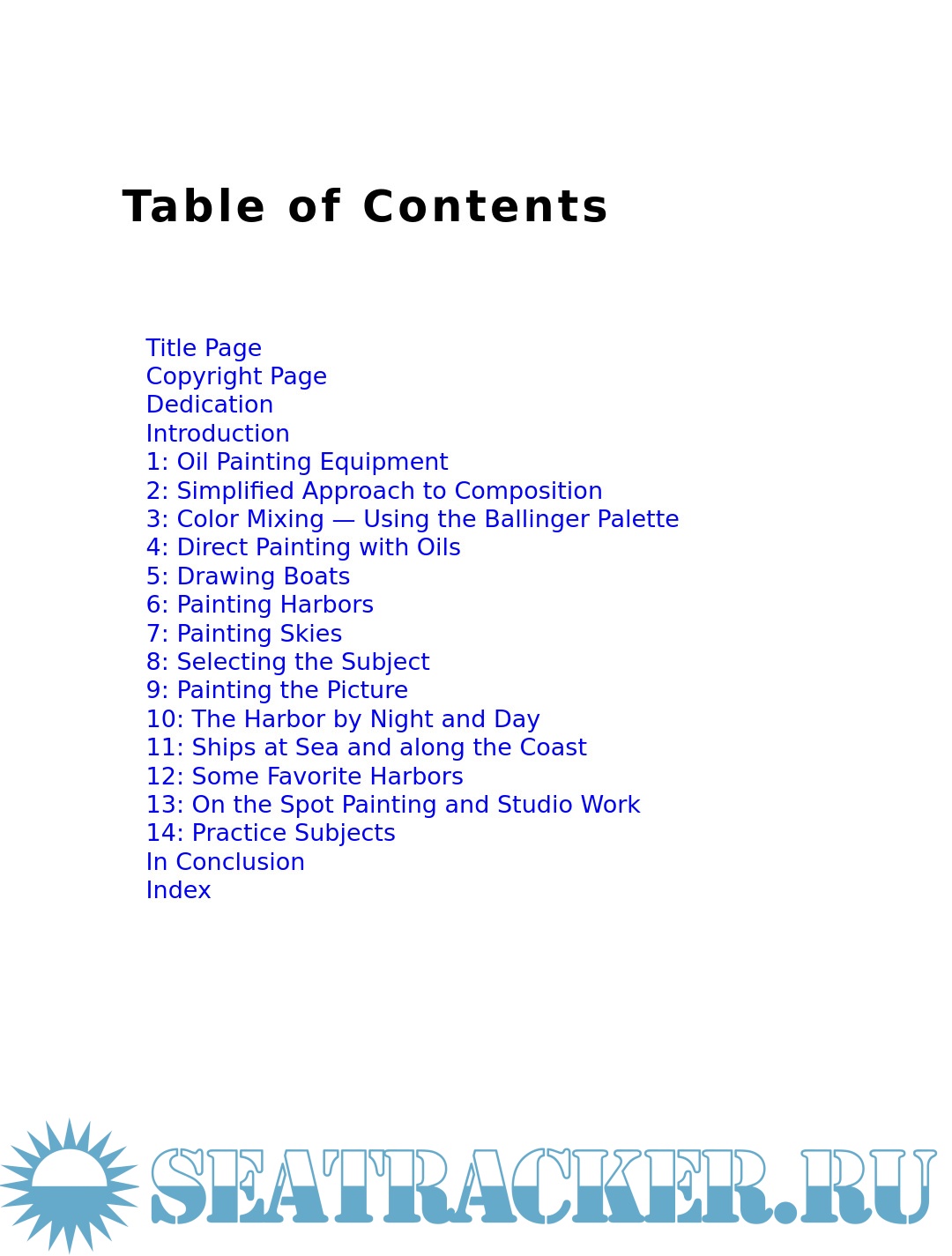Year: 2008 Language: English Author: Ballingtr H.R. Genre: Art Publisher: Dover Publications Format: PDF, EPUB Quality: eBook Pages count: 129 Description: Artists who love the sea and dream of capturing every aspect of its beauty will treasure this lavishly illustrated guide to painting boats, skies, and picturesque harbors. Written by an award-winning artist and teacher with decades of experience in the genre, this step-by-step guide covers every topic from art materials and equipment through composition and painting techniques. Seasoned artists and novices alike will appreciate the author's simple, yet authoritative style. In clear, nontechnical language, he discusses the structure of boats, offers advice on choosing a subject to paint, and shows how to avoid the pitfalls that can await painters of the sea. On its own, or as a companion volume to Ballinger's Painting Surf and Sea, this volume will inspire any artist with the desire to produce beautiful seascapes. Includes eighty-five black-and-white illustrations and an eight-page insert with nine color illustrations.