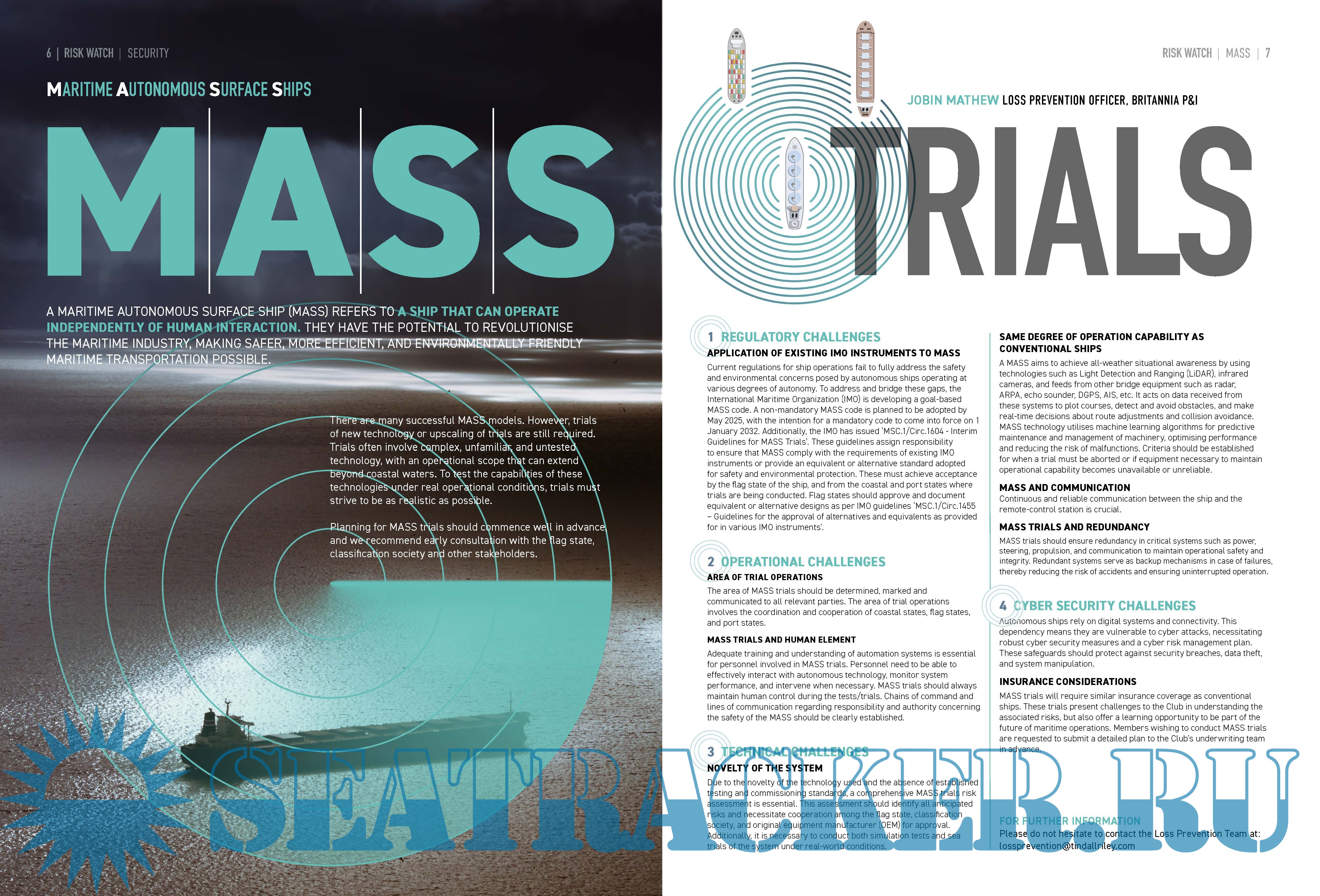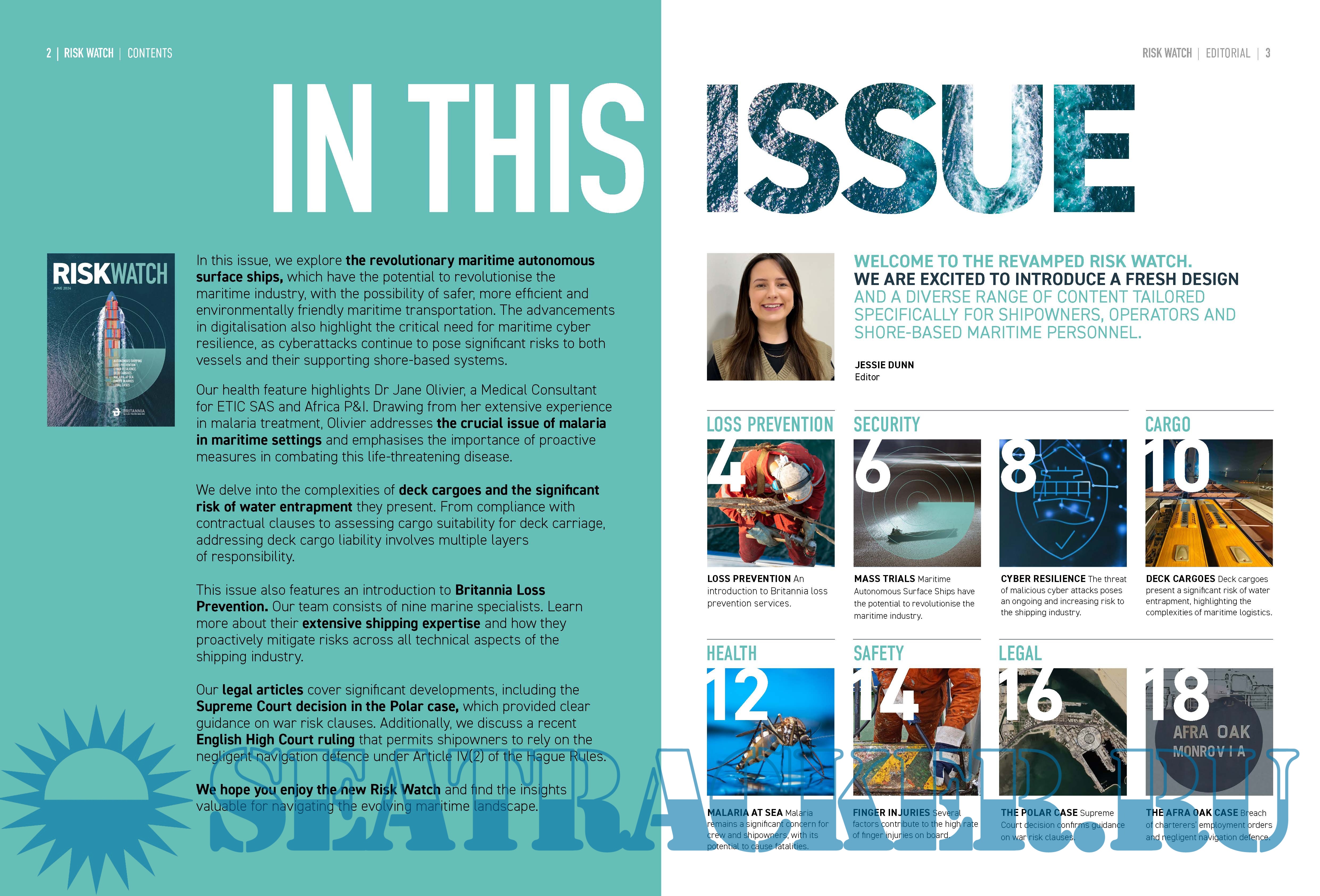 Description: The edition of Risk Watch published in June, 2024 by Britannia P&I Club. In this issue...Autonomous Shipping, Loss Prevention, Cyber Resilience, Deck Cargoes, Malaria at Sea, Finger Injuries and Legal Cases and much more.