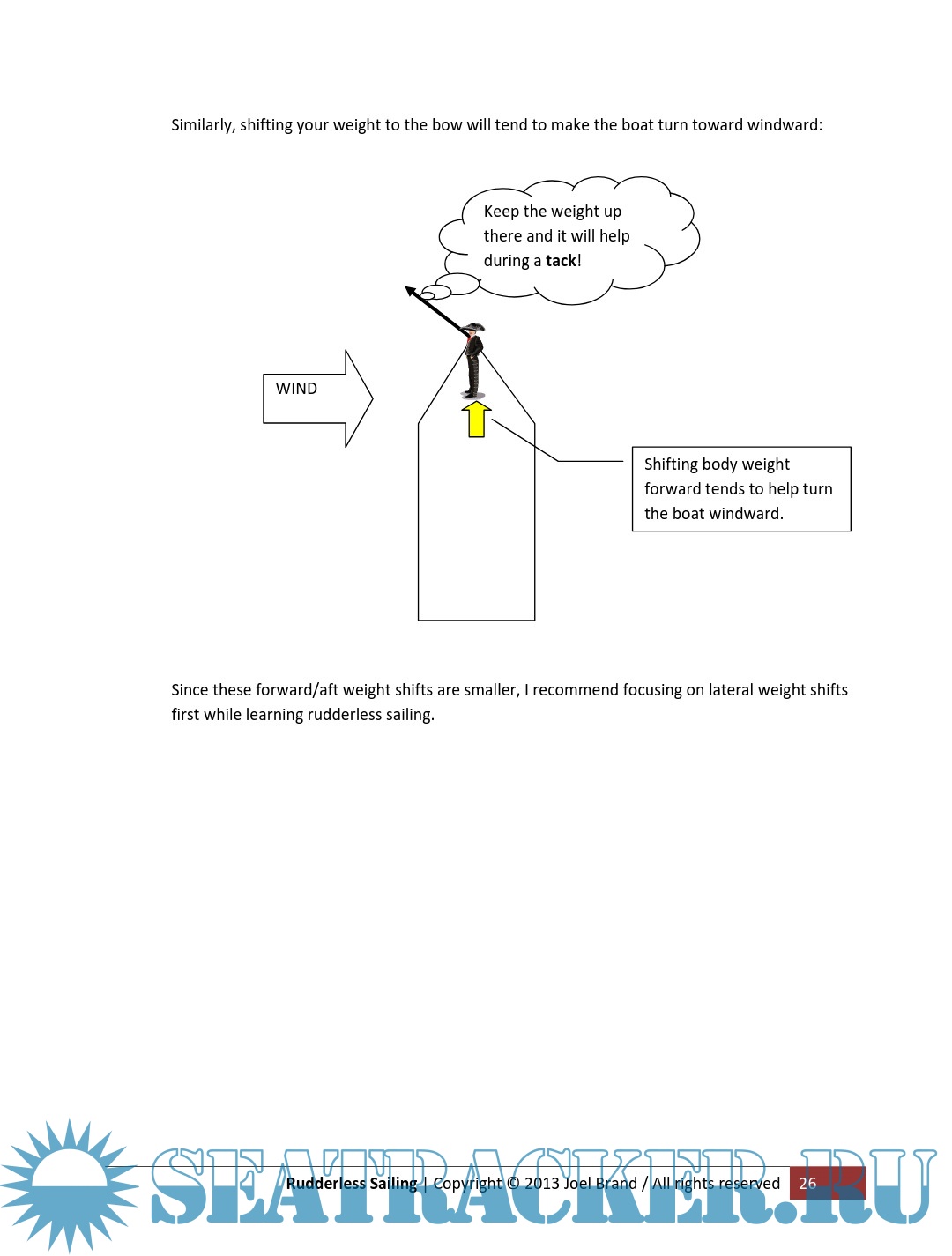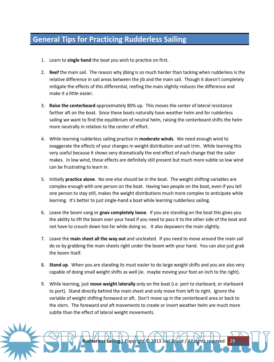 Description: A proficient and efficient sailor masters the technique of sailing their boat when the control mechanisms are limited. Rudderless sailing is using weight distribution and sail trim, as opposed to the rudder, to control the boat. Understanding rudderless sailing allows you to sail faster, make quicker turns, handle rudder failure emergencies, and is - simply put - very impressive to watch. This eBook thoroughly covers the motivations, physics, sail trim techniques, weight distribution concepts, and a practical step-by-step guide to learning to sail rudderless. After reading this eBook you will be able to effectively understand, implement, and teach rudderless sailing