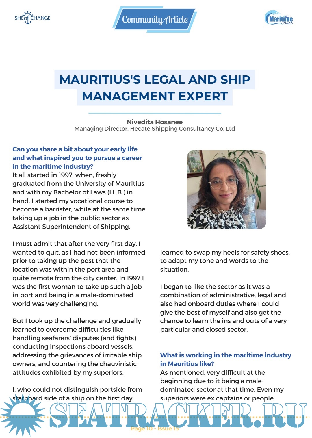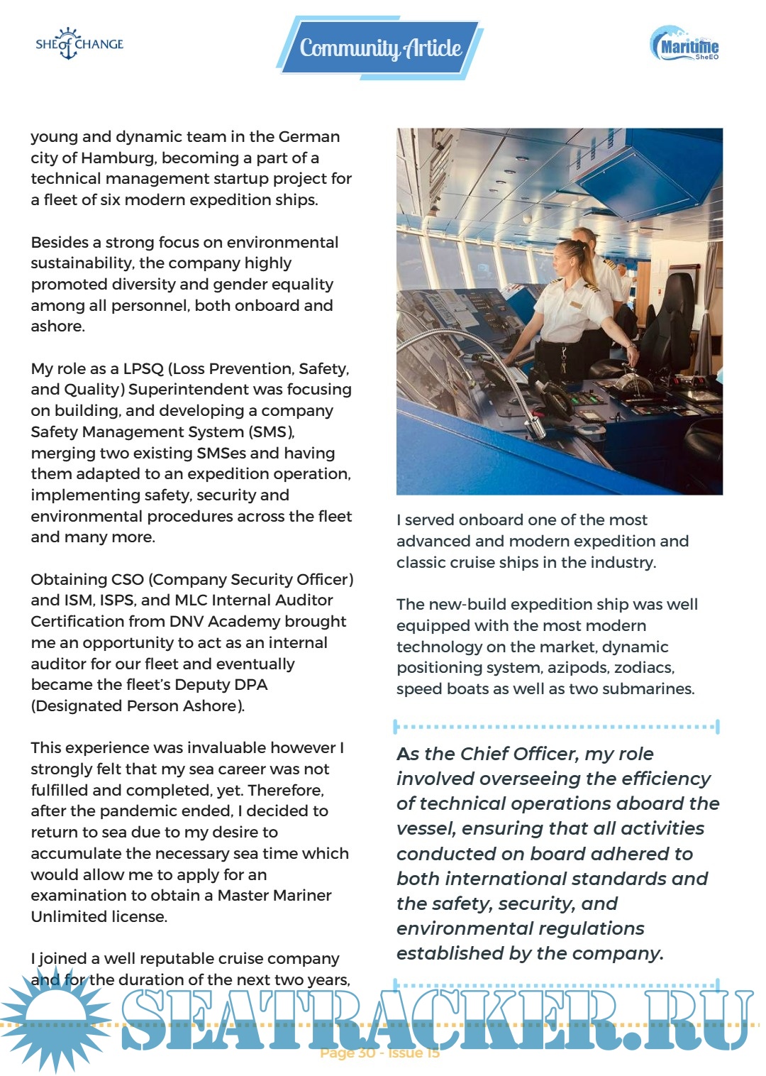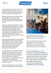 Also included in this issue are various write- ups / stories on remarkable, resilient women who work in the shipping industry. These women have persevered in their dedication and expertise, accomplishing remarkable success in their maritime careers, both at sea and on the shore.