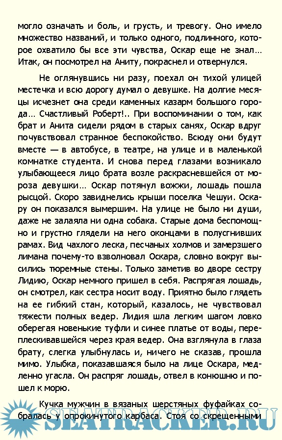 Год выпуска: 1979 Язык: Русский Автор: Лацис В. Жанр: Художественная литература Издательство: Маяк Издание: Морская библиотека Формат: FB2 Качество: Изначально компьютерное (eBook) Количество страниц: 676 Описание: Начиналось все почти как классическая сказка о Золушке, но в мужском варианте - брат обеспечивает нужды не только еще не старых родителей, но и сестру, которая уже не знает, какую еще обновку приобрести и брата, который учится в Риге, носит "городские" костюмы и конечно же на работу у него нет времени. Сам же главный герой, Оскар Клява, привык каждый день выходить в море, носить промасленную куртку и латать старые сапоги. Тяжелый, однообразный, а местами и вовсе трагический быт рыбачьей деревни, конечно, показан с почти этнографической достоверностью, включая пьянство, постоянные ссоры, вранье и нищету. На этом фоне Оскар выглядит как-то чересчур идеальным - почти не пьет, в конфликты до последнего не встревает, живет без долгов... Натурально, сказочный герой!
