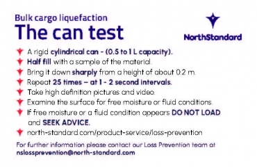 The Can Test, listed in the IMO’s IMSBC Code is a simple and useful tool available to ship’s crews to help determine if a cargo is unsafe.However there have been a number of incidents where the can test has not been carried out properly or the results were incorrectly interpreted. These errors have contributed to the loss of vessels and their crews.