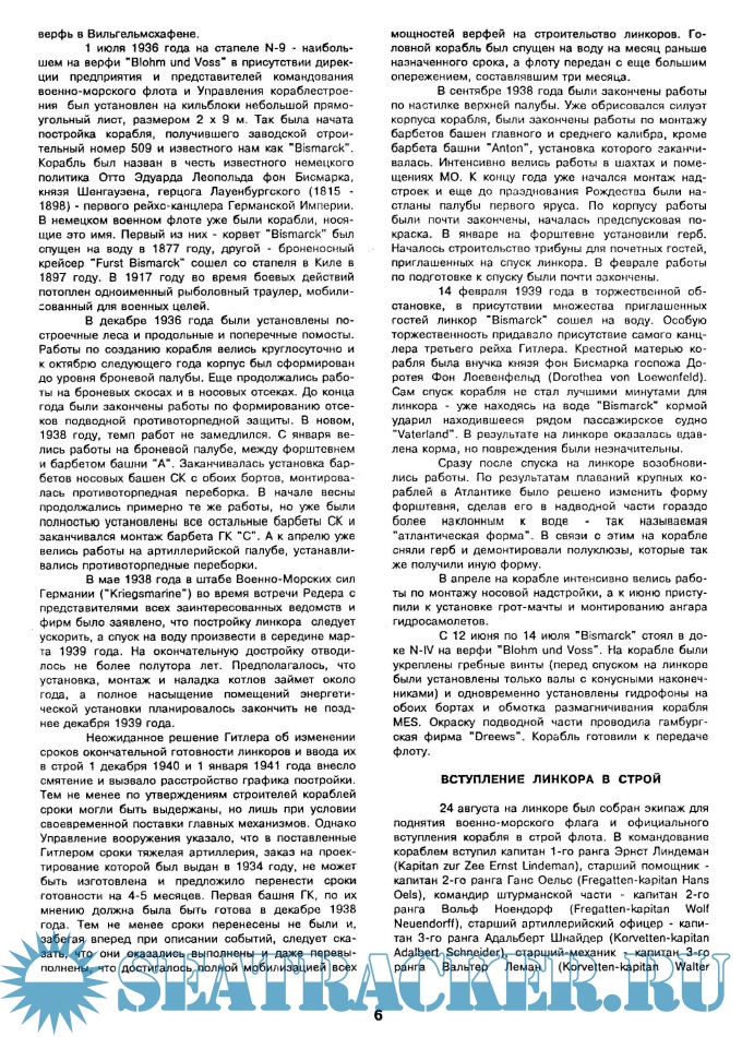 Год выпуска: 1994 Язык: Русский Автор: сост. Печуконис Н.И., Давыдов Ю.В. Жанр: Историческое Формат: PDF Качество: Отсканированные страницы Количество страниц: 49 Описание: В истории морских войн и сражений есть отдельные корабли, имена которых занимают особенные места среди всех остальных. К таким кораблям, несомненно, можно причислить и немецкий линкор "Bismarck" . Со времени его гибели прошло больше пятидесяти лет, однако все эти годы интерес к кораблю не ослабевал. Короткая карьера этого корабля, его единственный боевой поход, уже долгое время привлекает внимание многих историков флота. Однако, следует сказать, что "Bismarck" интересен не только своей необычной судьбой. Он являлся крупнейшим кораблем германского флота и представлял собой воплощение всех новейших для той эпохи достижений немецкой инженерной мысли. "Bismarck'у" посвящено множество статей и исследований, о нем написано большое количество книг. Тем не менее этот выпуск (как, впрочем, и польская монография) не является каким-либо серьезным исследованием. Сделана попытка лишь более или менее подробно рассказать о том, как был устроен корабль, как он строился и что с ним произошло после вступления в строй. Надеемся, что он будет интересен всем, кто интересуется историей флота.