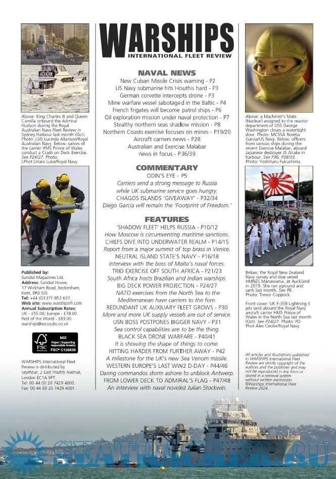 Year: 2024 Language: English Author: Iain Ballantyne (Editor) Genre: Periodical publication Edition: 2024-12 Format: PDF Quality: eBook Pages count: 52 Description: Warships IFR puts the spotlight on the latest developments in the world’s navies. It covers current defence issues and has comments by leading analysts. The magazine regularly includes features on the Royal Navy and the US Navy in addition to incorporating news and features on all other navies across the globe. Warships IFR frequently carries in-depth articles on naval heritage.WARSHIPS International Fleet Review is published 12 times a year by Tandy Media Ltd who also publish Shipping Today & Yesterday (which provides news and features from the world of merchant shipping).