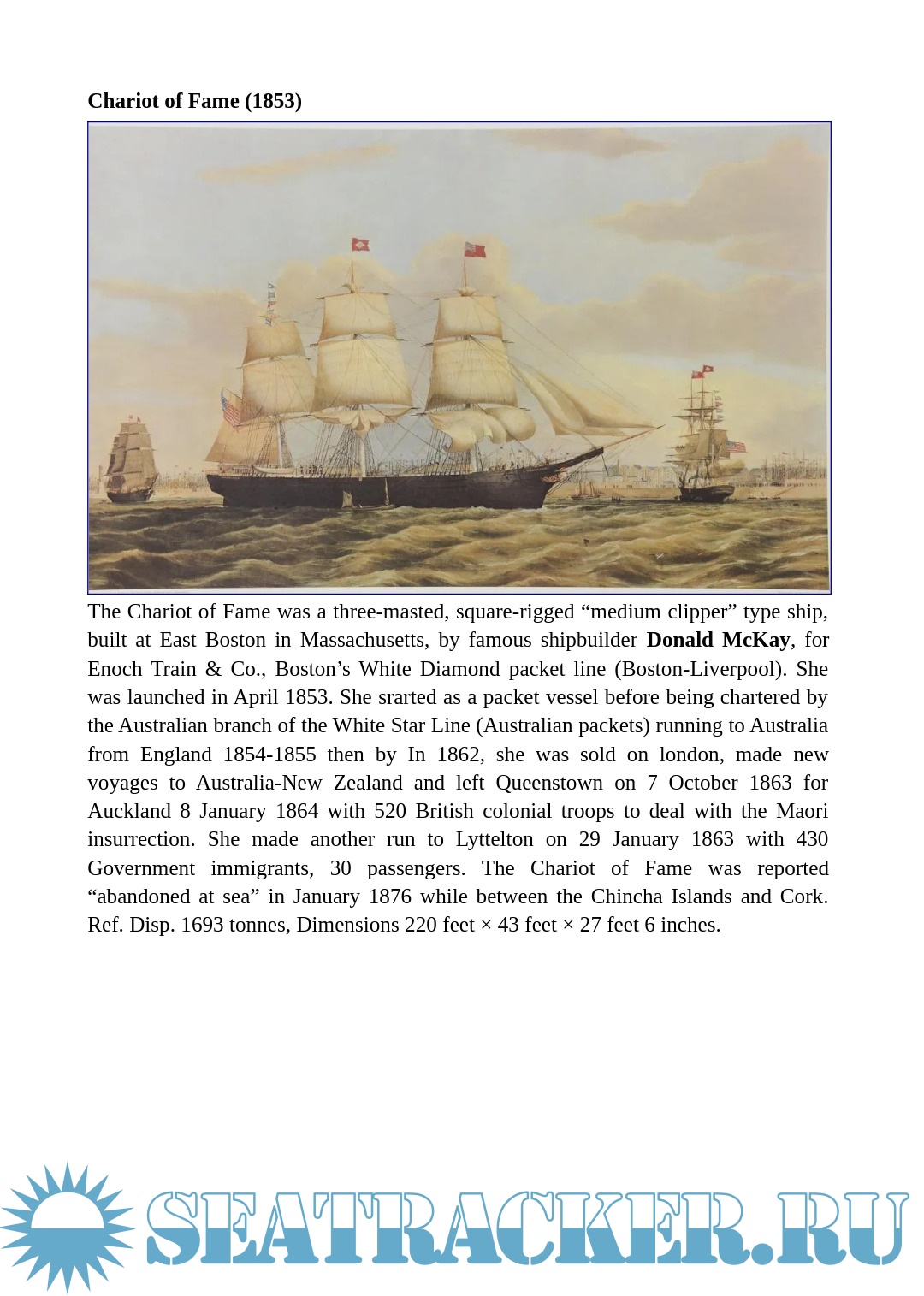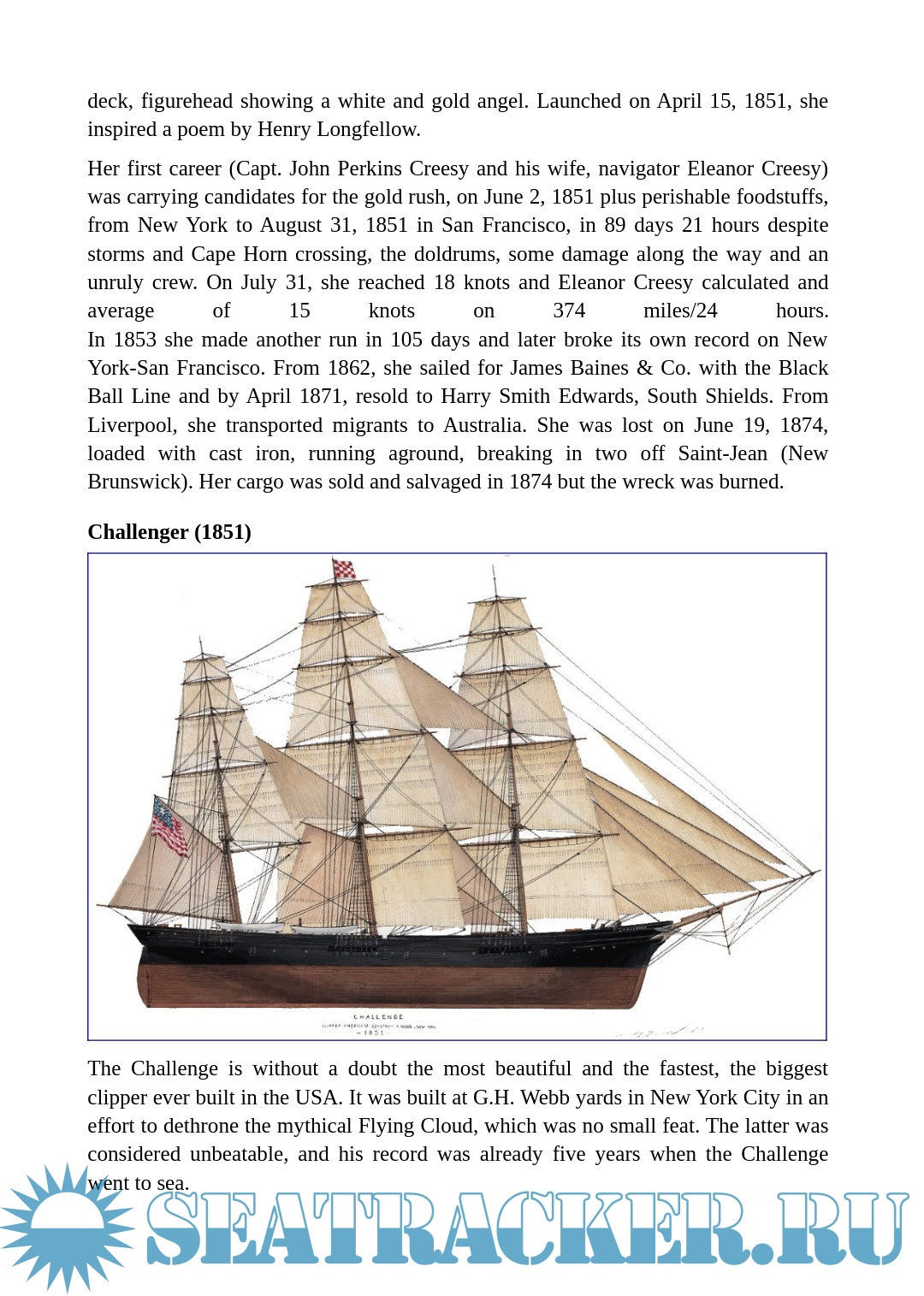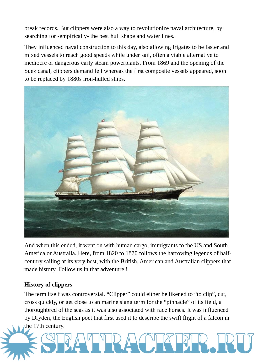 Year: 2020 Language: English Author: - Genre: Encyclopedia Format: PDF, DOCx Quality: eBook Pages count: 27 Description: The term itself was controversial. “Clipper” could either be likened to “to clip”, cut, cross quickly, or get close to an marine slang term for the “pinnacle” of its field, a thoroughbred of the seas as it was also associated with race horses. It was influenced by Dryden, the English poet that first used it to describe the swift flight of a falcon in the 17th century.