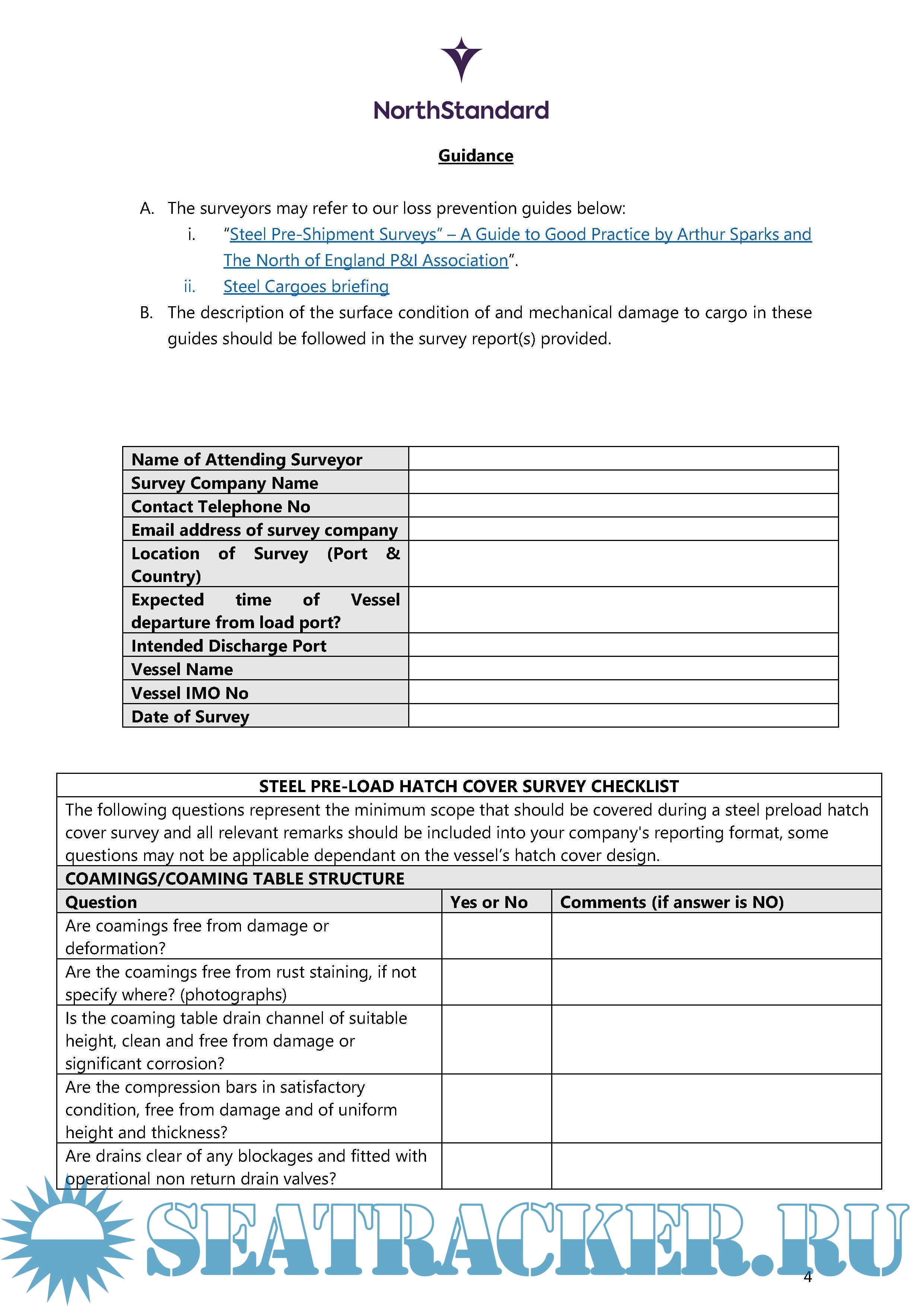 Year: 2024 Language: English Author: NorthStandard Genre: Guide Edition: September 2024 Format: PDF Quality: eBook Pages count: 10 Description: Pre-loading Steel Survey - Surveyor's instructions. Steel is one of the most commonly used products in the world today. Problems can arise when transporting steel cargoes by sea. For a carrier, one of the biggest issues lies in its condition before loading. If the pre-shipment condition of the cargo is not properly recorded at the time of loading, this can lead to the cargo owner successfully bringing a claim that their cargo was damaged whilst on board the vessel. Most problems can be avoided if the carrying vessel’s crew carefully checks and records the pre-shipment condition of the cargo, and follows best practice on cargo handling, stowage and securing. Additional info: For more information, please refer to the Carriage of Steel Cargoes publications: