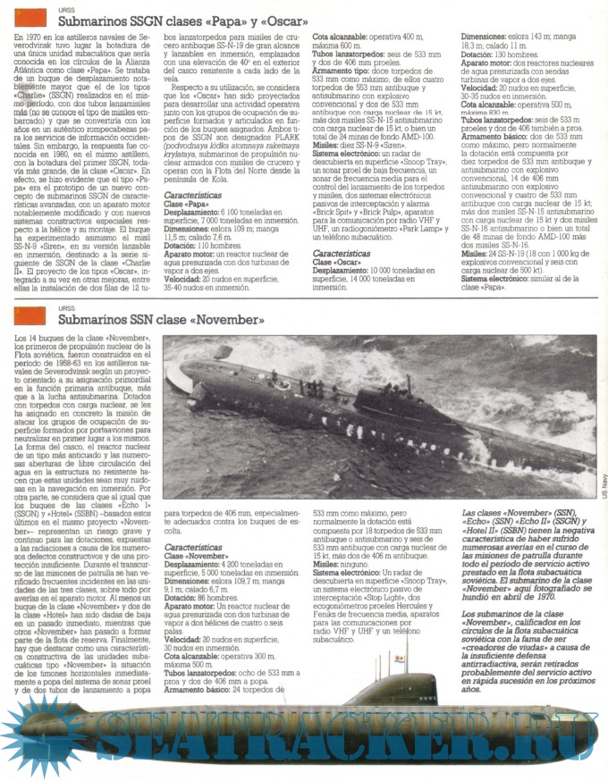 Year: 1984 Language: Spanish Author: Planeta-Agostini Genre: Historical Format: PDF Quality: Scanned pages Pages count: 23 Description: Enciclopedia de las Armas del Siglo XX. Esta obra de Planeta-Agostini consta de 120 fasciculos encuadernables en 10 volúmenes. En esta numero: Submarino nucleares de ataque. Bajo la quieta superficie del oceano se desarrolla en estos momentos un mortifero juego del gato y el raton entre los submarinos sovieticos y los de la OTAN. En el, el peon principal es el submarino nuclear de ataque, dotado con una impresionante gama de armas antisubmarinas y capaz de alcanzar velocidades y profundidades inimaginables.