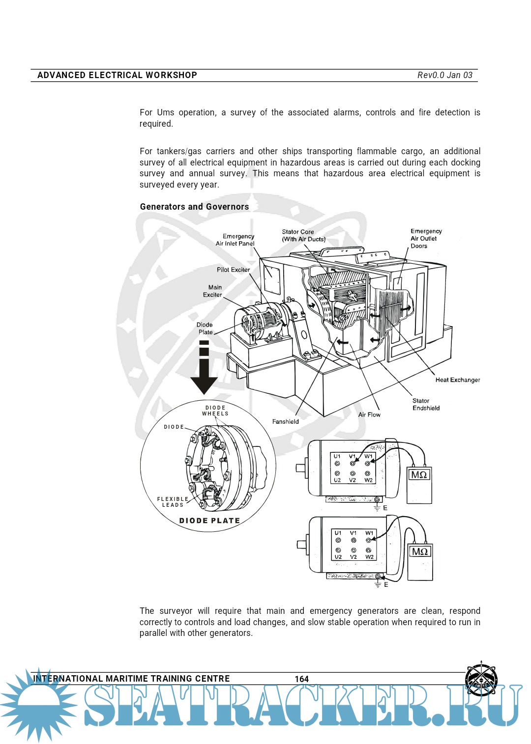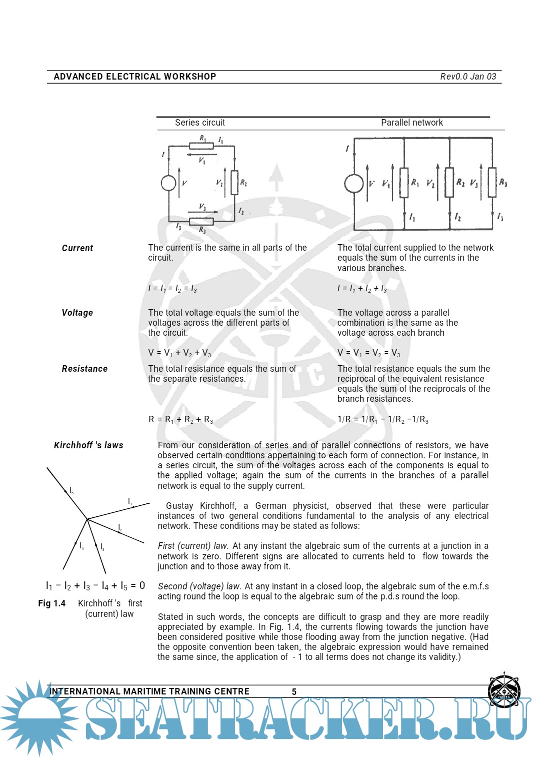 Year: 2004 Language: English Author: Maersk Genre: Training courses Publisher: International Maritime Training Centre - Wilhelmsen Format: PDF Quality: eBook Pages count: 205 Description: The workshop provides in-depth training on various electrical systems and troubleshooting techniques essential for marine engineers. It focuses on improving participants' confidence and competence in handling and analyzing electrical circuits, components, and systems. Course Objectives: - Understand the fundamental principles of electrical technology. - Identify and interpret electrical symbols, components, and their functions. - Learn to trace and troubleshoot complex electrical circuits logically. - Gain hands-on experience with advanced electrical systems and equipment. Theoretical: - Alternating current (A.C.) fundamentals and generator operations. - Power generation and parallel generator operations. - Maintenance of air circuit breakers and hazardous zones. - Motors, starters (including DOL, reduced voltage, and variable frequency drives), and soft starters. - Secondary battery maintenance and cathodic protection. Practical: - Use of diagnostic tools like multimeters and meggers. - Hands-on experience with contactors, relays, and timers. - Wiring and troubleshooting of various starters (DOL, star-delta, etc.). - Advanced troubleshooting on boiler control panels and other shipboard electrical systems. Duration: - 4 to 6 days, depending on the specific course structure. Target Audience: - Marine engineers, electrical officers, and related professionals seeking to improve their expertise in electrical systems.