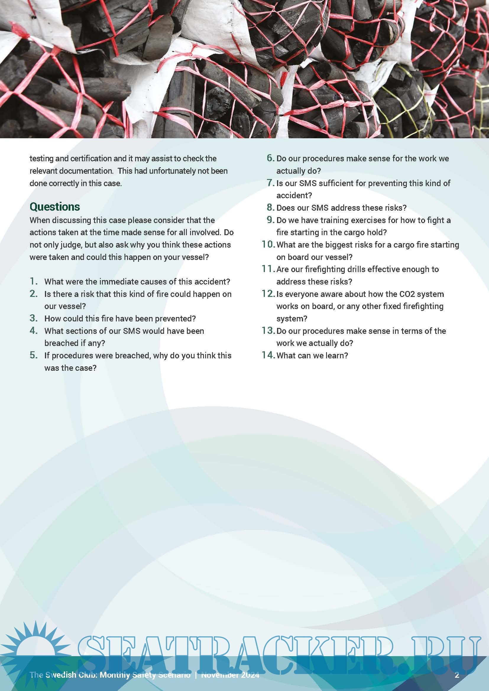 Year: 2024 Language: English Author: the Swedish Club Genre: Periodical publication Edition: November 2024 Format: PDF Quality: eBook Pages count: 3 Description: The Club is publishing, on a monthly basis, a new Monthly Safety Scenario (MSS) to assist owners in their efforts of complying with the above regulations. Alternative scenarios will be uploaded in SCOL. It is easy to download the MSS and enter the written conclusions from the meeting and send feedback to the shore-based organisation. Issue November, 2024 | Incorrect declaration caused charcoal fire. Under the ISM requirement, owners are obliged to carry out monthly safety meetings or safety committee meetings onboard their vessels. This obligation stems from Chapter 5 of the ISM Code: “Master’s responsibility and authority” and furthermore from “5.1.2, motivating the crew in the observation of that policy.