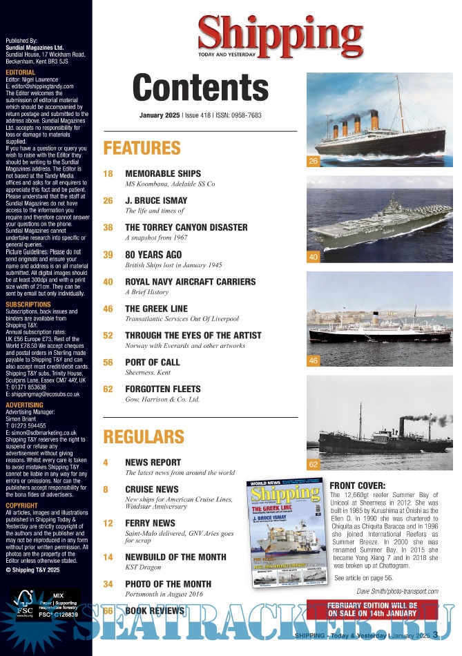 Description: Warships IFR puts the spotlight on the latest developments in the world’s navies. It covers current defence issues and has comments by leading analysts. The magazine regularly includes features on the Royal Navy and the US Navy in addition to incorporating news and features on all other navies across the globe. Warships IFR frequently carries in-depth articles on naval heritage.WARSHIPS International Fleet Review is published 12 times a year by Tandy Media Ltd who also publish Shipping Today & Yesterday (which provides news and features from the world of merchant shipping).