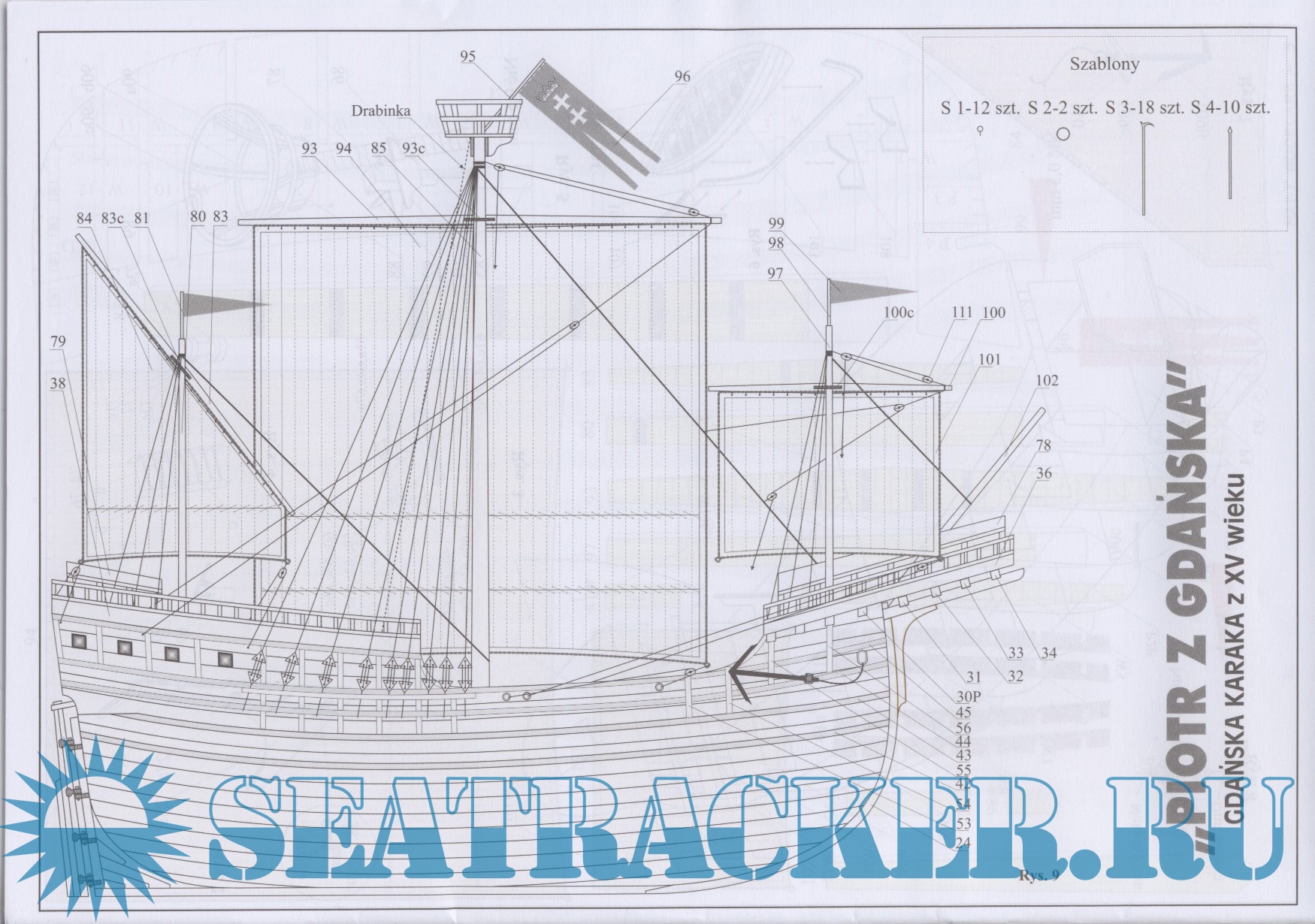 15 листов цветных выкроек и инструкций для изготовления бумажной модели караки 15 века Петр из Данцига (Piotr z Gdanska) в масштабе 1:200