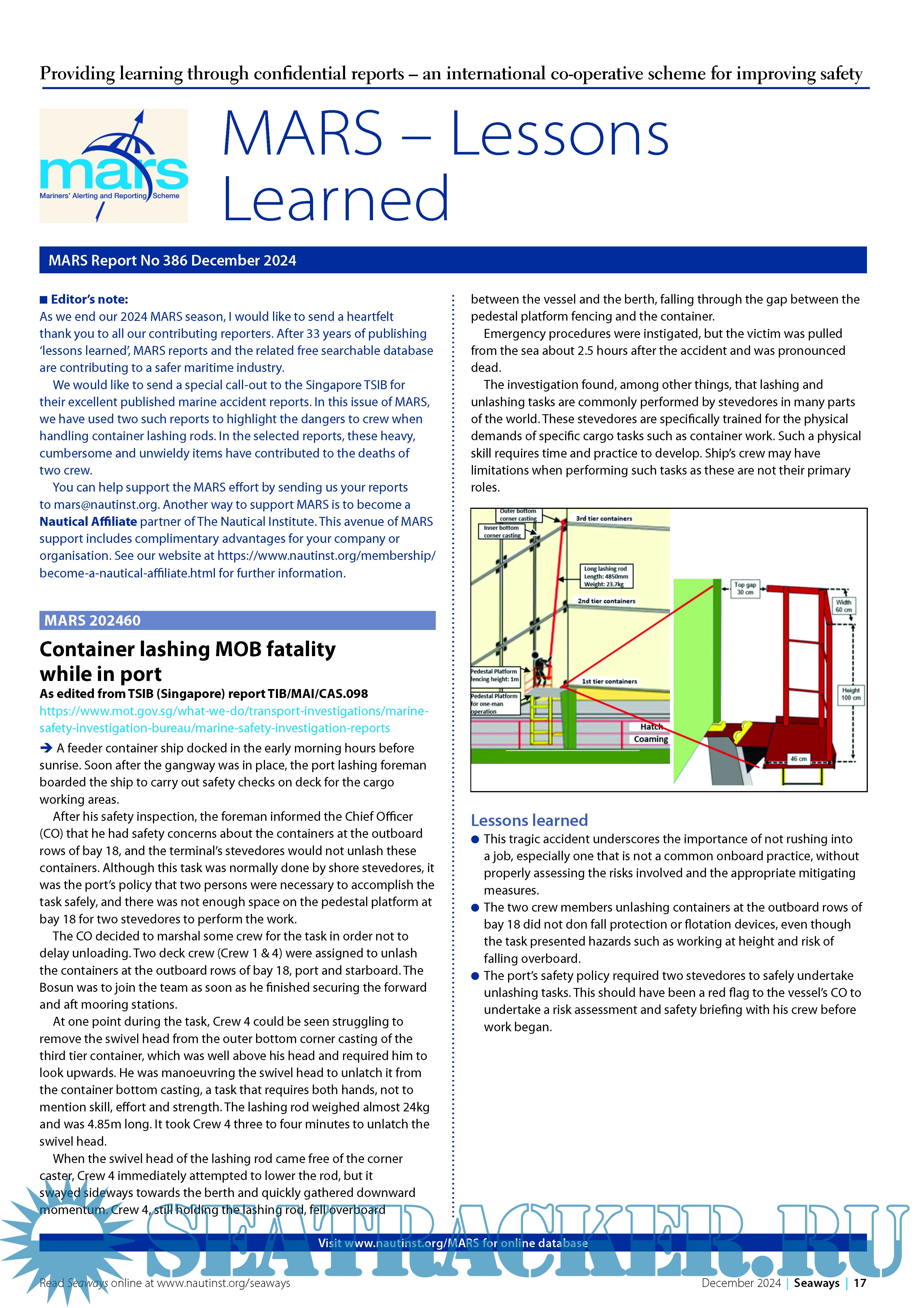 Year: 2024 Language: English Author: The Nautical Institute Genre: Periodical publication Edition: issue No.386 December, 2024 Format: PDF Quality: eBook Pages count: 4 Description: Providing learning through confidential reports an international co-operative scheme for improving safety. MARS is a searchable database containing reports of accidents and near misses stretching back over a quarter of a century. Funded through the generous support of the Institute's Nautical Affiliate partners, it is one of the maritime industry's leading risk reduction initiatives and is helping to make life safer for seafarers everywhere.