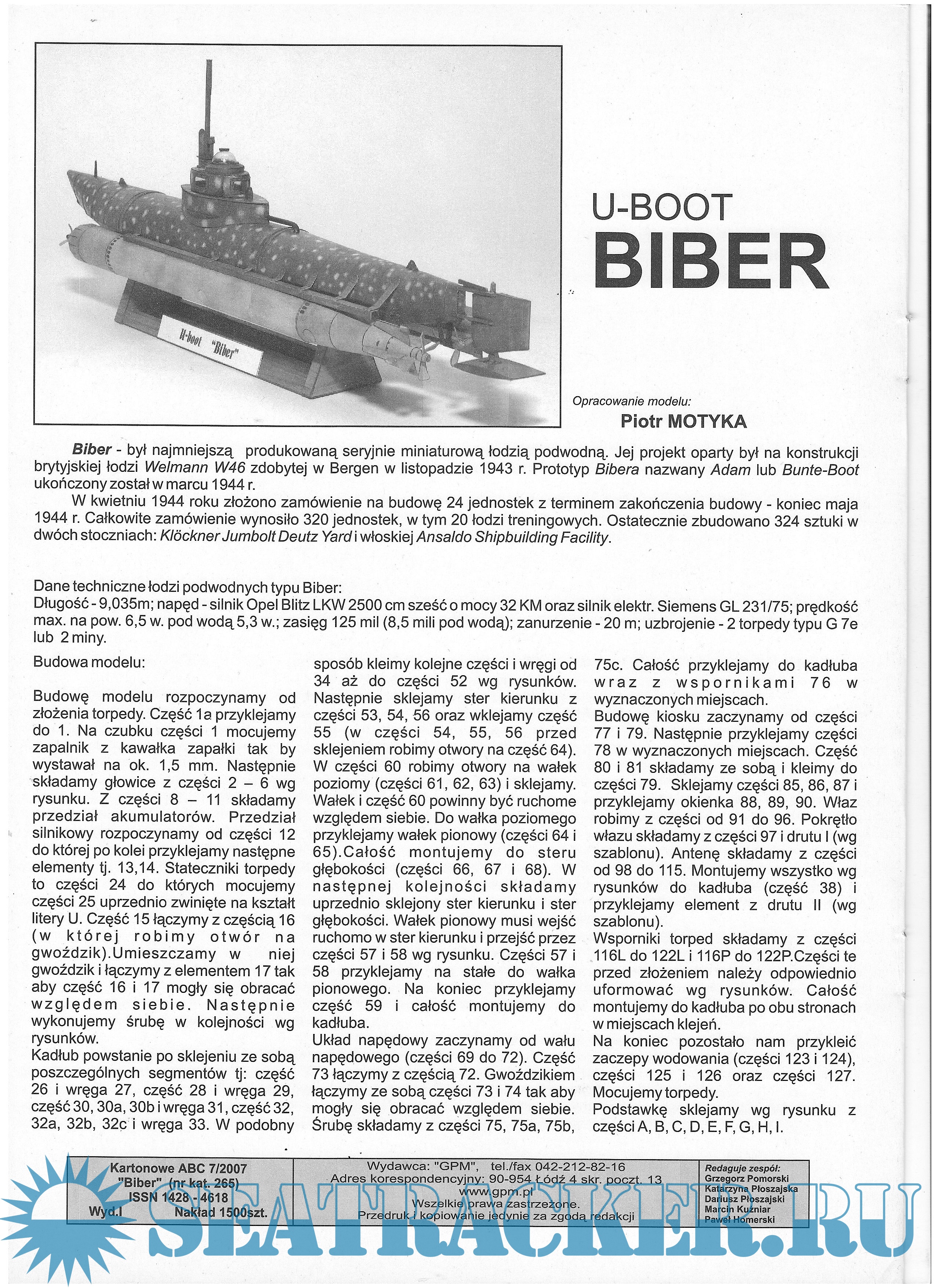 Год выпуска: 2007 Язык: Английский, Немецкий, Польский Автор: Пётр Мотяка Жанр: Кто действительно занимается судо- (и не только) моделизмом :) Издание: GPM 265 Формат: JPEG Качество: Изначально компьютерное (eBook) Количество страниц: 12 Описание: 12 листов цветных выкроек и инструкций для изготовления бумажной модели германской подводной лодки BIBER в масштабе 1:25