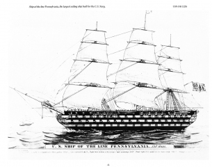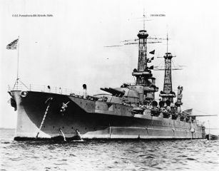 Description: USS Pennsylvania (BB-38) was the lead ship of the Pennsylvania class of super-dreadnought battleships built for the United States Navy in the 1910s. The Pennsylvanias were part of the standard-type battleship series, and marked an incremental improvement over the preceding Nevada class, carrying an extra pair of 14-inch (356 mm) guns for a total of twelve guns. Named for the Commonwealth of Pennsylvania, she was laid down at the Newport News Shipbuilding and Drydock Company in October 1913, was launched in March 1915, and was commissioned in June 1916. Equipped with an oil-burning propulsion system, Pennsylvania was not sent to European waters during World War I, since the necessary fuel oil was not as readily available as coal. Instead, she remained in American waters and took part in training exercises; in 1918, she escorted President Woodrow Wilson to France to take part in peace negotiations.