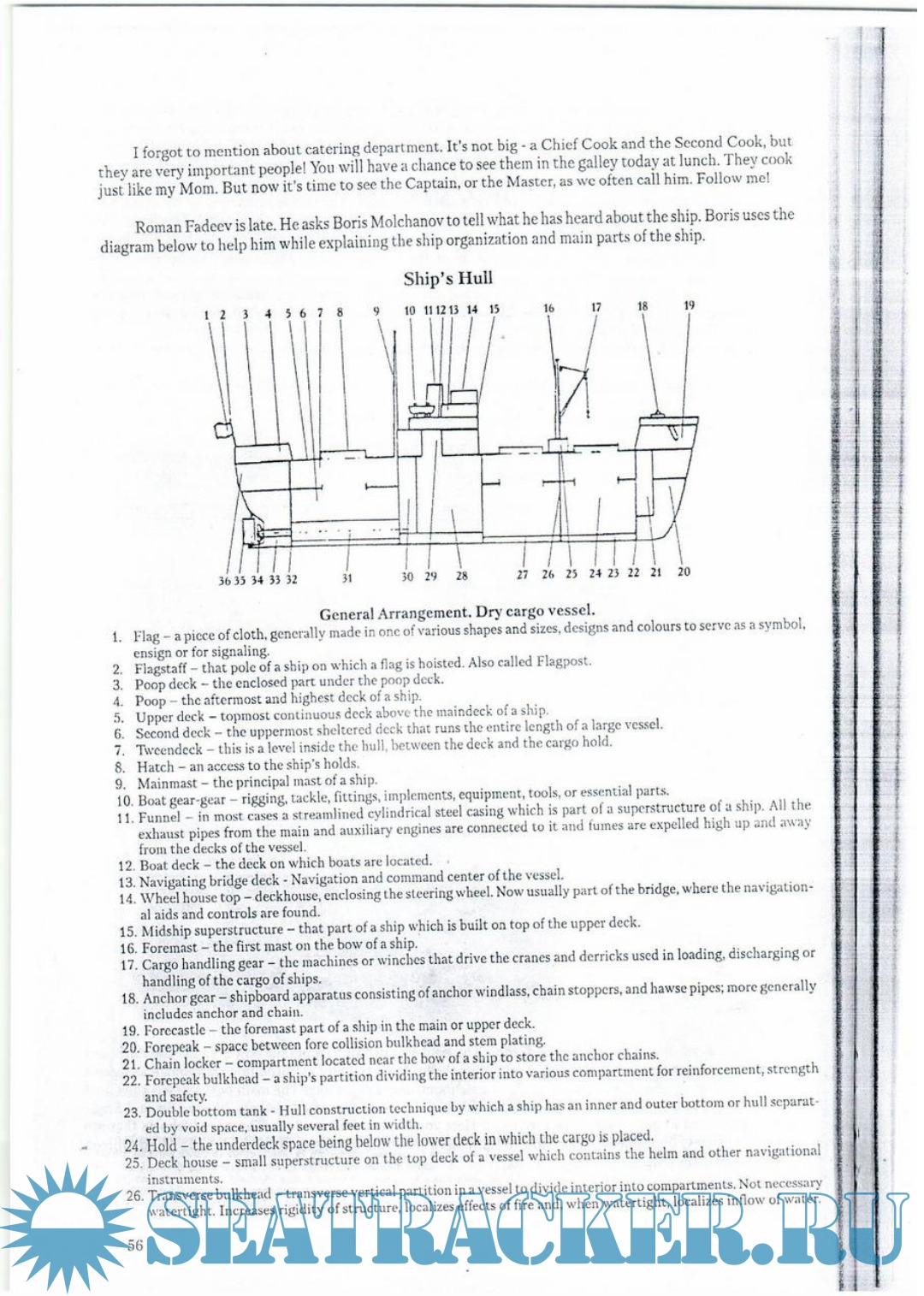 The manual is divided into three parts. The first two parts consist of 26 blocks, structured as a continuous script simulating a training voyage. Role-playing of professional and educational functions on board is performed by active crew members and cadets from Odessa National Maritime Academy.