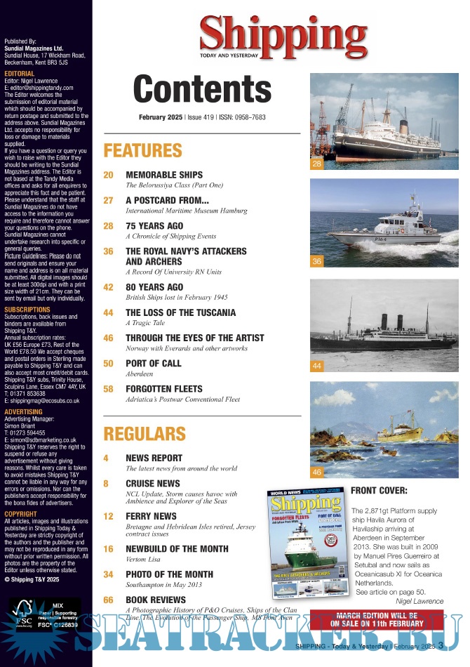Description: Warships IFR puts the spotlight on the latest developments in the world’s navies. It covers current defence issues and has comments by leading analysts. The magazine regularly includes features on the Royal Navy and the US Navy in addition to incorporating news and features on all other navies across the globe. Warships IFR frequently carries in-depth articles on naval heritage.WARSHIPS International Fleet Review is published 12 times a year by Tandy Media Ltd who also publish Shipping Today & Yesterday (which provides news and features from the world of merchant shipping).