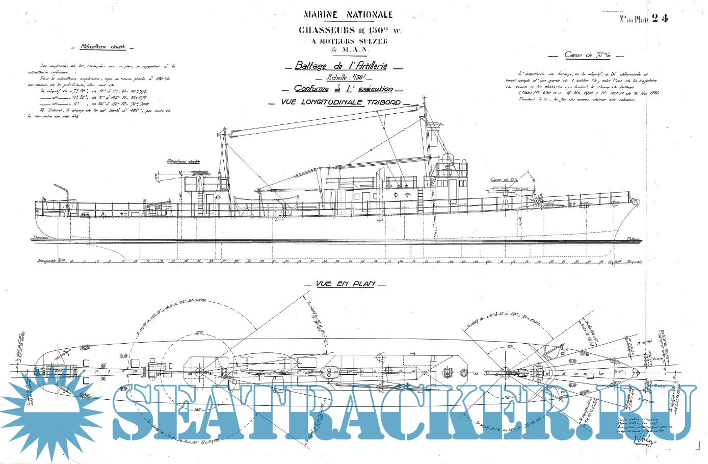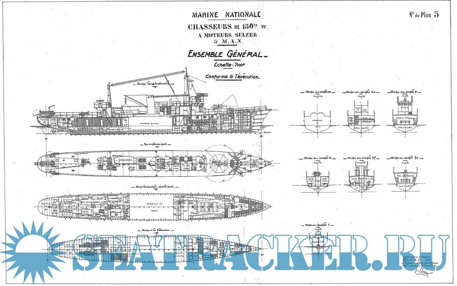 21 лист архивных чертежей французской канонерской лодки Chasseurs de Sous-Marins CH2 1933 год