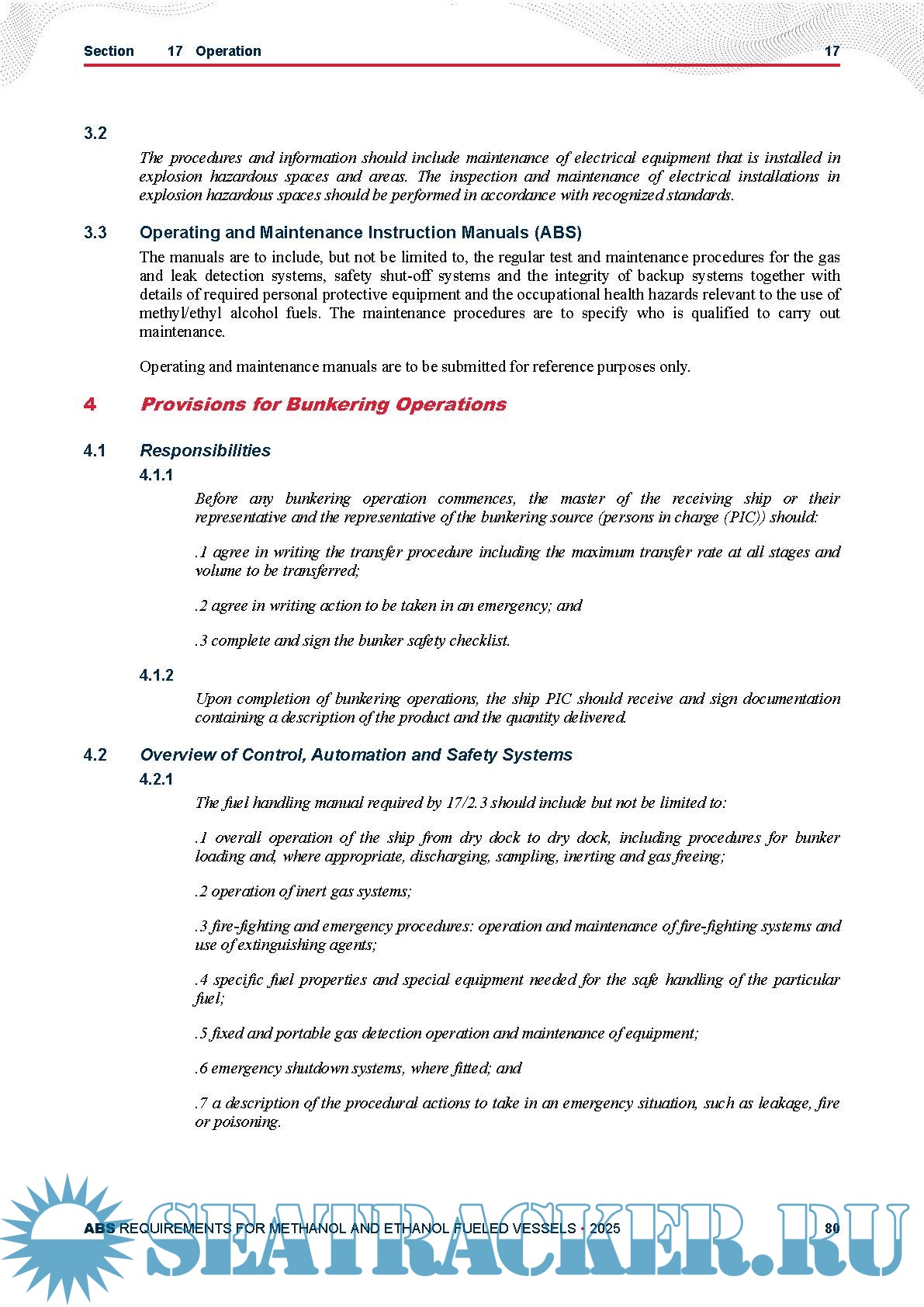 Text in italics comes from MSC.1/Circ.1621, the Interim Guidelines for the Safety of Ships Using Methyl/Ethyl Alcohol as Fuel. Operational, training or national requirements are shown in italics and are not required for Classification and are shown for information only.