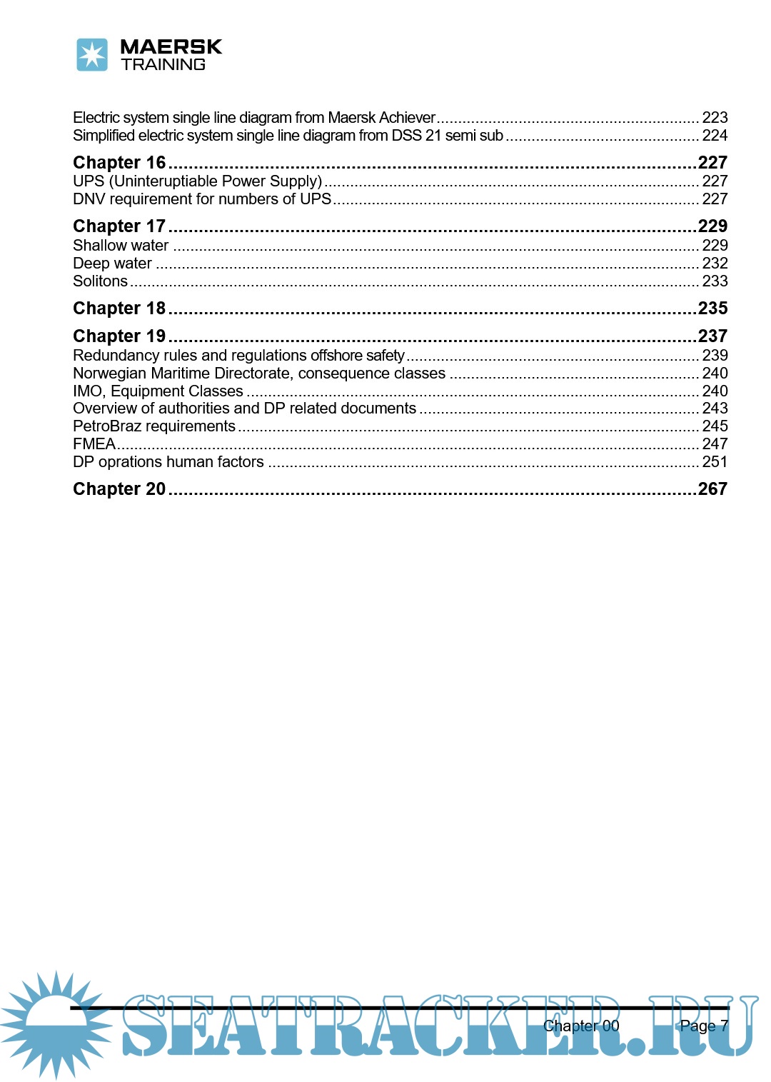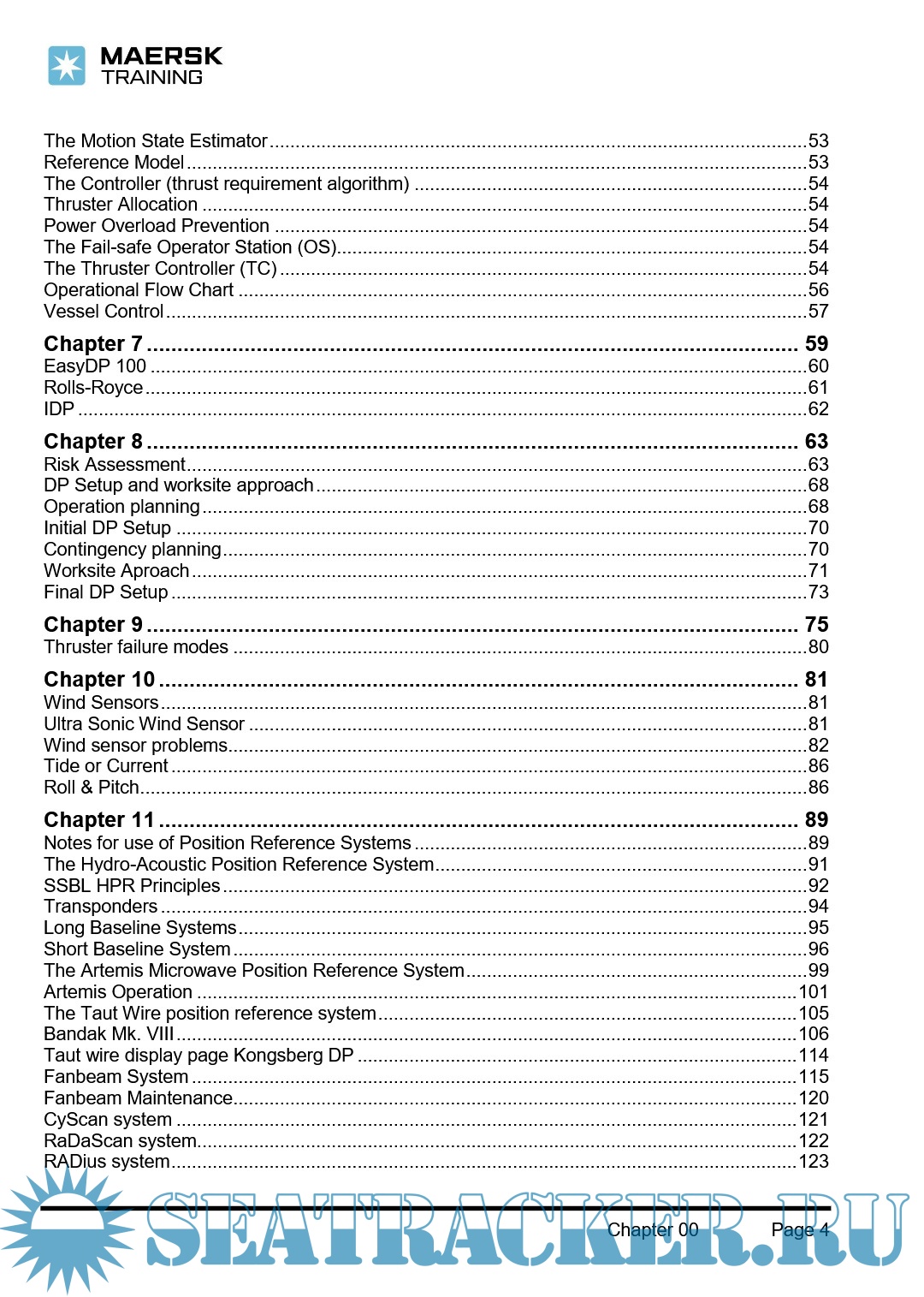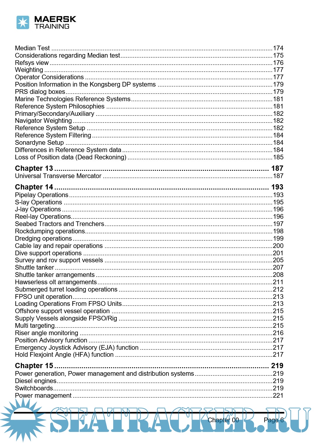 Year: 2013 Language: English Author: Maersk Training Brasil Genre: Manual, Training Course Format: PDF Quality: eBook Pages count: 267 Description: The training is based on the programme as outlined by the Nautical Institute Scheme of Training which follows the recommendations contained in The International Maritime Organisation (IMO) and the International Marine Contractors Association (IMCA) guidelines. Training is a mix of theoretical sessions and practical exercises on Kongsberg DP stand-alone simulators. All training is conducted as classroom training. At the end of the course the student should have acquired knowledge of the principles of Dynamic Positioning, be able to set up a dynamic positioning system and have an understanding of the practical operation of associated equipment, including position reference systems. He/she should be able to recognise and respond to the various alarms, warning and information messages. He/she should also be able to relate the DP installation to the ship system, e.g. power supply, manoeuvring facility, available position reference systems and nature of work. He/she should also be able to relate DP operations to the existing environmental conditions of wind, sea state, current and vessel movement. By the end of the course, the student must be able to: - Describe principles of DP - Describe the various elements of a DP system, including Position Reference system, sensors, power and state the requirements for redundancy including methods - Demonstrate sufficient knowledge of practical operation of a DP system in various modes and use all relevant features available in exercises performed - Describe principle, limitations and use of position reference systems - Describe principle, limitations and use of sensors and ancillary equipment - Describe typical power and distribution arrangements in diesel electric and non-diesel electric vessels. Describe UPS systems and typical PMS system. Recognize power requirements in DP vessels - Describe and evaluate various propulsion and thrusters system and compare them to each other - Describe procedures to be followed in a DP operation, including planning using vessel and field info, contingency planning, checklists, worksite approach, communication, handover - Describe datums used and understand UTM coordinates - Describe documentation and log book requirements - Describe arrangements made for DP operations in specialist vessels - Describe hazards associated with deep and shallow water operations