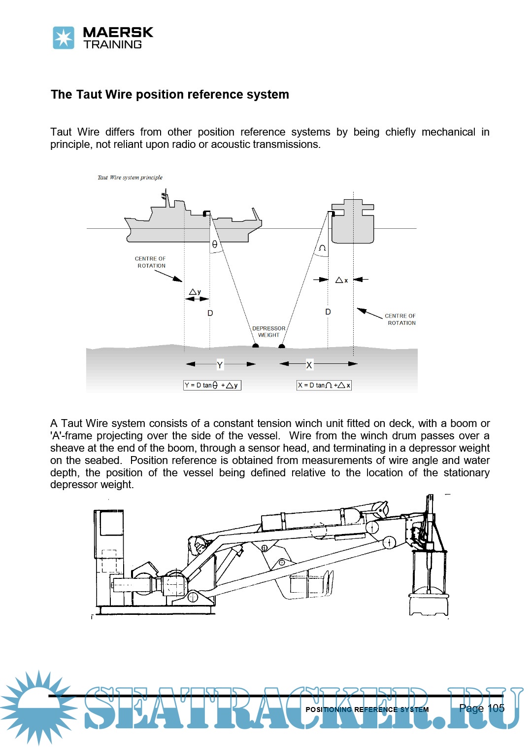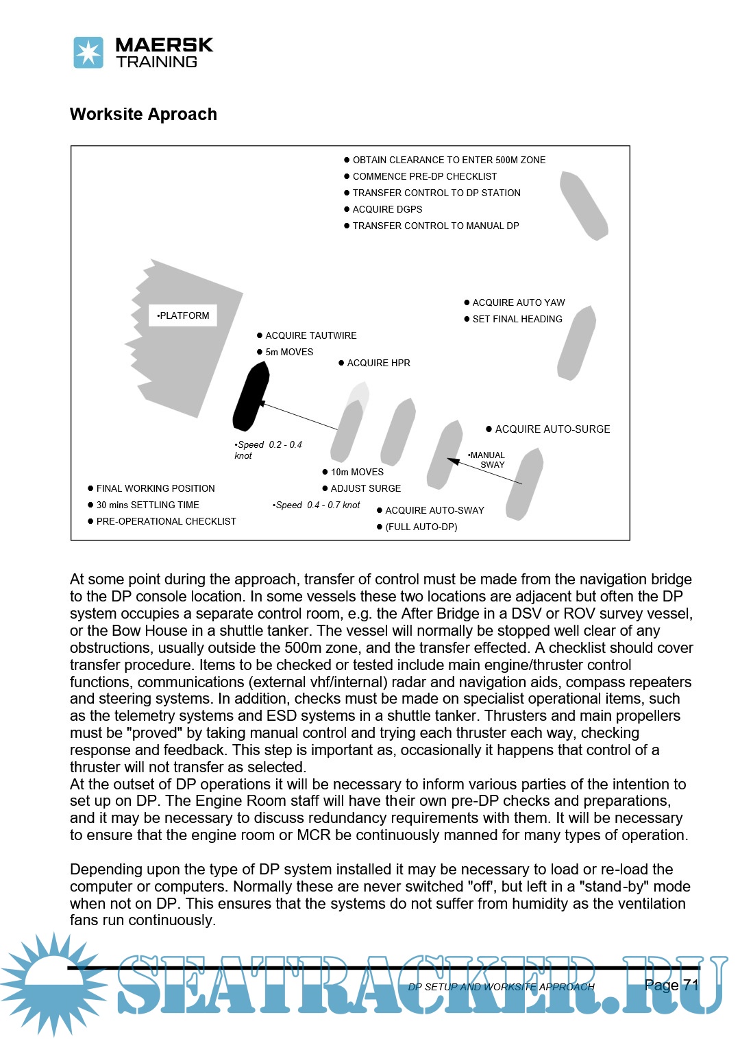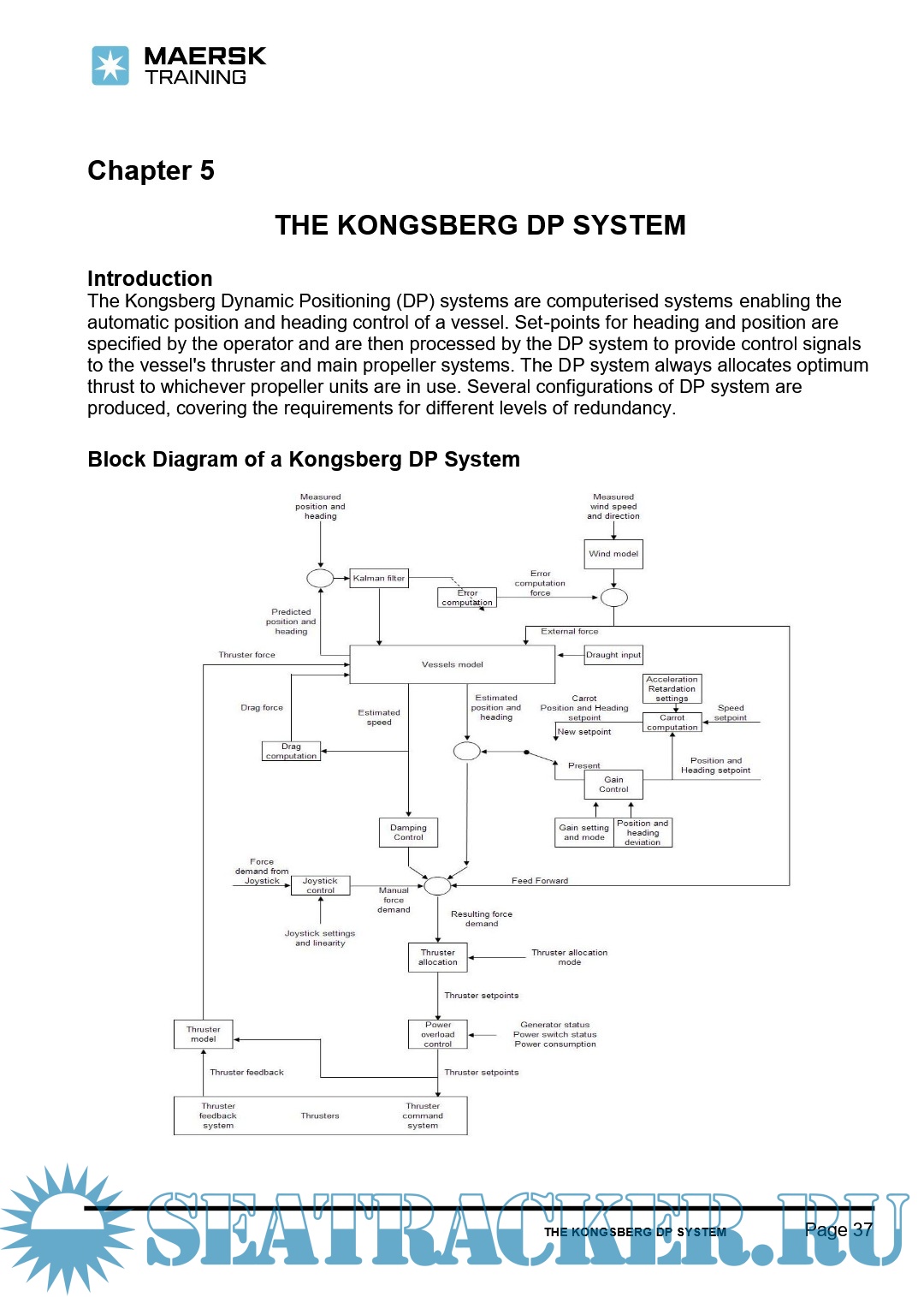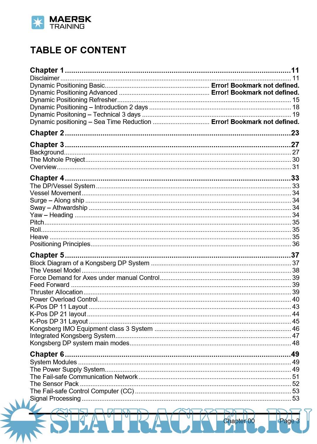 Year: 2013 Language: English Author: Maersk Training Brasil Genre: Manual, Training Course Format: PDF Quality: eBook Pages count: 267 Description: The training is based on the programme as outlined by the Nautical Institute Scheme of Training which follows the recommendations contained in The International Maritime Organisation (IMO) and the International Marine Contractors Association (IMCA) guidelines. Training is a mix of theoretical sessions and practical exercises on Kongsberg DP stand-alone simulators. All training is conducted as classroom training. At the end of the course the student should have acquired knowledge of the principles of Dynamic Positioning, be able to set up a dynamic positioning system and have an understanding of the practical operation of associated equipment, including position reference systems. He/she should be able to recognise and respond to the various alarms, warning and information messages. He/she should also be able to relate the DP installation to the ship system, e.g. power supply, manoeuvring facility, available position reference systems and nature of work. He/she should also be able to relate DP operations to the existing environmental conditions of wind, sea state, current and vessel movement. By the end of the course, the student must be able to: - Describe principles of DP - Describe the various elements of a DP system, including Position Reference system, sensors, power and state the requirements for redundancy including methods - Demonstrate sufficient knowledge of practical operation of a DP system in various modes and use all relevant features available in exercises performed - Describe principle, limitations and use of position reference systems - Describe principle, limitations and use of sensors and ancillary equipment - Describe typical power and distribution arrangements in diesel electric and non-diesel electric vessels. Describe UPS systems and typical PMS system. Recognize power requirements in DP vessels - Describe and evaluate various propulsion and thrusters system and compare them to each other - Describe procedures to be followed in a DP operation, including planning using vessel and field info, contingency planning, checklists, worksite approach, communication, handover - Describe datums used and understand UTM coordinates - Describe documentation and log book requirements - Describe arrangements made for DP operations in specialist vessels - Describe hazards associated with deep and shallow water operations