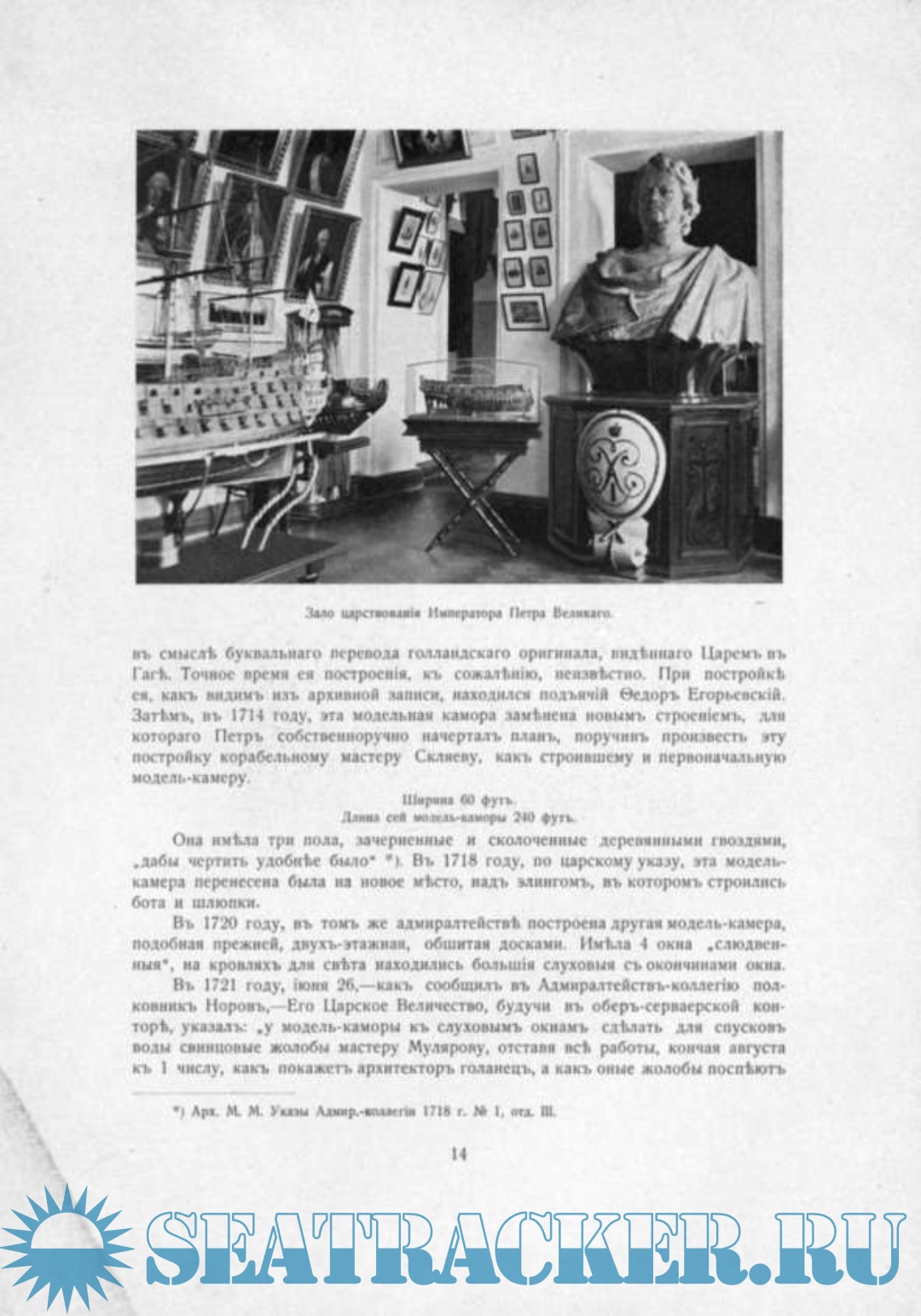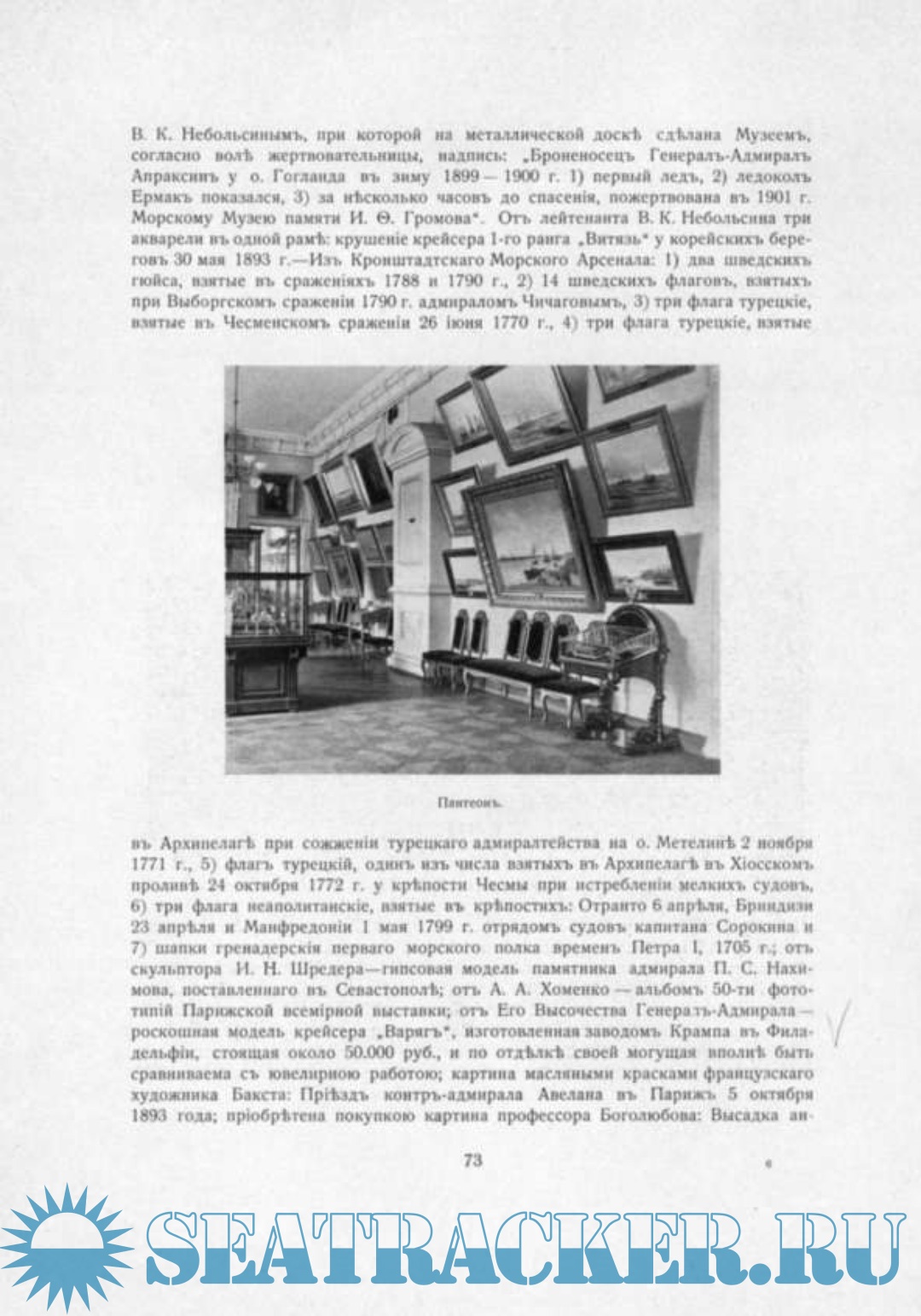 Описание: В числе различных, по своим специальностям, , музеев, находящмхсы в С.-Петербурге, имеется в здании Главного Адмиралтейсива Морской Музей, в котором историческая часть русского флота не только занимает почётное местол, с моделью знаменитого "Дедушки", но где в моделях и образцах с математической точностью, изображаются и существующие типы судов, их боевое вооружение и снабжение в хозяйственном отношении.