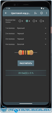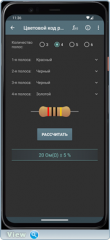 Цветовой код резистора / индуктивности, Цветовое значение резисторов, Коды SMD резисторов, Кодировка конденсаторов, Коды индуктивности, Предохранители, Соединение резисторов, Соединение конденсаторов, Резонансная частота, Делитель напряжения, Разветвление тока, Стабилитрон (диод Зенера) как стабилизатор напряжения, Гасящий резистор, Резистор для светодиода, Время работы аккумулятора, Первичная/Вторичная обмотка трансформатора, Длина антенны, Калькулятор дискового пространства и полосы пропускания для систем CCTV.