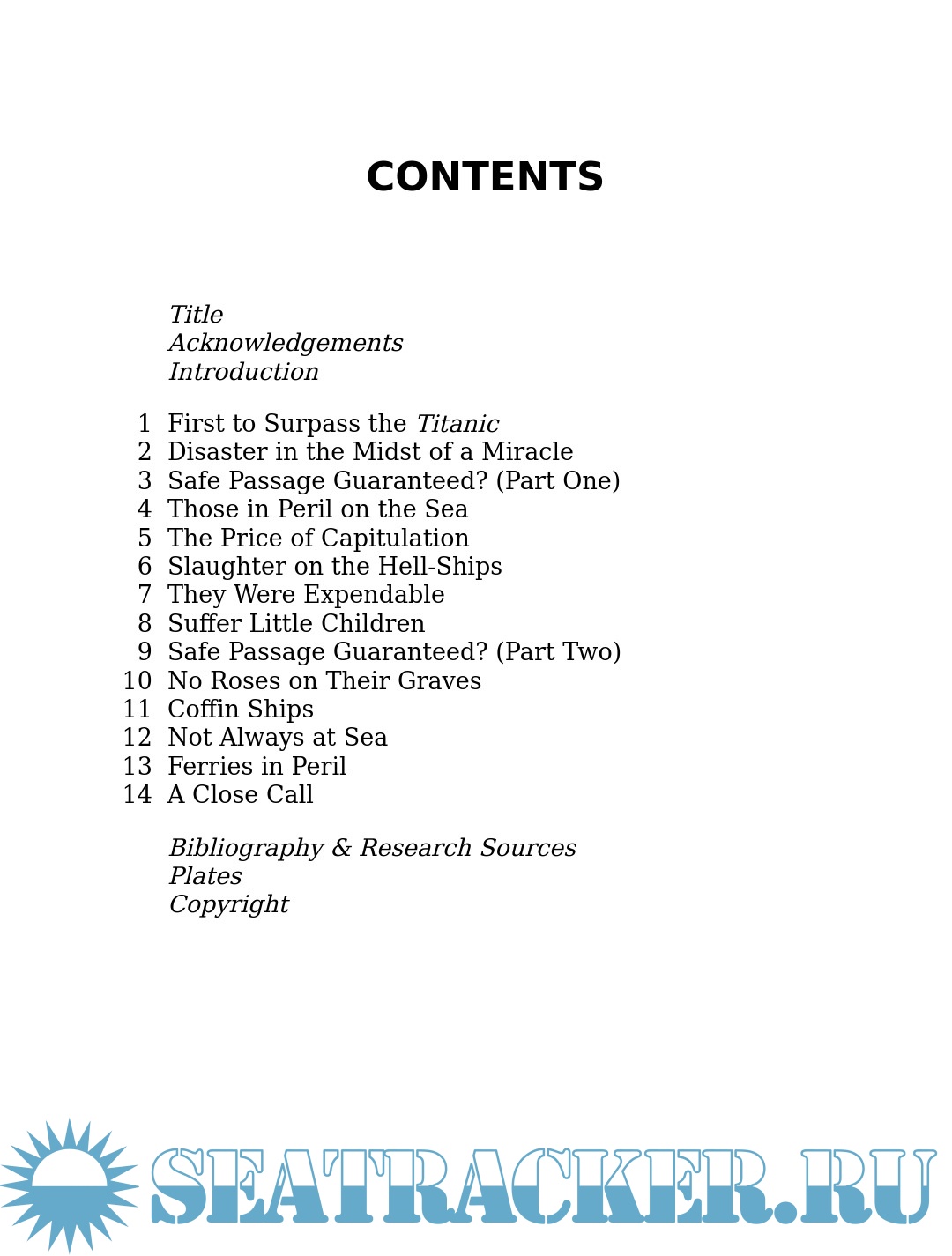 While the victims of the Titanic disaster at 1,507 persons accounted for a huge loss of life, each of the ships described in this book had a greater number of casualties, in some cases more than five times as many. In total, these 27 merchant ship sinkings resulted in a staggering loss of life at sea—more than 96,000 lives in total (3,840 per ship). While the circumstances of their losses were different than those of the Titanic, the outcome in each was no less tragic. While it is not the intention to diminish the gravity of the Titanic case, these lesser-known tragedies do give "the worst disaster at sea" a sobering perspective. Despite the fact that the Titanic disaster ranks behind so many other losses, so powerful has her name become as a representation of extreme misfortune, that it was the inevitable choice to describe some of these other events. Hence, they have come to be known as "Germany's Titanic" and "The Titanic of Japan" as just two examples. Ships include the Lancastria, sunk by German bombers with a loss of 3,000 British lives (Britain's worst maritime disaster); the Ryusei Maru, a Japanese "Hellship" loaded with 6,000 Allied POWs that was torpedoed by a US submarine; and the Wilhelm Gustloff, a German liner packed with 7,800 civilians in operation "Hannibal" evacuation, sunk by a Russian submarine. There were no survivors and this tragedy was the worst maritime disaster of all time.