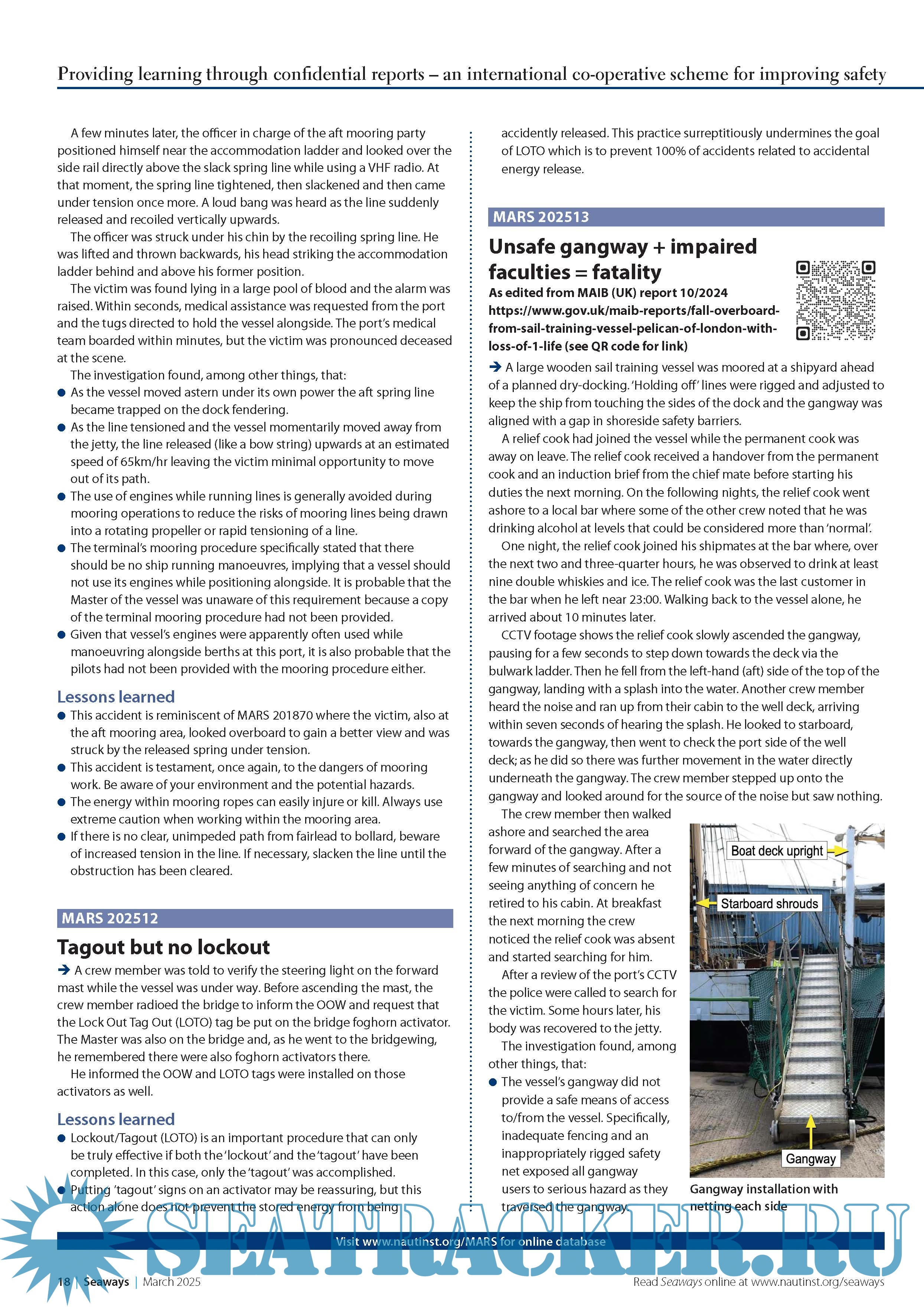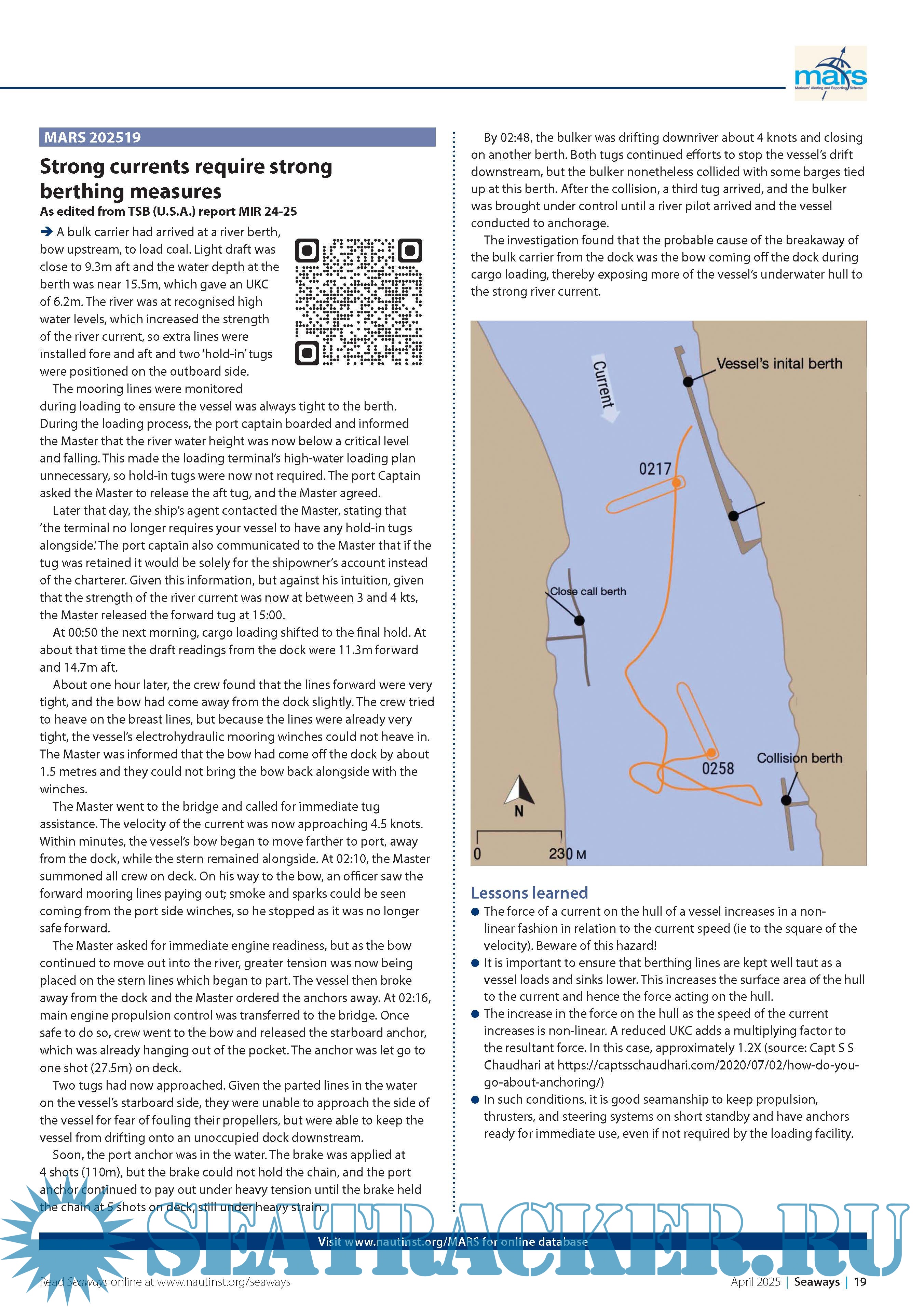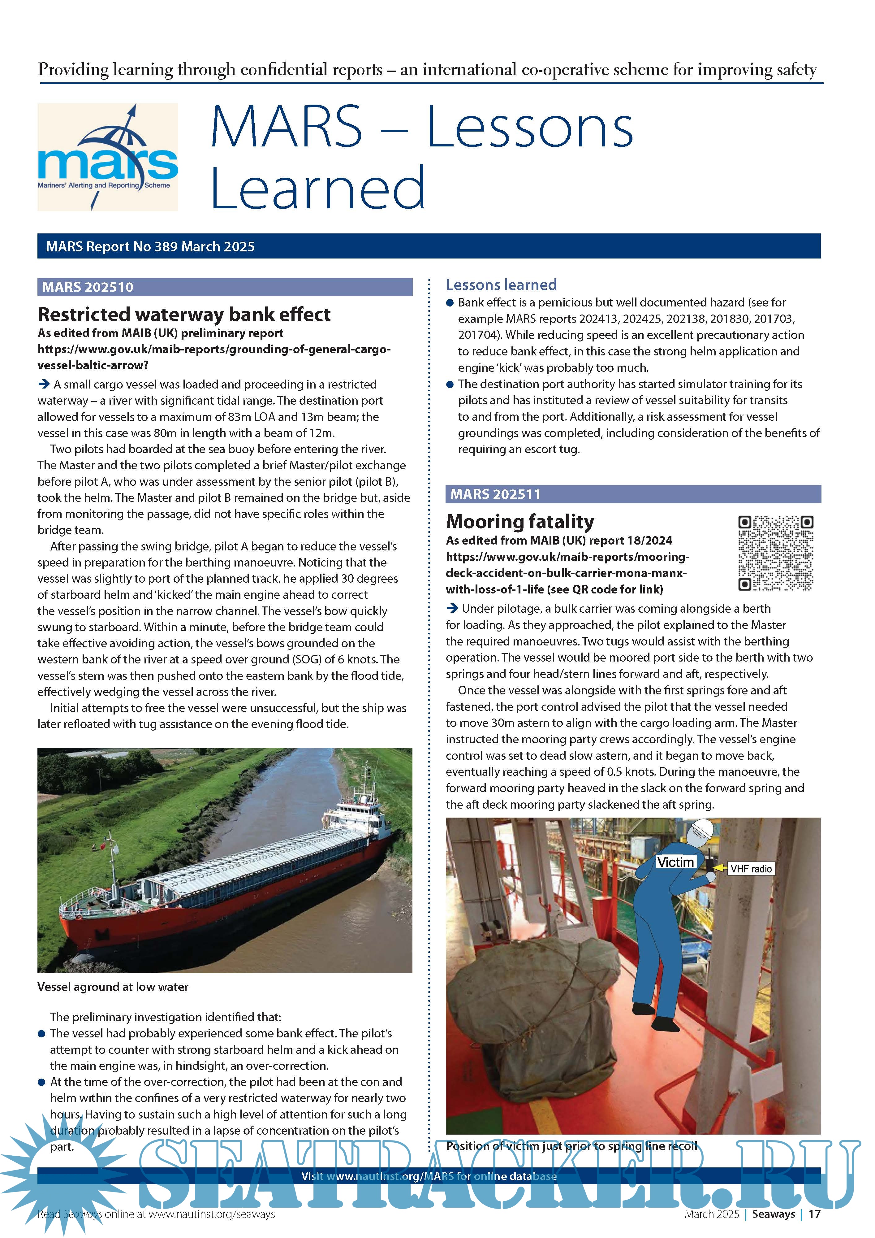 Year: The Nautica Language: English Author: The Nautical Institute Genre: Periodical publication Format: PDF Quality: eBook Pages count: 8 Description: Providing learning through confidential reports an international co-operative scheme for improving safety. MARS is a searchable database containing reports of accidents and near misses stretching back over a quarter of a century. Funded through the generous support of the Institute's Nautical Affiliate partners, it is one of the maritime industry's leading risk reduction initiatives and is helping to make life safer for seafarers everywhere