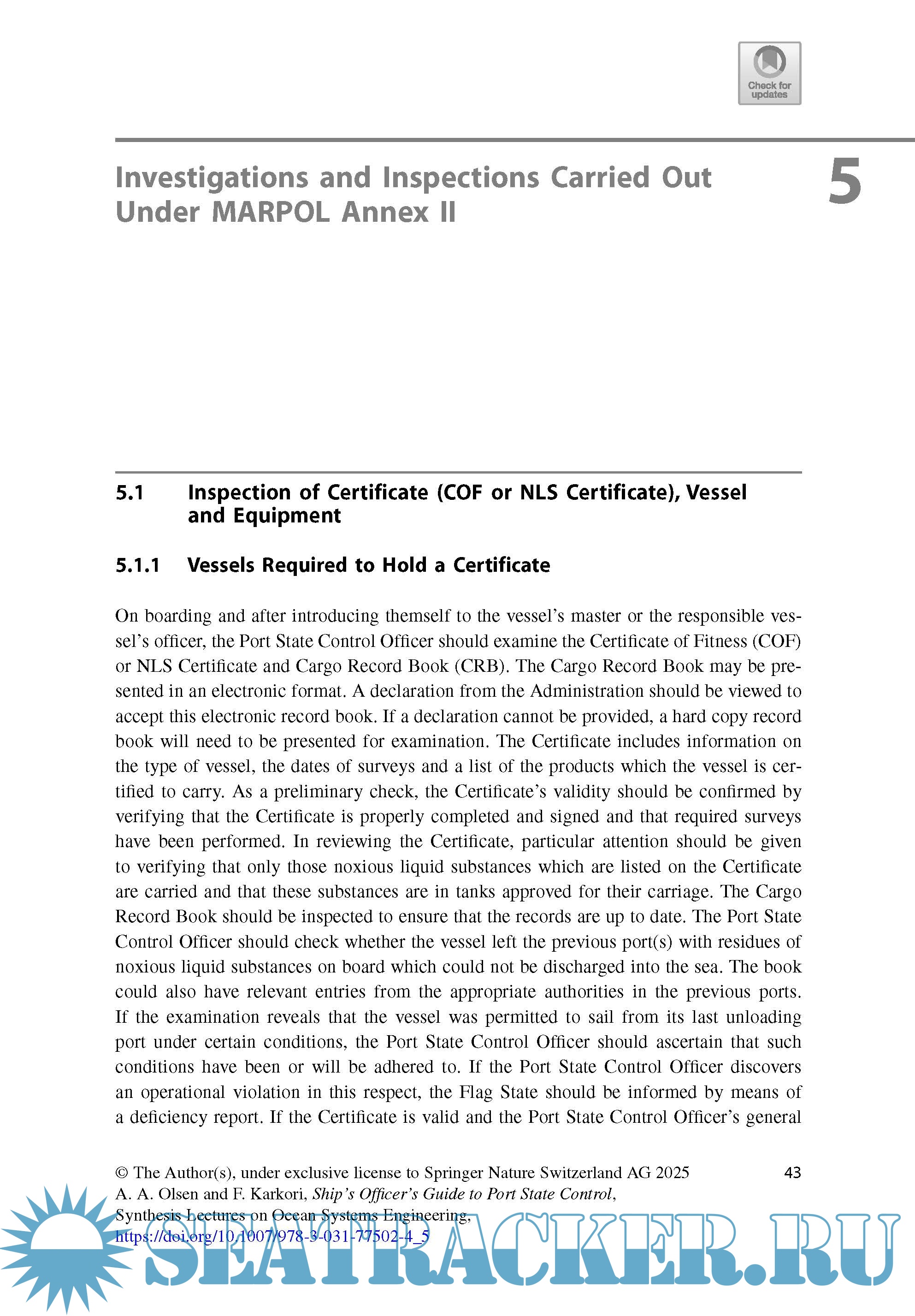 Year: 2025 Language: English Author: Alexander Olsen , Fidaa Karkori Genre: Guide, Textbook Publisher: Springer Edition: 1st (February 2025) ISBN: 978-3-031-77502-4 Format: PDF Quality: eBook Pages count: 143 Description: This book is a comprehensive guide to Port State Control (PSC) responsibilities and procedures, offering invaluable insights for maritime professionals. Through this book, readers will learn the intricacies of PSC inspections, contraventions, and detentions, as well as discharge requirements under MARPOL.The chapters cover topics such as the Port State Control regime, conduct of PSC officers, detention of vessels, and detailed inspections for vessel structural and equipment requirements. The authors provide an expert analysis of investigations and inspections under MARPOL Annexes I and II, control of operational requirements, and certification of seafarers. Particular attention is given to the ISM Code and PSC procedures related to LRIT.This essential resource is designed for engineers, maritime professionals, and students in merchant ship operations, maritime law, and port procedures. It offers a clear and unambiguous structure central to safety in safety-critical industries. Whether you are an academic or a practitioner in the field, this book will enhance your understanding of PSC responsibilities and procedures. - Comprehensive guide to Port State Control - Clear and unambiguous structure central to safety-critical industries - Particular attention is given to the ISM Code and PSC procedures related to LRIT