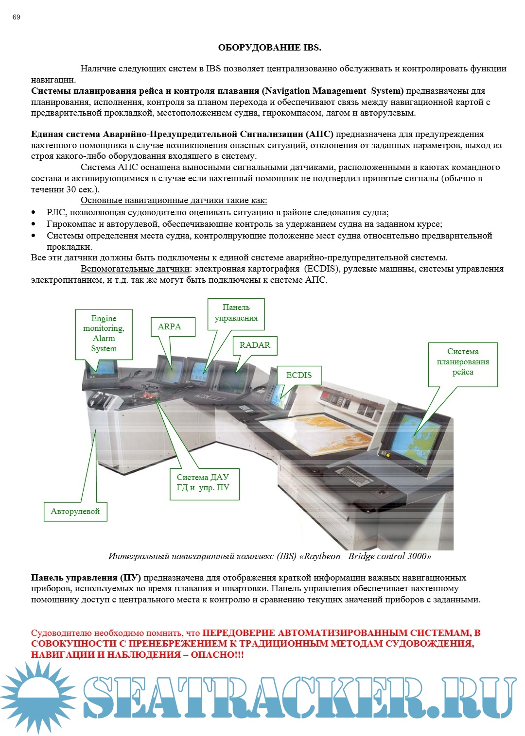 Программа курса выполняется на полнофункциональном навигационном тренажере, воспроизводящем как все навигационные и метеорологические условия, так и особенности поведения судов. Наличие средств связи способствует привитию навыков по организации связи, особенно в аварийных ситуациях. Планированию перехода, контролю за нахождением судна на выбранном (проложенном) маршруте, использованию технических средств судовождения посвящены отдельные разделы программы.