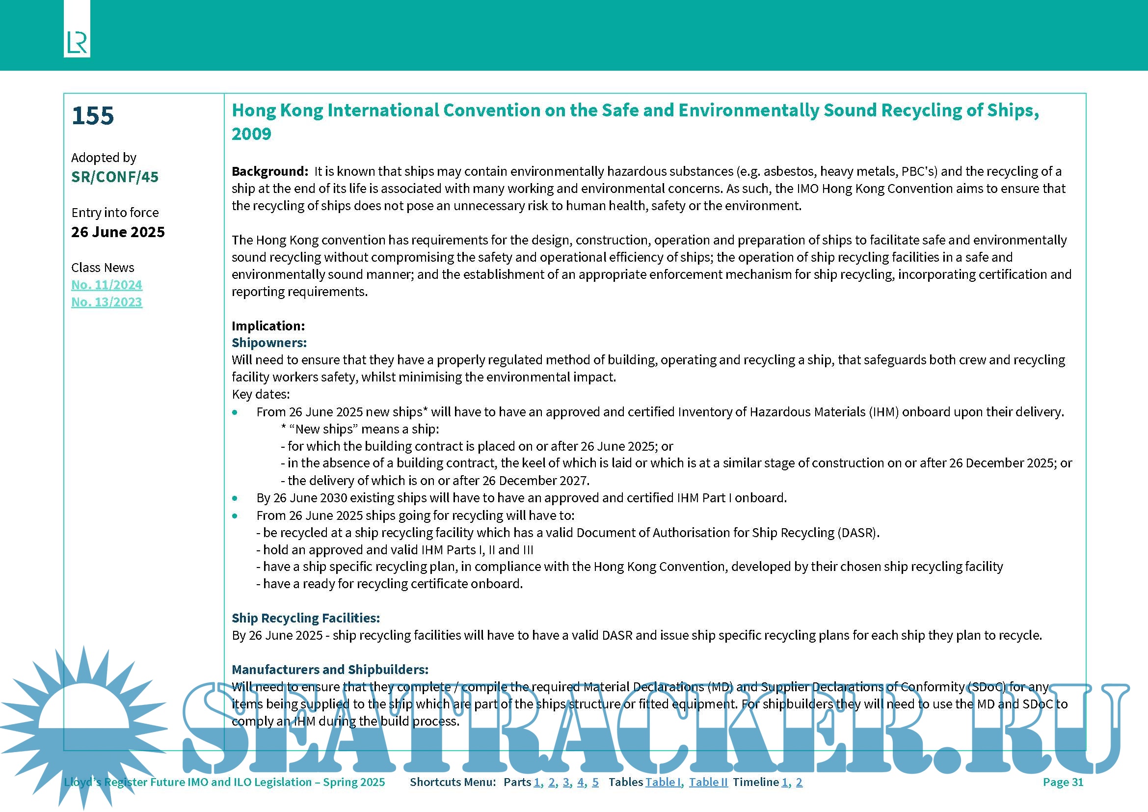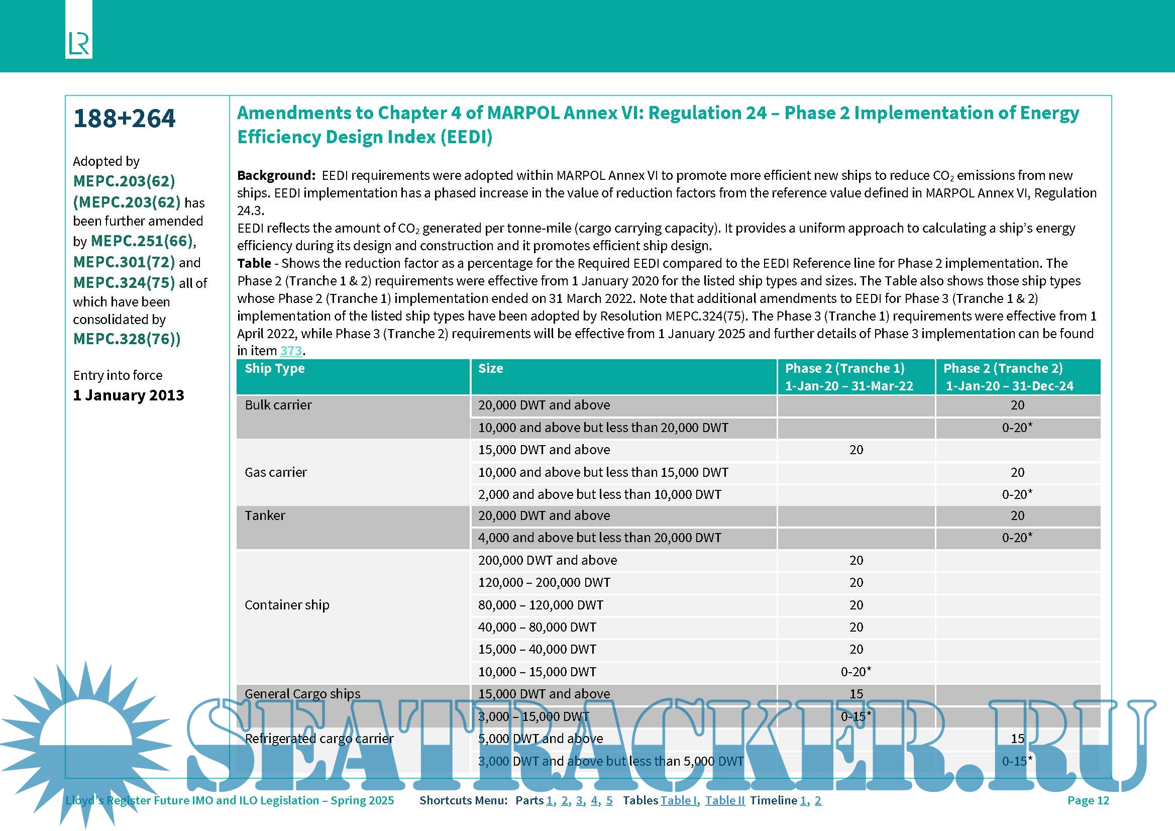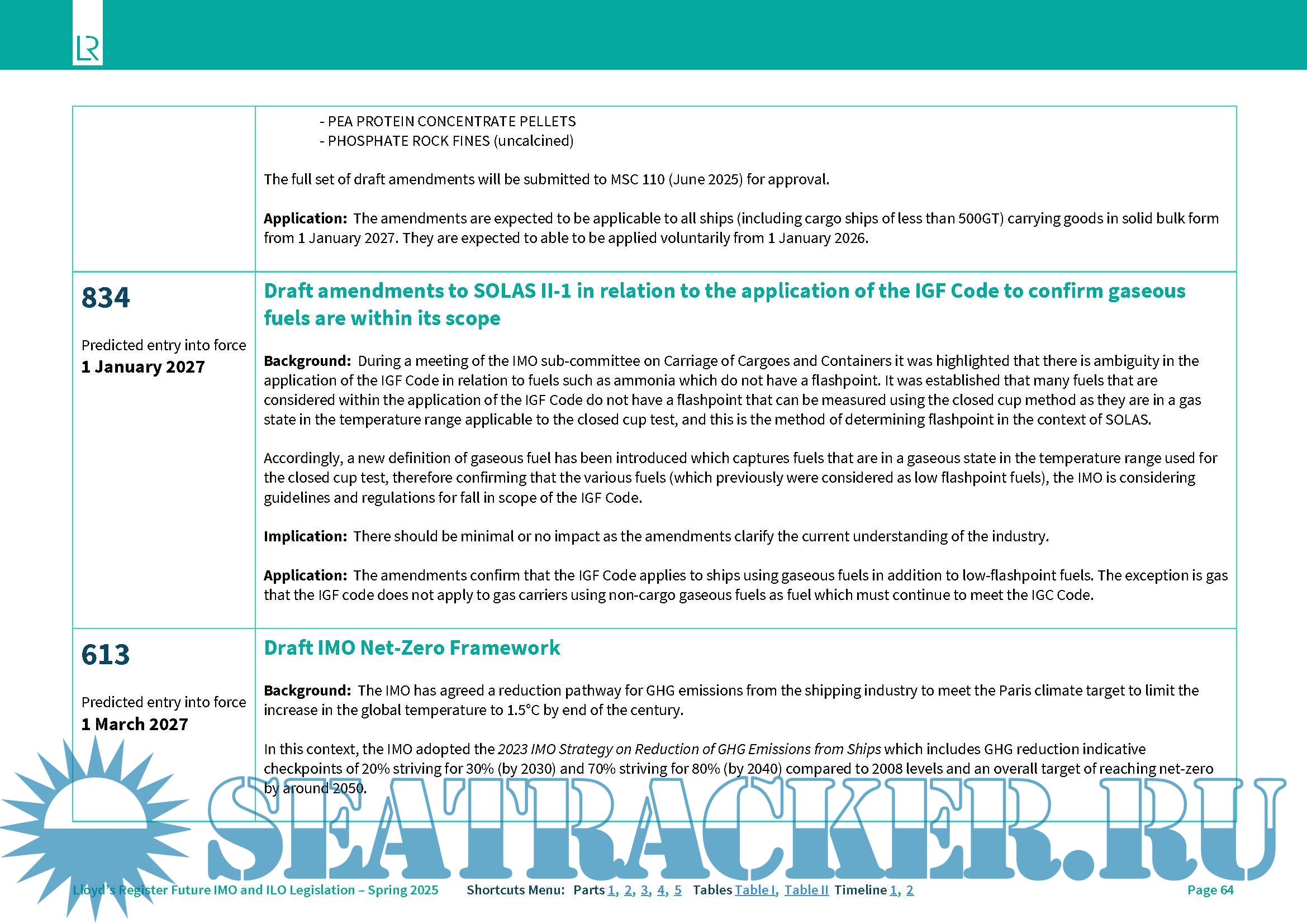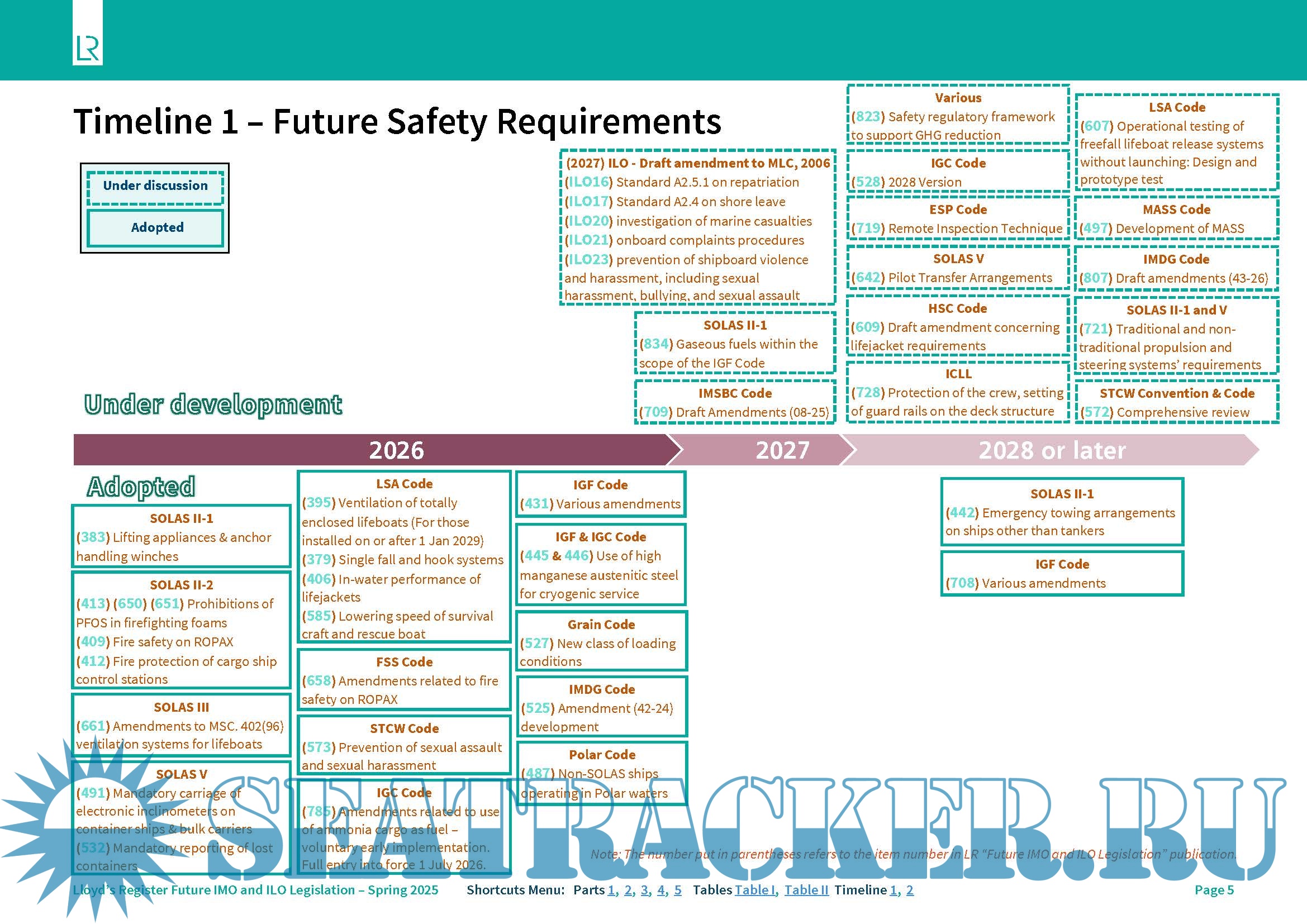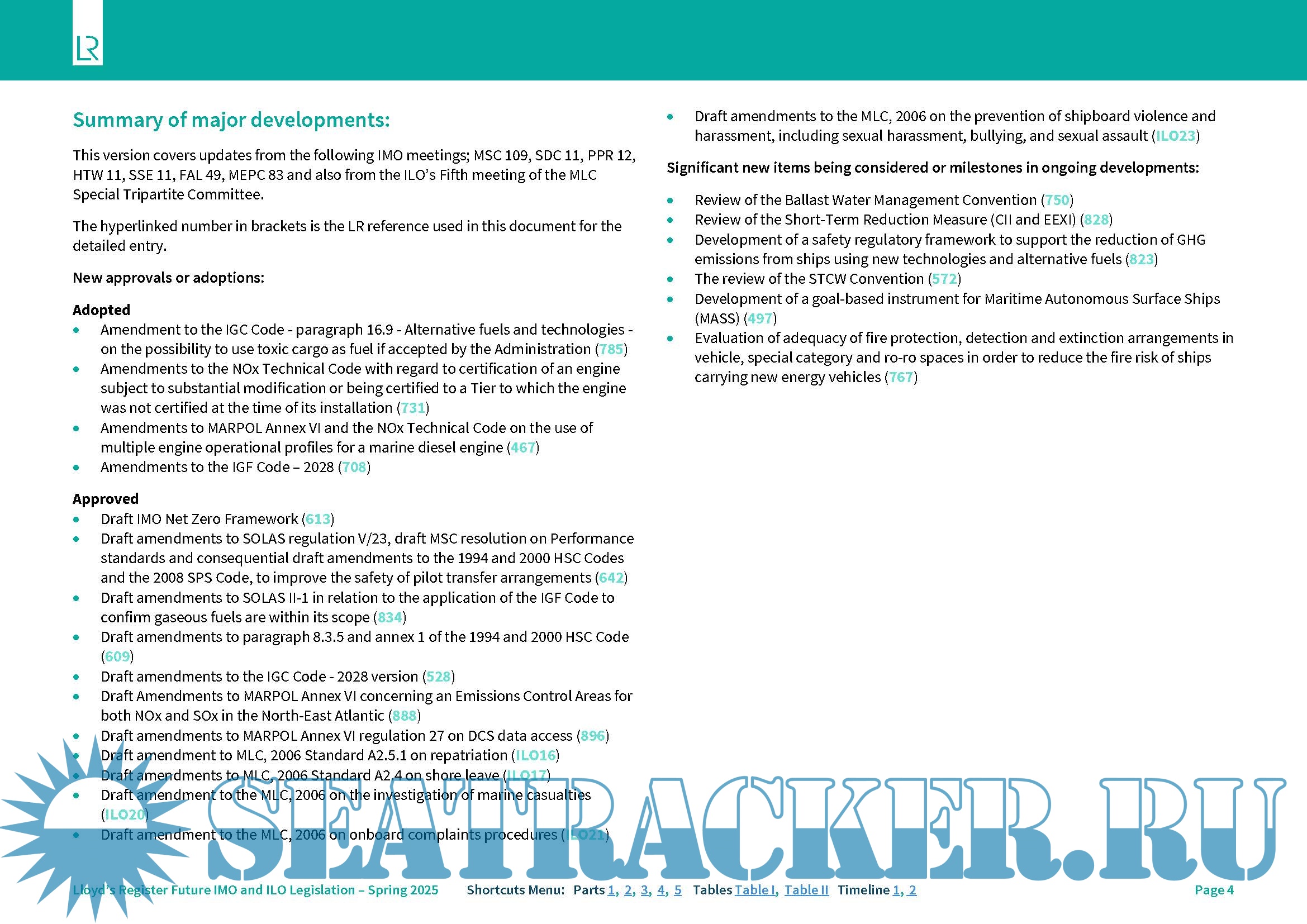 Year: 2025 Language: English Author: Lloyd's Register Genre: Textbook Publisher: Lloyd's Register Edition: Spring 2025 edition Format: PDF Quality: eBook Pages count: 102 Description: Future IMO and ILO Legislation Spring 2025 – Upcoming changes to mandatory statutory regulations and instruments. Including adopted amendments entering into force on or after 1 May 2025, requirements which have entered force but are phasing in for some ships, and significant developments up to and including the Marine Environment Protection Committee (MEPC 83) in April 2025. This version covers updates from the following IMO meetings; MSC 109, SDC 11, PPR 12, HTW 11, SSE 11, FAL 49, MEPC 83 and also from the ILO’s Fifth meeting of the MLC Special Tripartite Committee. The hyperlinked number in brackets is the LR reference used in this document for the detailed entry. :